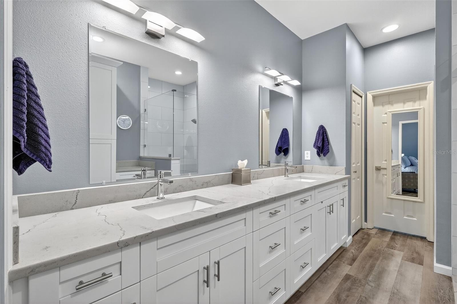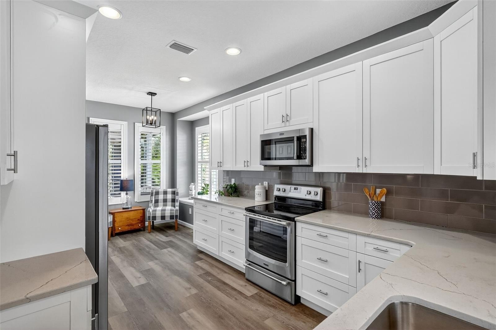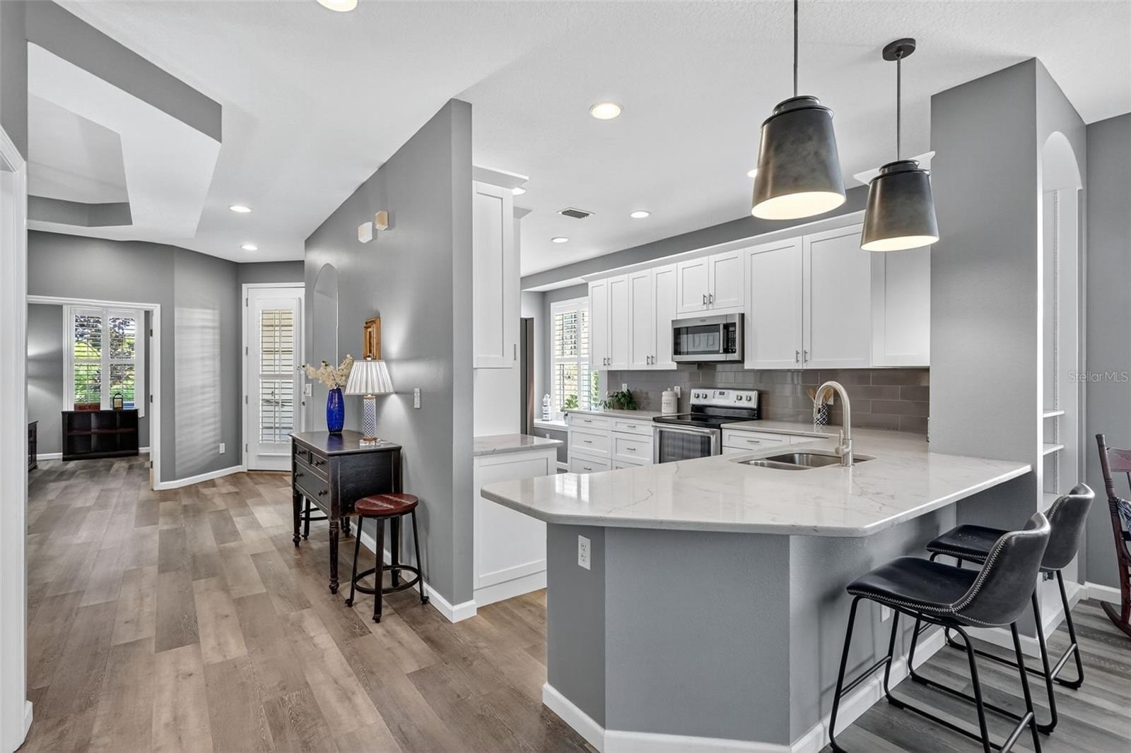 Welcome to your Coastal Community Paradise in Mirabay! This Fabulously Renovated Villa is Nestled between Lush Mangroves on a Canal at the front of the property, and a Serene Pond at the back of the property with Views from Both Patios! Enjoy Low Maintenance Living where The Landscaping & Lawn Care is Handled for you! This Truly Move-In Ready Home Offers Two Bedrooms, Two Full Bathrooms PLUS a Den/Office, in a very Open Floor Plan. No concerns with The Big-Ticket Items...They’ve Already Been Replaced! A New Roof (2023), A New AC System (both HVAC & Condensing Unit -2024), Water Heater & Water Softener (2021), Freshly Painted Interior (2020) & Newly Painted Exterior (2025)! From the moment you step inside, you’ll appreciate all the professionally completed High Quality Updates (2020-2022), Including Luxury Vinyl Flooring Throughout (Neutral & Easy to Maintain), A Delightful Kitchen that overlooks the Living Room and features Stunning Quartz Counters, Solid Wood Cabinets w/Crown Molding, Stainless Steel Appliances (all included), All New Decorative Hardware & Light Fixtures, a Breakfast Nook and Breakfast Bar. Both Bathrooms have also been recently renovated (2020-2022). Across from the Kitchen, you'll find a Laundry Room (Washer & Dryer also Included) with Built-In Cabinets, as well as a Spacious Dining Area with Tray Ceiling and can accommodate large dining set for bigger parties. The Roomy Primary Suite features a Double Tray Ceiling, and a Walk-In Closet with custom Built-in Shelving System. The Updated Primary Bath is adorned w/Quartz Counters, Solid Wood Cabinets, New Cabinet Hardware, Faucets, Light Fixtures, a Seamless Glass Shower w/New Tile, and A Built-In Storage Cabinet Unit that can also be used as a Wardrobe. Additional Updates include All New Light Fixtures throughout, New Ceiling Fans in Living Room, Both Bedrooms, Den (2020) & Covered Front Patio (2024), New Garage Door Opener (2022), New Doorknobs Throughout (2023), New Coach Lights (2025) and Plantation Shutters throughout. The Open Floor Plan in this home is Perfect for Entertaining, and the Split Bedroom plan provides privacy and a separate space for guests. This Home has Plenty of Windows that have pretty views and allow lots of natural light to flow through! Relax on your Back Lanai to watch the wildlife on the Pond OR enjoy a cup of coffee and a good book with a lovely view of the Conservation/Mangroves from your Screened Front Porch! Take advantage of all there is to do in Mirabay! Amenities include a Resort Style Pool w/ Water Slide, Zero Entry Wading/Swimming Pool, Lap Pool & Clubhouse w/Café, Fitness Center, Tennis & Pickleball Courts, Basketball Courts, Playgrounds, Kayak & Paddle Board use, Walking/Biking Trails and Plenty of Organized Events & Activities! Mirabay is conveniently located near area beaches, restaurants, shopping, banking, hospitals, and freeways for easy commute to Tampa, Sarasota and St Pete. Come make THIS HOME Your New Home in the Incredible Mirabay Community!