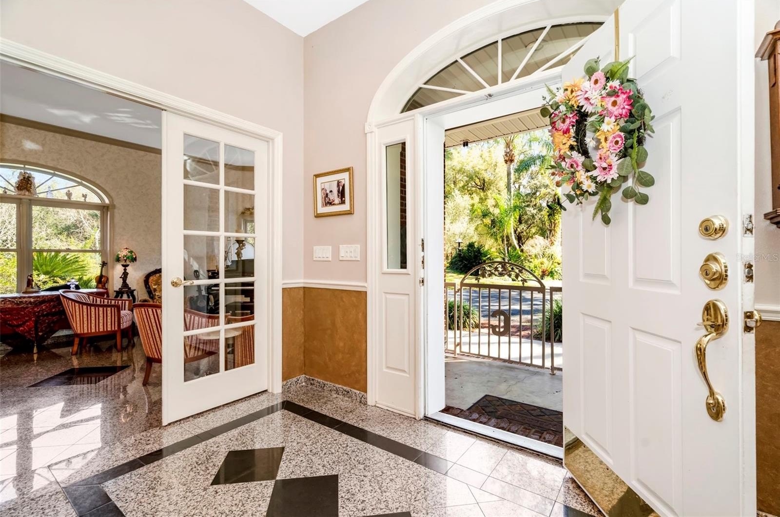 Recent luxury enhancements include newly installed engineered hardwood flooring throughout the upper level and fresh interior paint in elegant, neutral tones—offering a sophisticated and move-in-ready aesthetic. Step into a world where charming country living meets stately European elegance in this custom-built masterpiece. This extraordinary residence, perched on 8.4 acres with the option to acquire an additional 3.3-acre parcel, offers a lifestyle of unparalleled grandeur. The approach to this estate is like stepping onto the set of a classic movie. A tree-lined paved driveway leads to an ornate iron fence adorned with statues & a private electric gate gracefully opens to reveal a circular driveway. Your gaze is immediately captured by the two-story brick colonial-style home with a wrap-around porch & ornate tin-lined roof peaks. Upon crossing the threshold of the elegant lead glass door entrance, Italian marble floors guide you through a grand foyer illuminated by dazzling lights from the chandelier cascading over a circular staircase. This 5-bedroom, 4.5-bath residence spans 4,555 sq ft & boasts a party-sized outdoor area designed for entertaining. A saltwater system pool with electric heat, rock waterfall, & a slide beckon outdoor enjoyment. The porch, extending across the entire back and side of the home, offers breathtaking views for miles. The main level features a spacious master suite with a walk-in closet, upgraded marble-lined jetted tub & double vanity sinks. Main level also includes an oversized office with a closet, a separate formal dining & living room area, a half bath, a family room with a gas wood-log fireplace, a breakfast nook & a gas cooktop in the island kitchen. Additional amenities include a reverse osmosis filter to sink/refrigerator, pantry/wine cellar closet, an oversized laundry room with a sink & pool bath. The oversized side-entry 2-car garage (28 x 24) with a second-story game room above offers versatile space suitable for in-laws, guests, a she-shed, a man cave, or even a trendy speakeasy. Ascend the spectacular circular staircase to discover an additional master suite with a private bath, two guest rooms (one with a built-in vanity and sink) & another versatile room perfect for a playroom, office/den, or additional bedroom. A second guest bathroom completes the upper level. For the outdoor enthusiast, a barn with a 5-ft slab provides storage for farm equipment, along with chicken coops & three horse stall areas. The entire parcel is fenced with a combination of barbed wire & field fence, creating a haven for grazing cows & a donkey. The property showcases the horticultural expertise of Mrs. Green Thumb, with an abundance of citrus, herb, and vegetable garden varieties. A transferable termite policy adds peace of mind. As a modern touch, a 2021 gas generator with an owned propane tank ensures an uninterrupted power supply. New roof installed 2023. This property is not just a home; it's a legacy, meticulously crafted for those who appreciate the finer things in life. Welcome to a residence where every detail reflects the artistry of fine living.