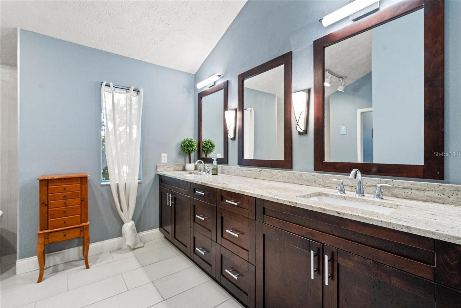 The modern kitchen is designed for gathering and everyday ease, offering stainless steel appliances including a double range, wood cabinetry, a beverage station, granite countertops, a breakfast bar, and a light-filled eat-in nook overlooking the lanai. The expansive primary bedroom features warm wood flooring and a sitting area framed by bay windows. The powder room located downstairs is completely updated and ready for your guests. The spa-inspired primary bathroom includes a freestanding soaking tub and a spacious walk-in closet—ideal for unwinding after a day on the golf course. The upstairs Jack-and-Jill bathroom with granite counters connects the hallway to the versatile 4th bedroom, currently used as an office, which also features a unique storage loft accessible by a spiral staircase. The laundry closet is conveniently located in the upstairs hallway adjacent to all the bedrooms.
