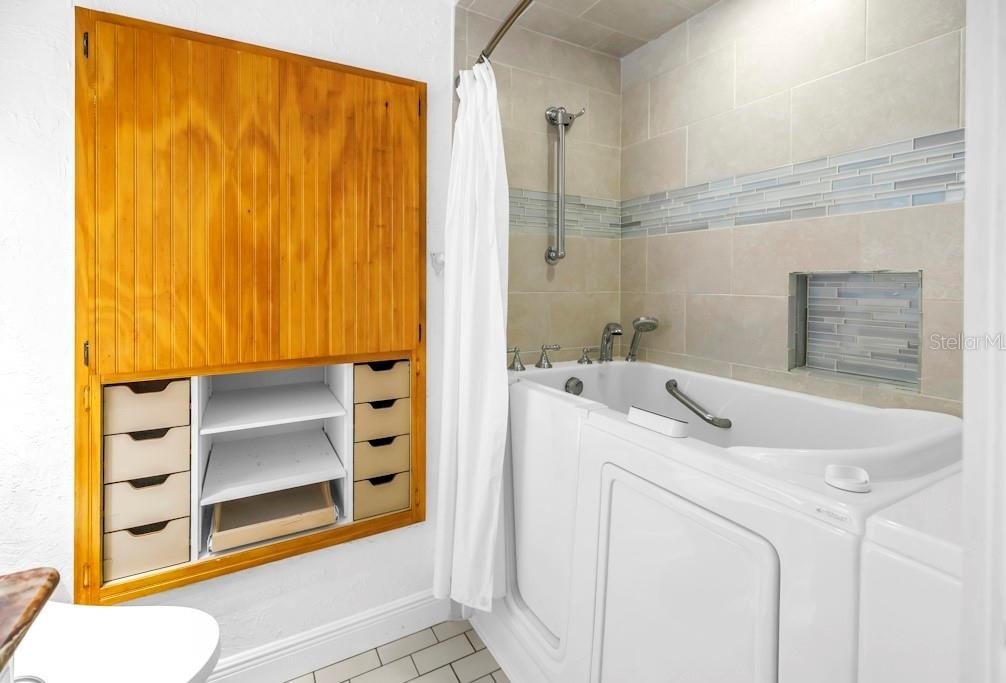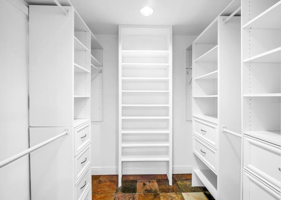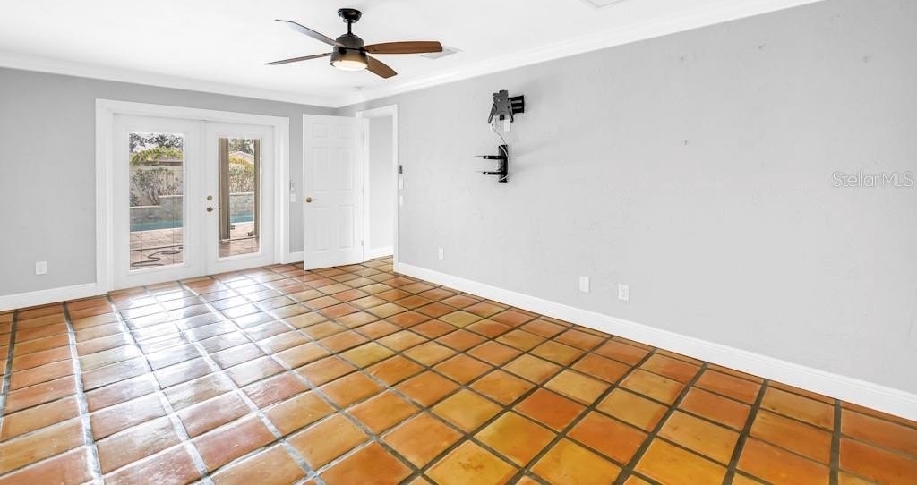 The luxurious main suite offers direct access to the lanai and pool, along with a spa-inspired bath featuring shower jets, warming towel racks, a stunning double-sink vanity, and an expansive custom closet. The second bath, complete with a walk-in tub/shower, blends comfort with sophistication.