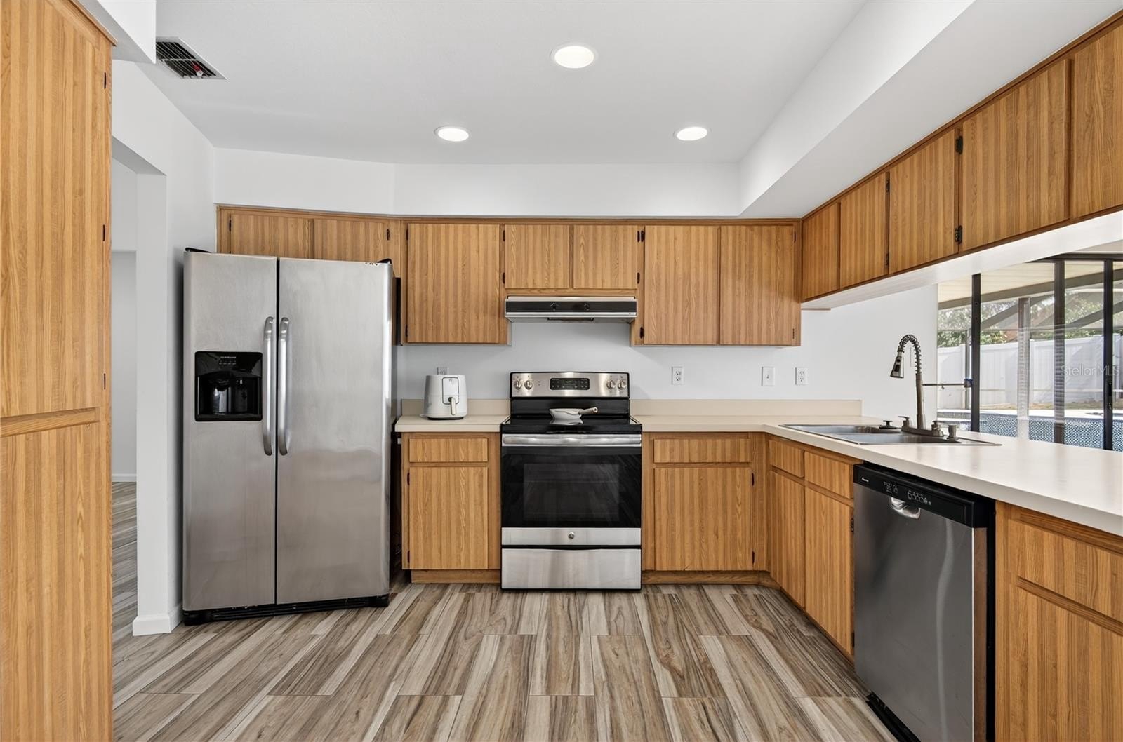 Everything is Upgraded and Ready for a New Owner. (NEW A/C, NEW WATER HEATER, NEW ROOF, NEW POOL PUMP, NEW POOL MARCITE, NEW BATHROOMS)...... This is the Rutenburg Floor Plan that Everyone Loves. Formal Living Room, Formal Dining Room, Large Kitchen w/Breakfast Nook, Eat-In space In the Kitchen, As Well. Huge (25' x 20') Family Room . Interior Laundry Room. Split Bedroom Plan. & a Caged Pool. Walking up you'll notice the New Roof, Fresh Painted Exterior and Beautiful Manicured yard. Enter thru the New Custom Front Door with side Lites, directly ahead is the Formal Living Room that has access to the Caged Pool thru then Double Sliders, NEW WOOD GRAIN, CERAMIC TILE Flooring thru out the whole Home. Freshly Painted interior including ceilings. This Livingrm adjoins a Formal Dining Room, large enough for 10 seater Dining. The Kitchen is Grand as well, with Dinette Area Eat-In-Kitcxhen Area to boot, a Braekfastnook w/ Bar Seating that adjoins the Huge 20' x 25' Family Room. Newer Stailess Steel Dishwasher, Range and Side by Side Refrigerator with Water/Ice on the Door. Family Room has Catherdreal Ceilings, A Wood Burning Fireplace to Set off a Romantic Evening. This Room also has 2 sets of Double Sliders(4 Total) out to the Caged Pool. The Primary Bedroom is Large as well with a walk-in closet and Double sliders out to the Caged Pool. Primary Bath starts with a seperate Vanity Area. A second Vanity is in the Actual Bathroom with Tub & Shower. All Recently Remodeled. Off the Primary Bedrm is adjoining Room that could be an Office/Baby-Room/Guest Room or 4th Bedroom This is the Home/Floor Plan that can accommodate a Large Family and Gives the seperation that everyone loves. Interior Laundry Room with Washer & Dryer included. To the Pool Area has a 14 x 30' Covered Portion that Extends to a Caged Pool. Y'llou Notice the Freshly Painted Cool Deck, Pool and was recently Re-Marcited and the Screens have all be Replaced. It even has a Spa with a Waterfall to the Pool. THE CURRENT FAMILY HAS BEEN RAISED AND GROWN. (EMPTY NEST) All have moved on. This hame has been Updated and Ready for the Next Family to Enjoy. Vacant. Owner sez SELL IT!!! Fresh, Clean, Ready. ....IT'S READY FOR A NEW OWNER. Get $10,000 ASSISTANCE thru The State of Florida Bond Money Program...FREE !!!!! NEW, New New will give you Years of Enjoyment with out any Hassells. ANY REASONABLE REQUEST WILL BE CONSIDERED ! Owner has Contractor Experience and has made sure it's ready. YOU'VE GO TO TO SEE THIS ONE!!!!! CALL RON DIRECTLY. VACANT...... iT WON'T DISSAPPOINT. Seller has a Good understanding of Buyer's Needs. IT'S READY. DON'T MISS THIS ONE !
