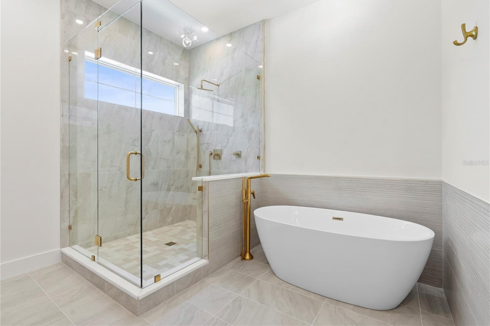 The spa-like primary suite offers a true retreat with a walk-in shower, standalone soaking tub, and an expansive walk-in closet.