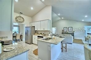 The living area transitions seamlessly into a modern kitchen with a breakfast nook, pantry, and abundant counter space. Vaulted ceilings in the open living room create an airy atmosphere with stunning backyard views offering endless possibilities, including space for a future pool, outdoor entertaining, or play areas.