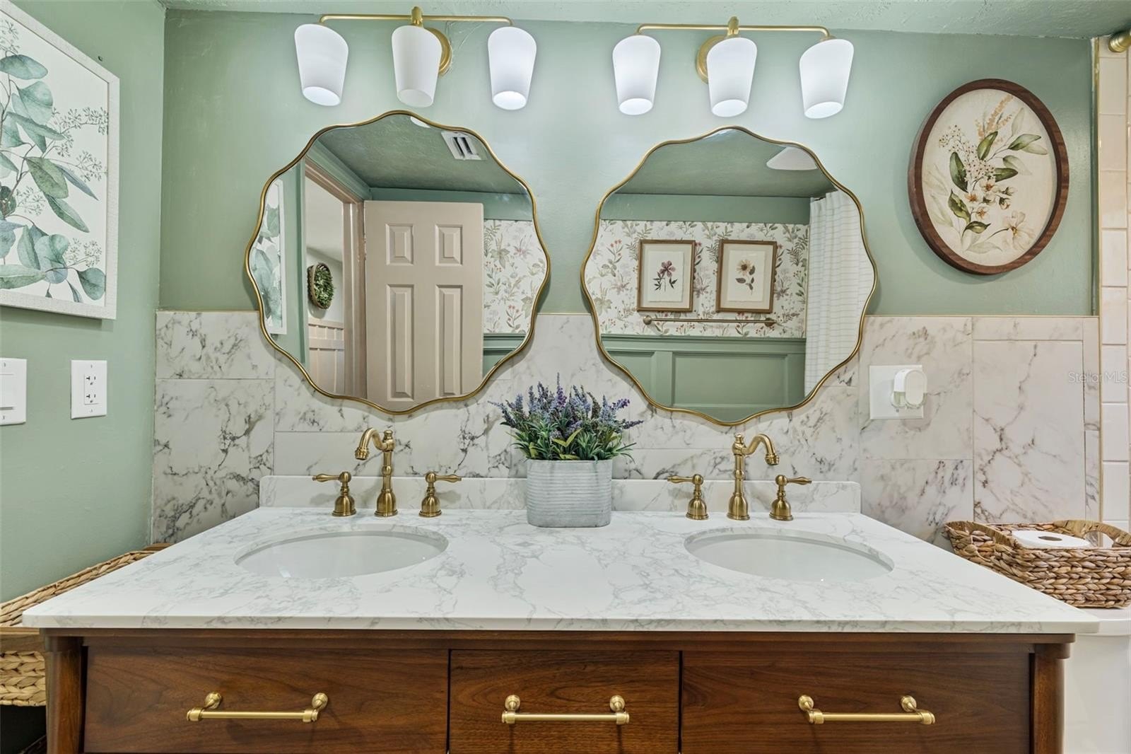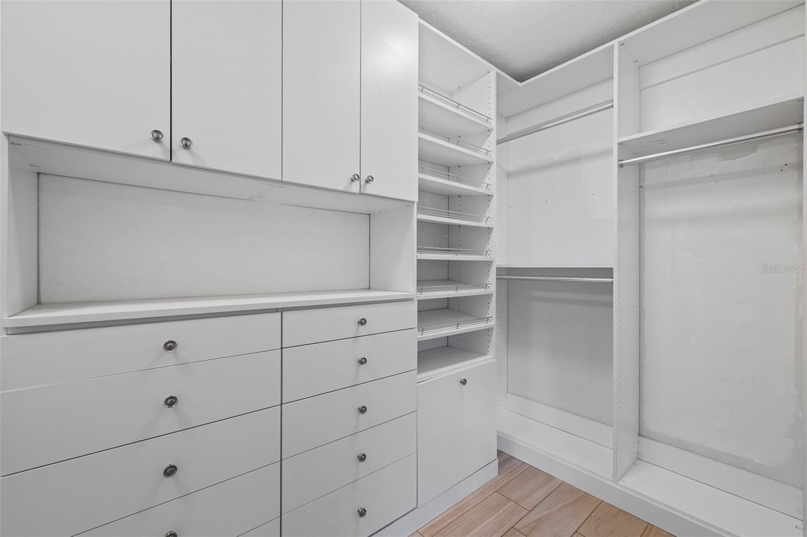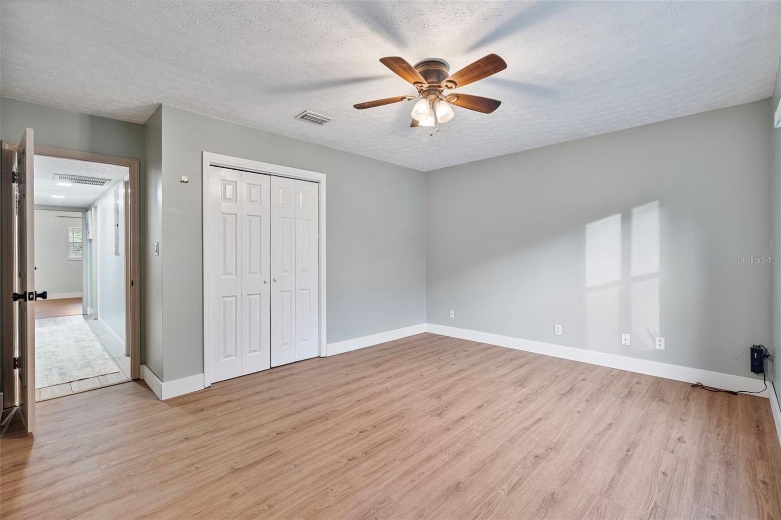 The primary suite includes a huge custom closet and an en suite bathroom with double vanities. The three secondary bedrooms are all generously sized; two have new vinyl flooring where carpet was recently removed. The second bathroom has been remodeled with a double vanity and a ceramic tile shower.