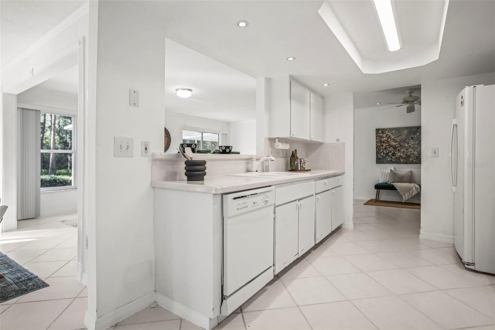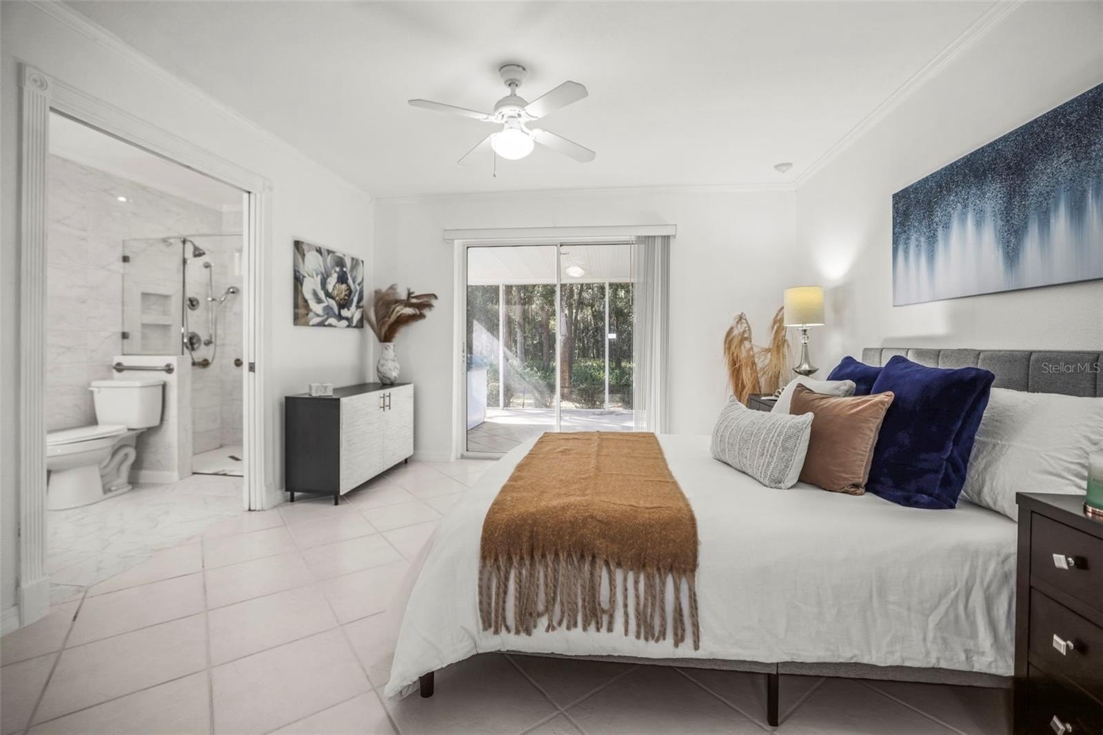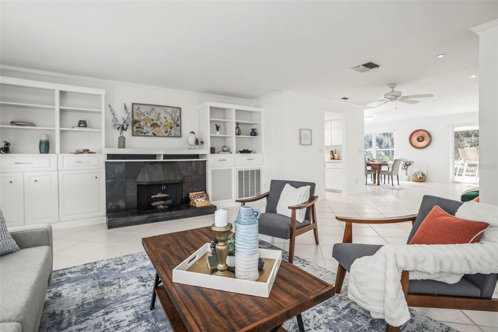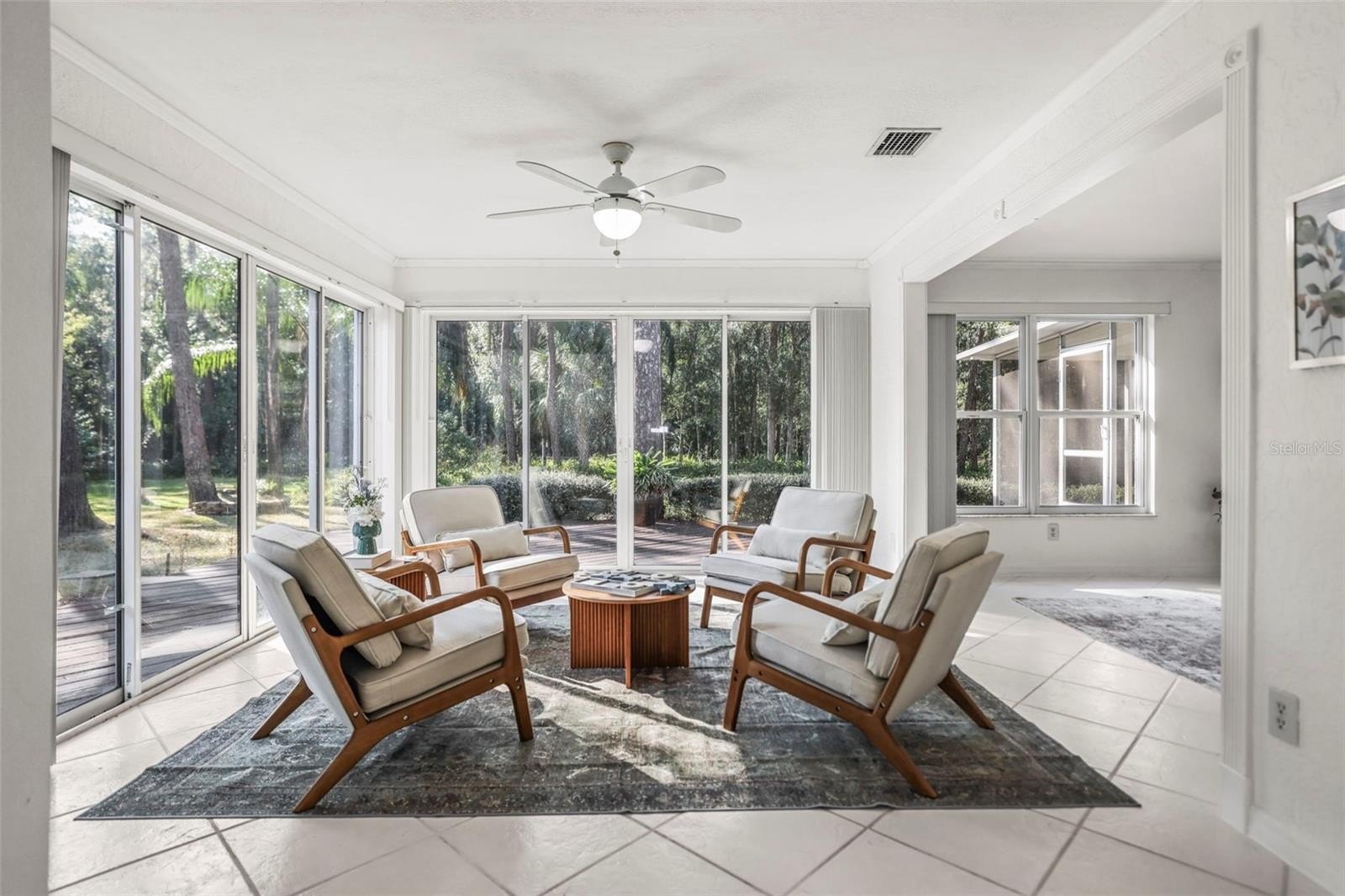 Inside, the home features tile flooring throughout, crown molding, and a cozy fireplace that anchors the main living area. The spacious layout includes a large eat-in kitchen and multiple living and dining spaces filled with natural light. Four sets of sliding glass doors—from the kitchen, dining area, and primary bedroom—open to peaceful garden and wooded views, seamlessly blending indoor and outdoor living.