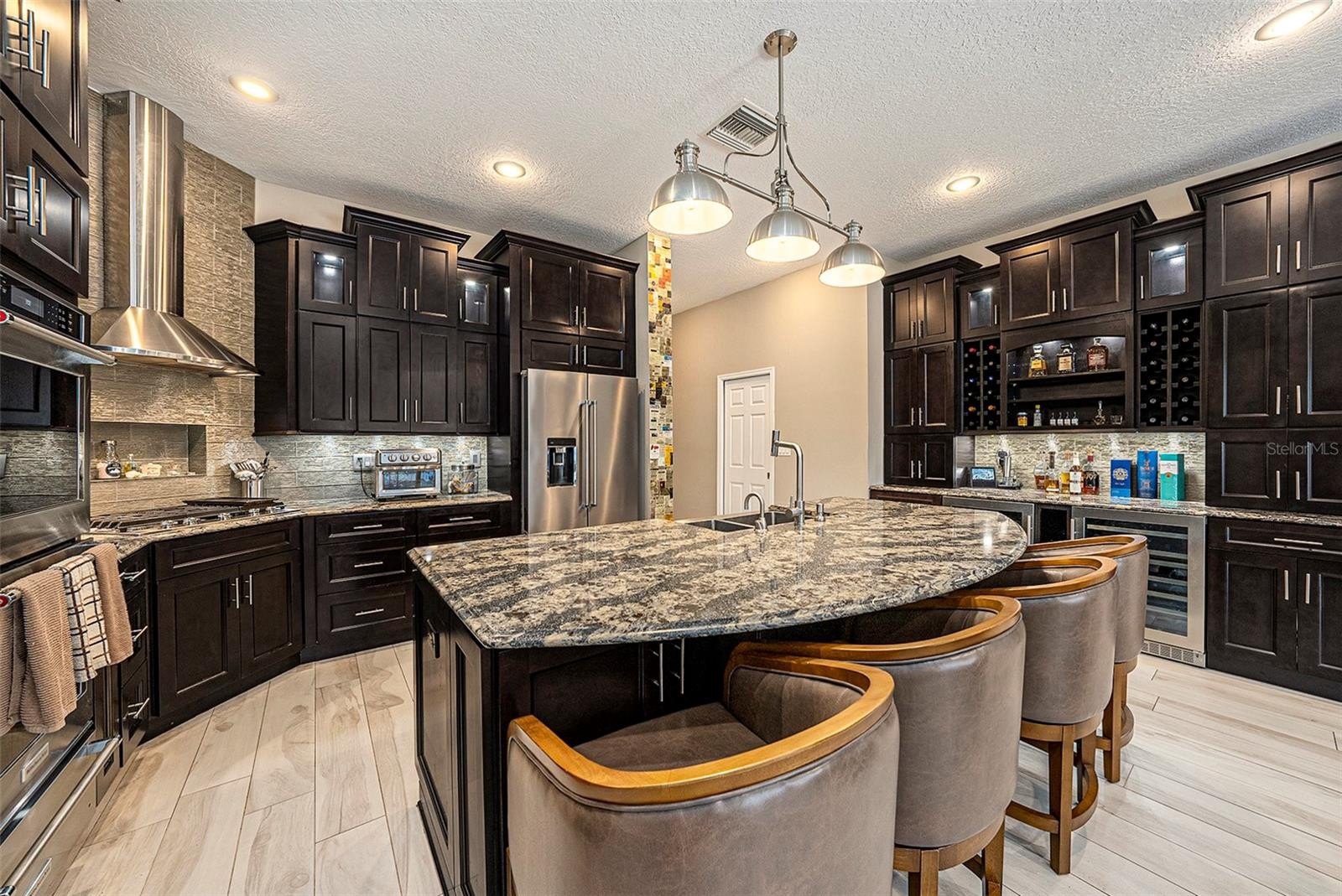 At the heart of the home is a stunning gourmet kitchen designed for both everyday living and effortless entertaining. This beautifully appointed space features custom soft-close cabinetry, Cambria quartz countertops, and a large center island that doubles as a breakfast bar, complete with additional cabinetry for extra storage. The kitchen is equipped with double stainless-steel sinks and an impressive suite of built-in appliances, including double ovens with a warming drawer, a convection oven, microwave, dishwasher, garbage disposal, and a convenient hot water dispenser. Adjacent to the kitchen, the elegant bar area elevates your entertaining experience with two bar refrigerators, abundant cabinetry, and built-in wine racks, perfect for hosting gatherings or enjoying a quiet evening at home.