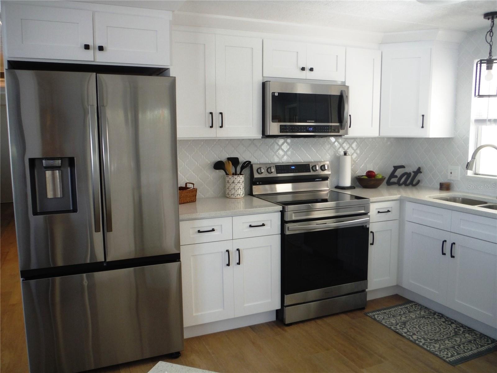 Beautifully renovated 2 bedroom 2 bath with subfloors redone 2024 and luxury vinyl floors. Kitchen is now very modern and has appliances installed in May 2024 - even has a wine fridge, soft close drawers, quartz countertops. Fully furnished - move right in. Mattresses were new in May 2024. Vapor barrier with a transferable warranty was installed Sept 2024. New water heater in Dec 2025. Great room plan is super - really open floorplan. Baths were remodeled. Both have showers and are gorgeous. This is a 55+ community and this home allows you to bring your sweet little furry cat. The deeded lot 50X80 is included in the price and is in a no flood zone. Maintenance fee is $223/Month and includes water, sewer, trash, lawn, private roads, laundryroom (in case your appliances break), clubhouse, heated pool & spa, and shuffleboard. You will be very impressed with this friendly community with little lake, winding roads, & huge trees. Room measurements approximate.
