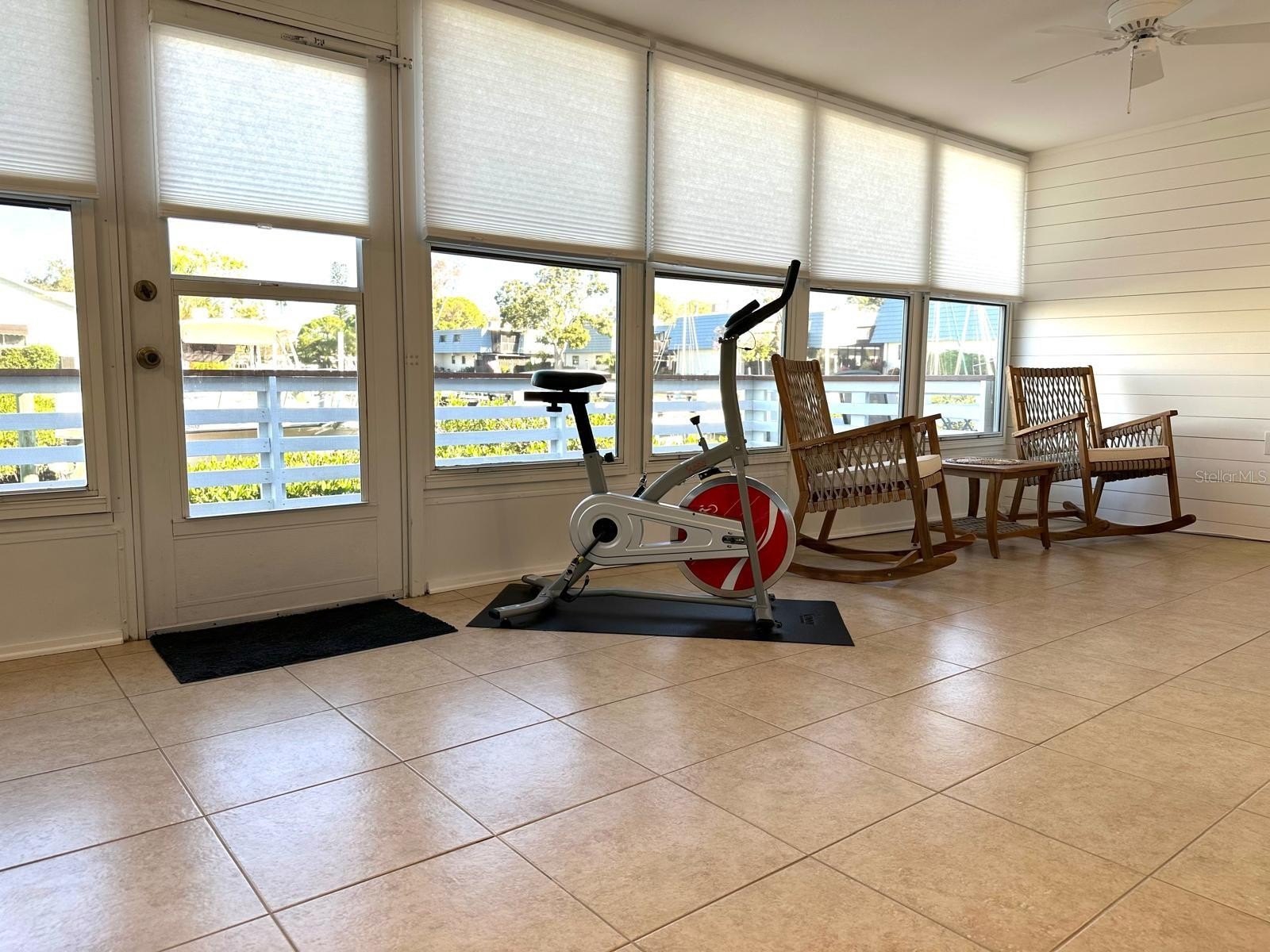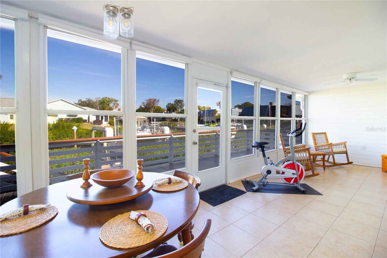 One of the standout features of the home is the heated and cooled sunroom, surrounded by windows and filled with natural light. This flexible space can be enjoyed year-round thanks to its connection to central air, yet also provides a sliding door to privately close it off when desired. From the sunroom, two doors lead directly onto the wood deck overlooking the peaceful saltwater canal lined with mangroves—a perfect spot for morning coffee, reading, or entertaining friends after a day on the boat.