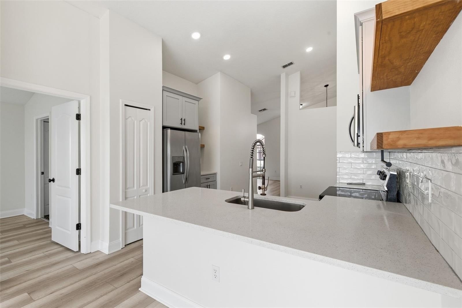 You enter into an open floor plan with high ceilings and new LVP flooring flowing throughout. The chef’s kitchen shines with quartz countertops and modern cabinetry. Both bathrooms have been fully redesigned with upscale, designer finishes. Inside and outside are freshly painted for a clean, crisp feel. Major systems give you peace of mind: roof replaced in 2021, newer HVAC, and recent updates throughout. The FULLY FENCED backyard backs up to a large pond offering a peaceful water view and extra privacy. This home sits on a generous lot in a well kept neighborhood. Low HOA fee OF $350 a YEAR adds value. Easy access to I-275 means commutes and travel stay simple. You get a blend of style, comfort, and location. Homes this updated with a pond view do not come up often. Schedule your showing today.