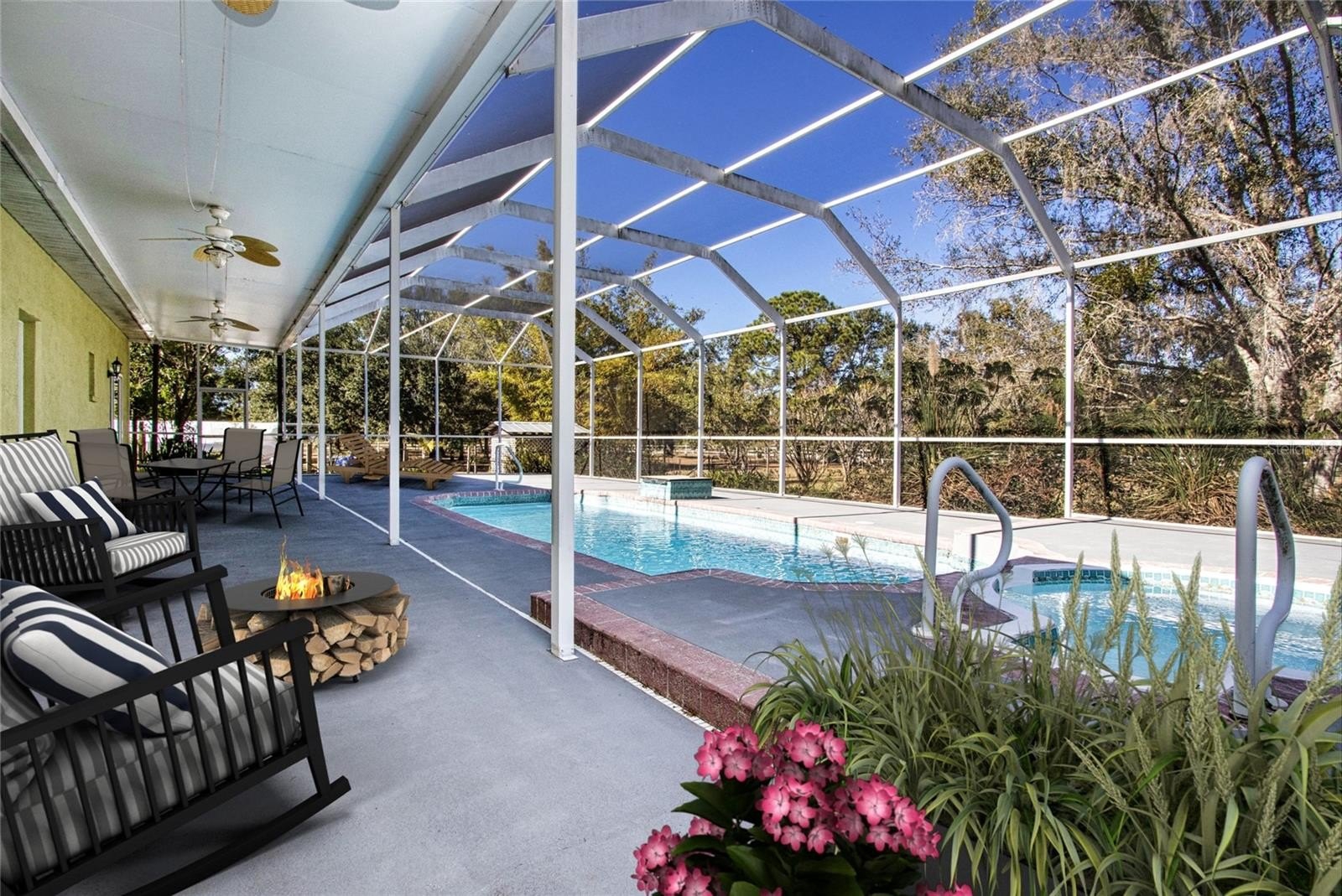 One or more photo(s) has been virtually staged. Experience the best of Florida living in Sundance Trails in this spacious 3,000-square-foot home featuring three bedrooms, three and a half bathrooms, a pool, and a three-car garage. The property sits on 1.57 acres, with an extra 1.57-acre vacant parcel also available. This residence offers a warm and inviting atmosphere, featuring travertine flooring throughout. Spacious enough to accommodate multi-generational living. The first floor includes a primary bedroom with a generous walk-in closet and an ensuite bathroom equipped with a soaking tub, separate stand-alone shower, and a private water closet. Additionally, the formal dining room may be conveniently converted into an office or a fourth bedroom. The second bedroom on the first floor features sliding doors that open to the sparkling pool and include its own ensuite bathroom. The third bedroom offers a private living space and another ensuite bathroom, making it ideal for multi-generational living, an entertainment room, or simply relaxing. This area also boasts an enclosed porch with views of conservation. The kitchen features an open-concept design with breakfast bars on both sides. It is equipped with stainless steel appliances and laminate countertops, which provide direct access to the laundry room and a three-car garage. Adjacent to the kitchen is the living room and office nook, which provide access to the second bedroom. Here, you'll find sliding doors that open to the sparkling screened-in pool and spa, overlooking the spacious backyard. The second parcel can be purchased with the home. It is split with its own parcel number that can be adjoined at closing or kept separate. Sundance Trails has a low and relaxed HOA and this home is across the street from the Little manatee State Park that offers hiking, biking, kayaking, horseback riding with camping and stalls for camping with your horses and still only 15 minutes to Parrish and Sun City Center and I-75 and I-275 for easy commute to the tri county area. Don’t let this opportunity pass you by, schedule a private showing today!