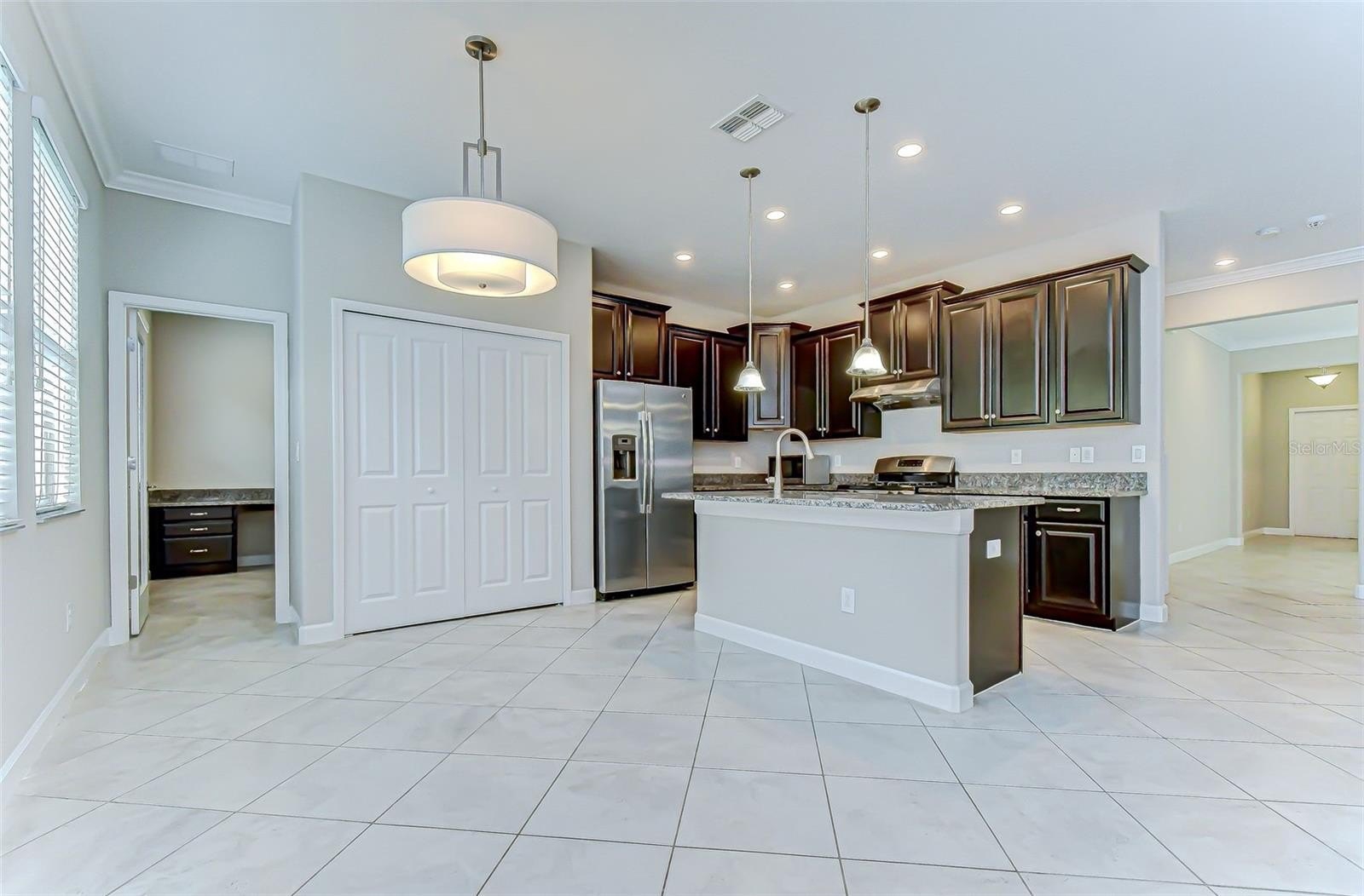 Built in 2018, the home now features new INTERIOR and EXTERIOR PAINT (including garage 2025) NEW GARAGE FLOOR (2025)and new vinyl flooring on the first floor, giving the property a fresh, updated look. The main level offers an open layout with a formal dining room, family room, breakfast nook, and a private office off the kitchen. The kitchen is equipped with 42" espresso cabinets, granite countertops, a center island, stainless steel appliances, and gas cooking. A guest bedroom and full bath are conveniently located on the first floor.