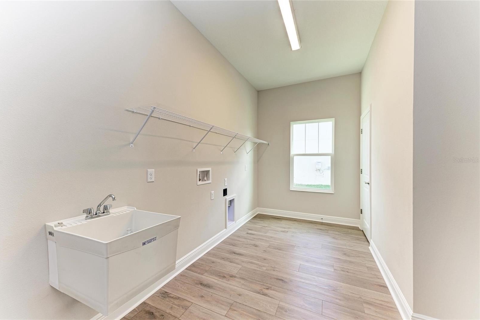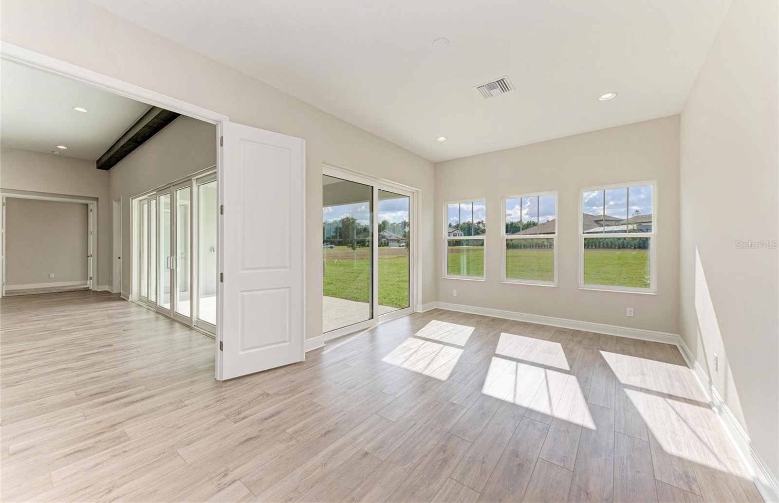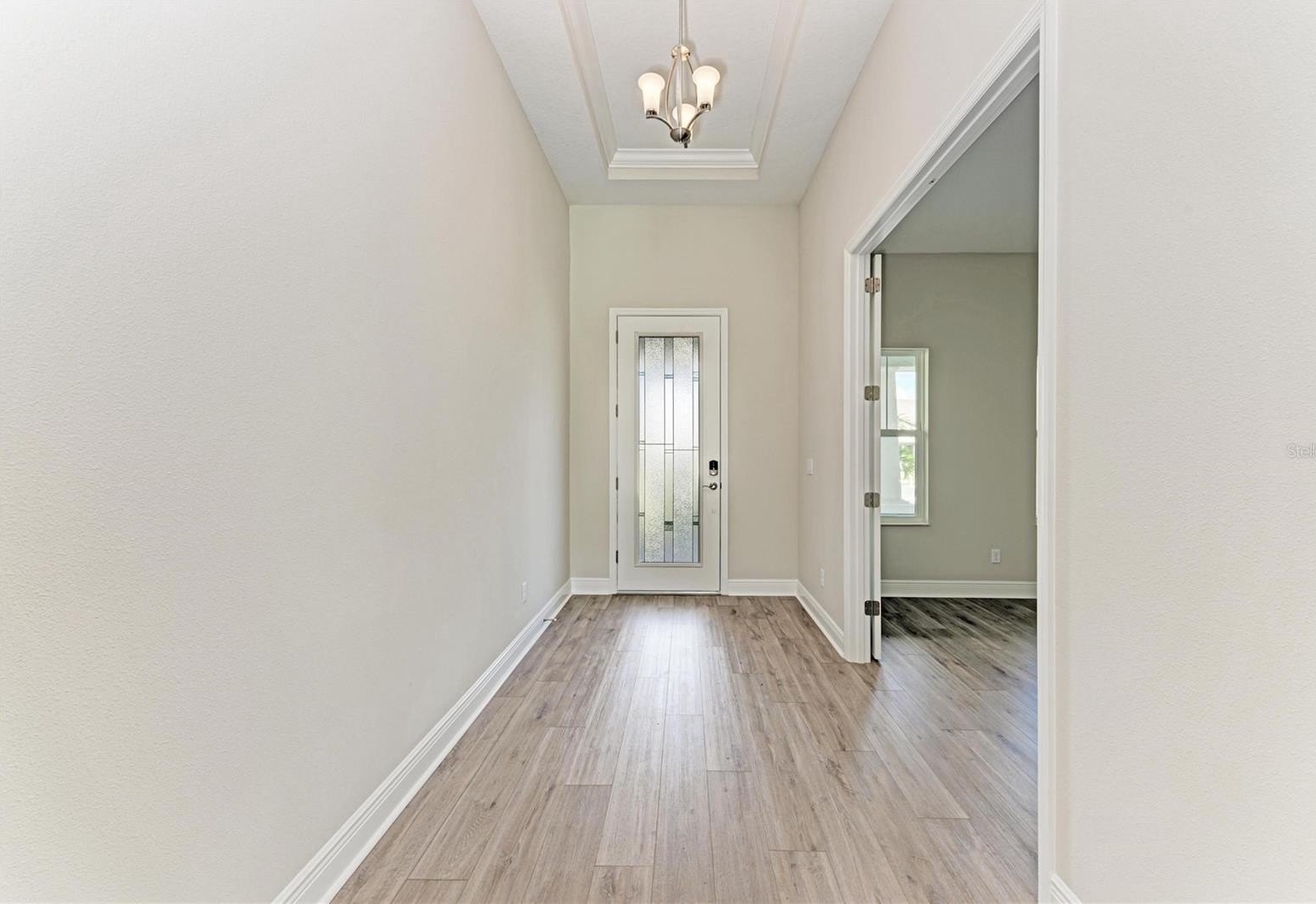 Inside, the common living areas, including the extended foyer, den, grand room, and kitchen with its large central island, all feature impressive twelve foot ceilings. The kitchen is beautifully appointed with Sonoma Linen cabinets and Frost Whte MSI Quartz countertops, complemented by Pride Plus LVP flooring that runs throughout the main living spaces. A versatile dining room is ready for both elegant dinner parties and relaxed family meals.