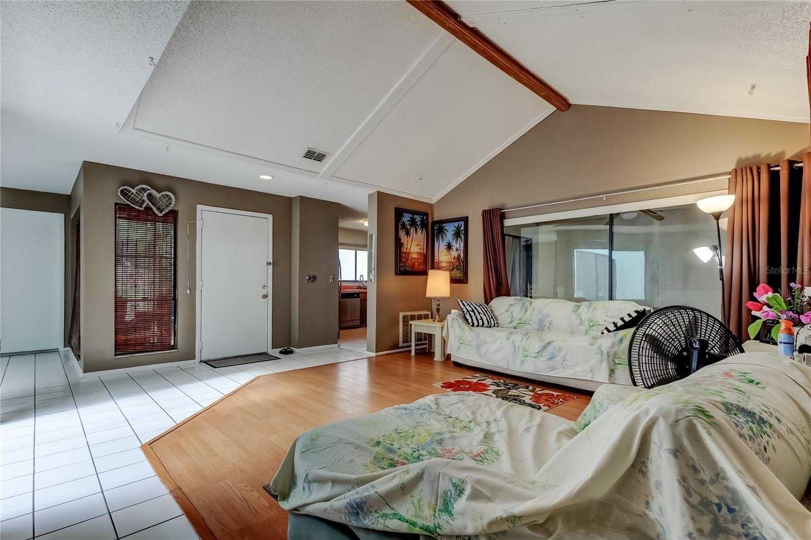 Step inside to a bright, open layout featuring vaulted ceilings, a welcoming dining area with sliders leading to a tranquil atrium, and a vintage-style kitchen complete with stainless steel appliances, double sink, and new fixtures.
