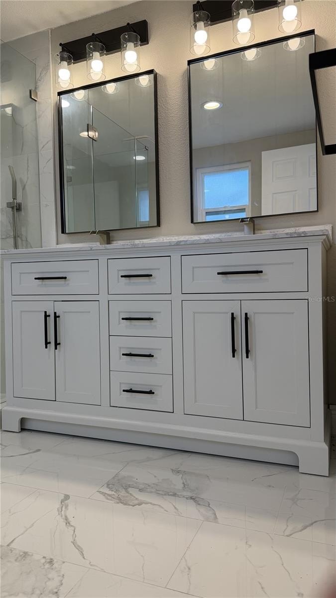 The primary suite opens directly to the pool area and includes a spa-inspired bathroom with a frameless glass shower and dual vanity. Both bathrooms showcase high-end contemporary finishes, and the laundry area is discreetly tucked behind a charming barn door.
