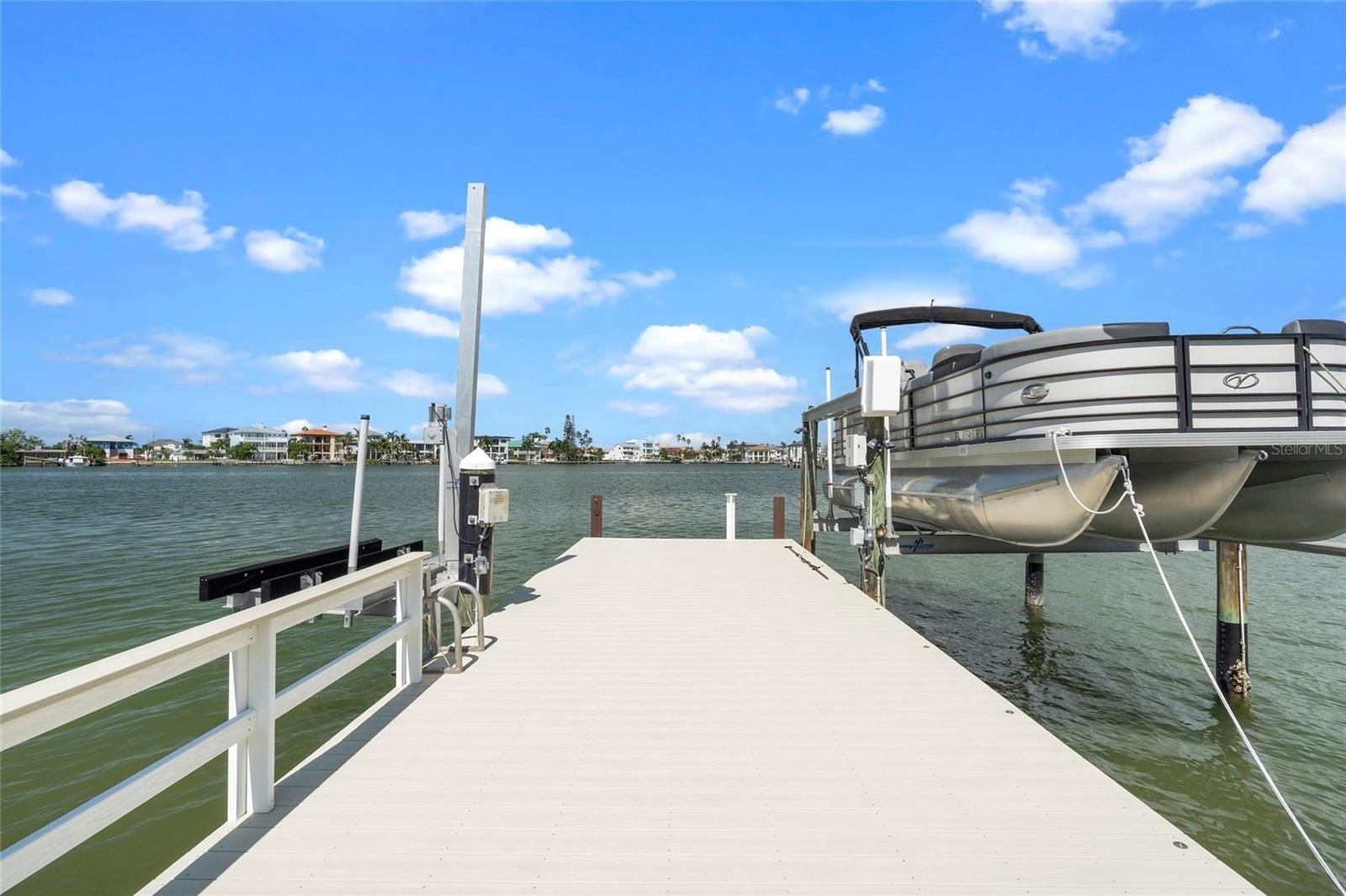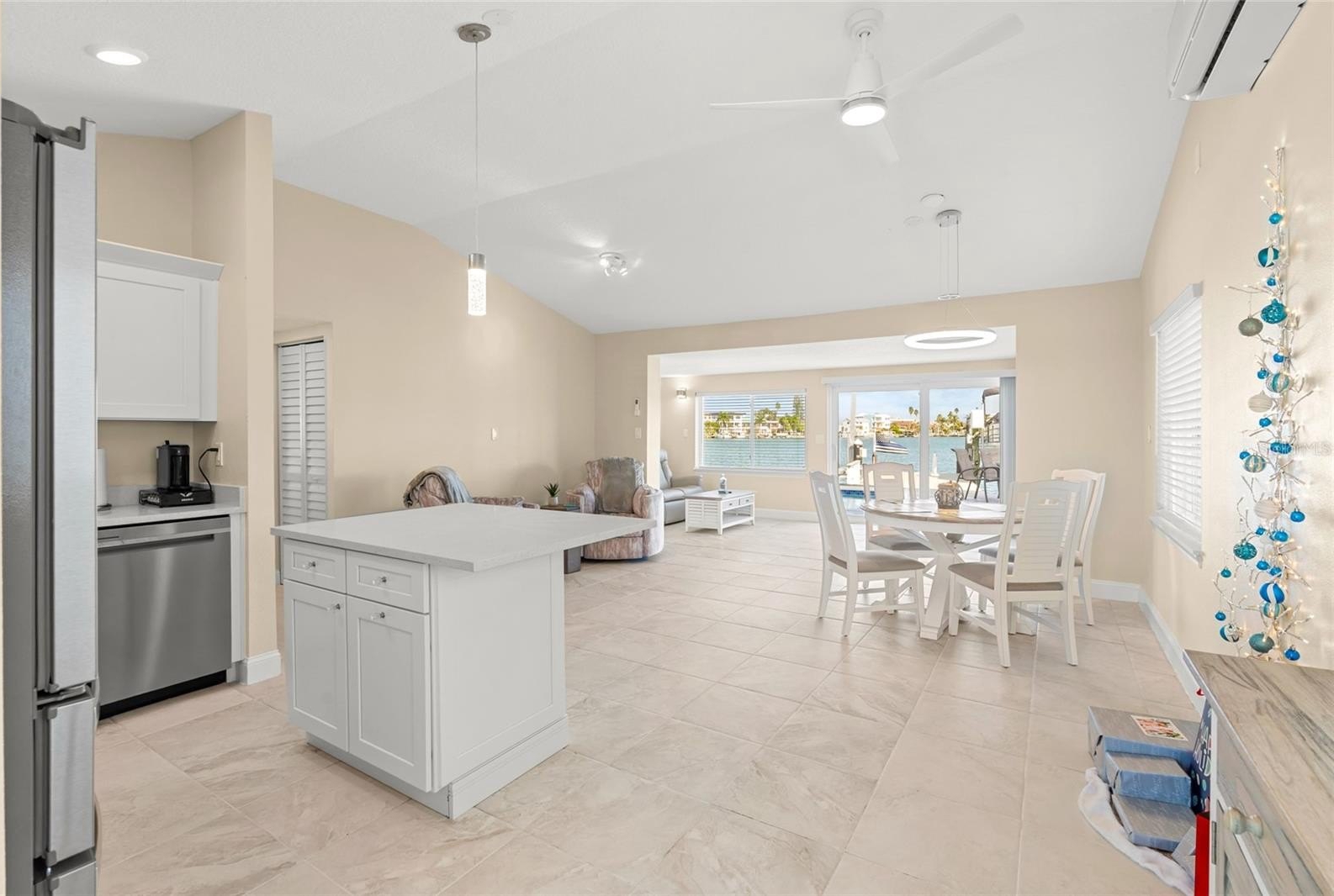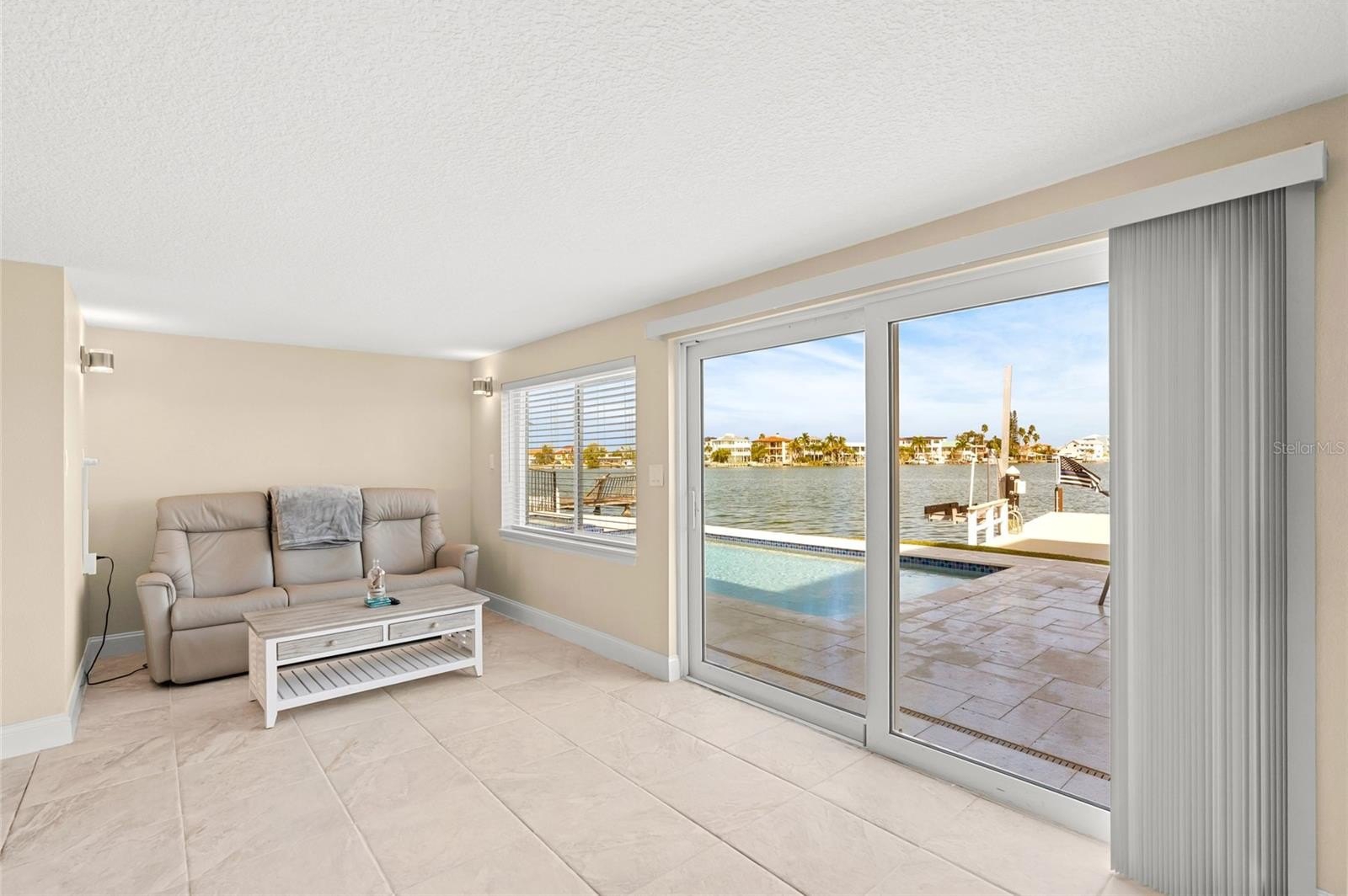 The property’s highlight is the seamless waterside pool and dock, equipped with a 10,000 lb boat lift. Extensive upgrades include a freshly painted interior, new split AC units, porcelain tile flooring throughout, and entirely replaced waterlines.