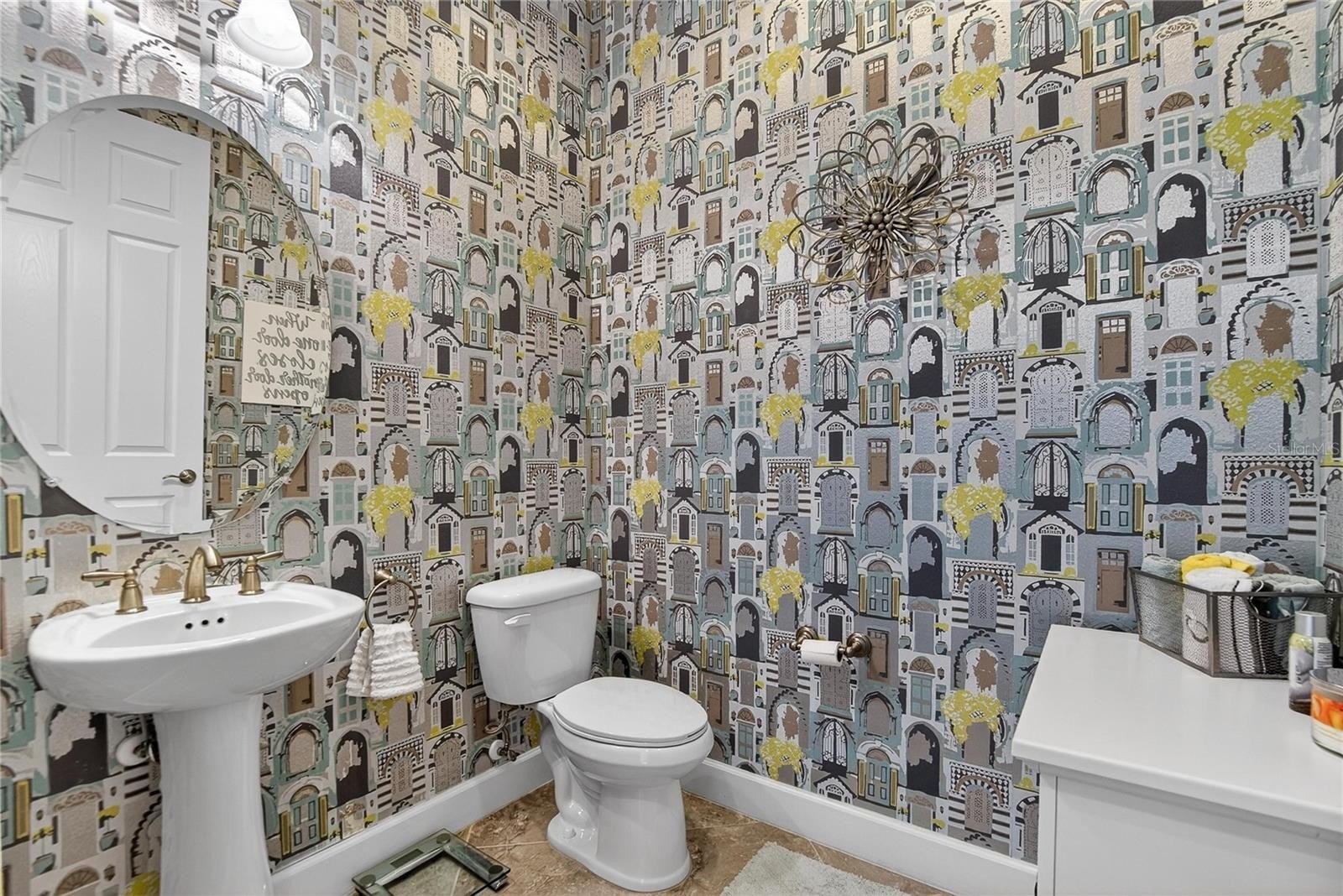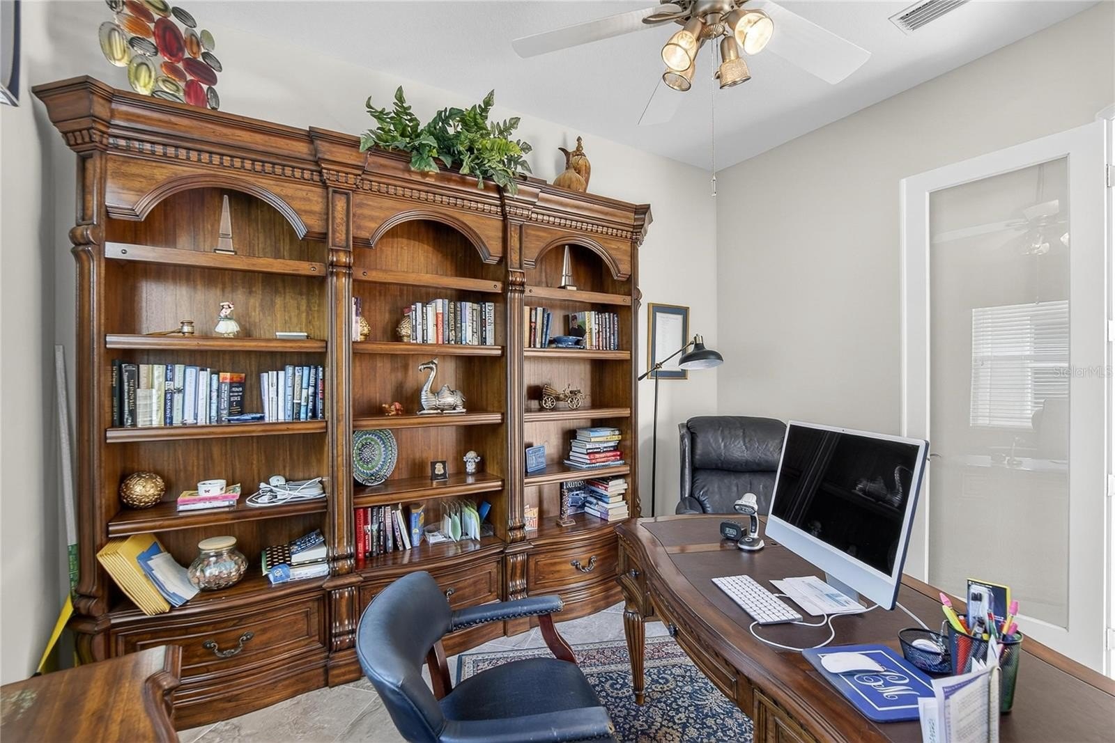 The spacious primary suite offers two walk-in closets and a well-appointed en-suite bath. The second bedroom features its own full bath, providing privacy and comfort for guests. A convenient powder room adds ease for everyday living and entertaining. The versatile office/den or third bedroom, accented with glass French doors, offers flexible space for work or relaxation.