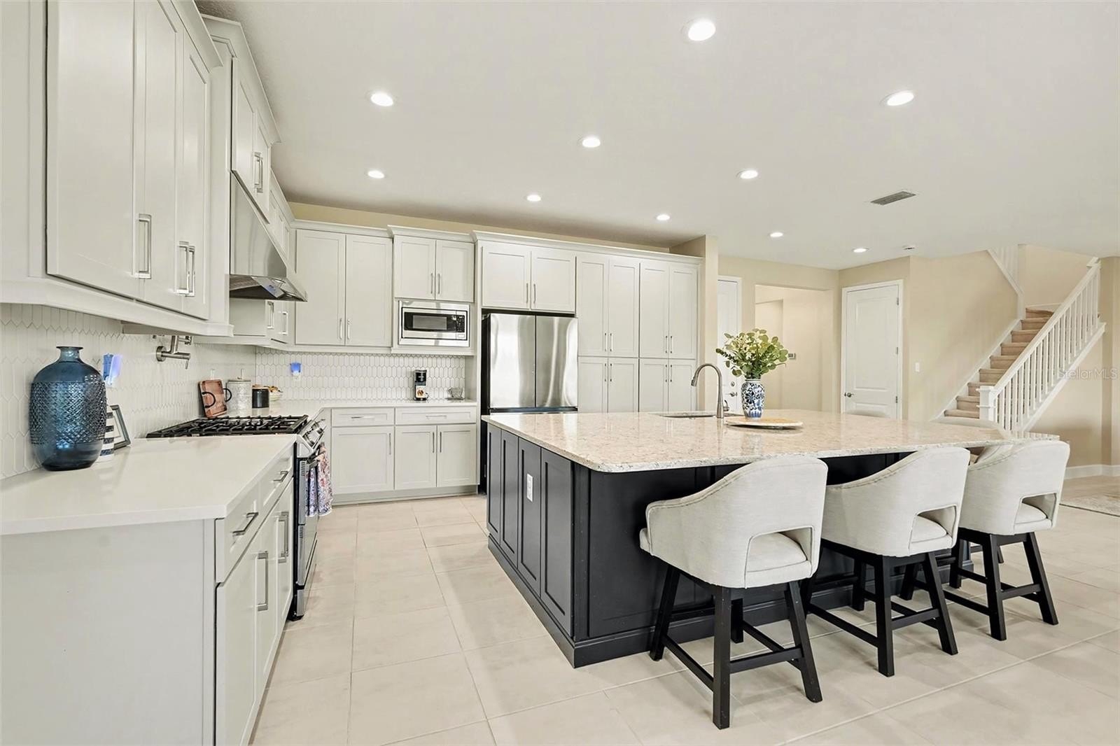 Welcome to this stunning GL Homes Alexia floorplan in the sought-after, gated Winding Ridge community of Wesley Chapel! This exceptional 4-bedroom, 4-bath residence offers 2,961 square feet of thoughtfully designed living space with a versatile open layout you’ll absolutely love. Step through the front door into a wide, welcoming foyer that leads to the expansive Great Room, filled with natural light and seamlessly combining the family room, dining area, and gorgeous gourmet kitchen. The chef’s kitchen features 42" cabinetry with crown molding, soft-close drawers and doors, over- and under-cabinet lighting, newer stainless-steel appliances, a gas stove with double ovens, pot filler, tile backsplash, single basin sink, custom range hood, recessed lighting, and a huge center island—perfect for entertaining. Abundant windows highlight the open layout and overlook the spacious, covered, extended brick-paver patio. Two sets of double sliders lead to your outdoor kitchen and expansive fenced backyard with plenty of room to add a pool. The first floor also offers a den/study or optional 5th bedroom with a full bath just steps away, plus generous storage under the stairs. Upstairs, enjoy a large loft/bonus area ideal for a media room, play space, or additional gathering area. Retreat to the private owner’s suite featuring an elegant en-suite bath with dual vanities, abundant cabinetry, garden tub, separate shower, private water closet, and two walk-in closets. Three additional spacious bedrooms, two full baths, and a convenient upstairs laundry room complete the upper level. Additional highlights include a 2-car garage with ceiling storage racks, pavered driveway and walkway, newer landscaping, gutters, water softener, built-ins in the office and laundry room, and recent interior paint in the downstairs and two bedrooms. Winding Ridge offers a grand gated entrance and resort-style amenities, including a 5-acre lifestyle complex with a 9,684 sq. ft. clubhouse and event room with kitchen, state-of-the-art fitness center, indoor sports court, resort-style pool with cabanas, splash pad and wading pool, covered playground, plus tennis, pickleball, and basketball courts. Perfectly located near The Shops at Wiregrass, Tampa Premium Outlets, Advent Health Ice Center, hospitals, and major highways I-75, I-275, and the Veterans Expressway for easy access to Downtown Tampa, Tampa International Airport, Westshore District, St. Petersburg, and the award-winning Gulf beaches. No CDD! HOA includes front gate maintenance, exterior landscaping and irrigation, amenities, and trash pickup—allowing you to relax and enjoy the lifestyle. Call today to schedule your private showing!