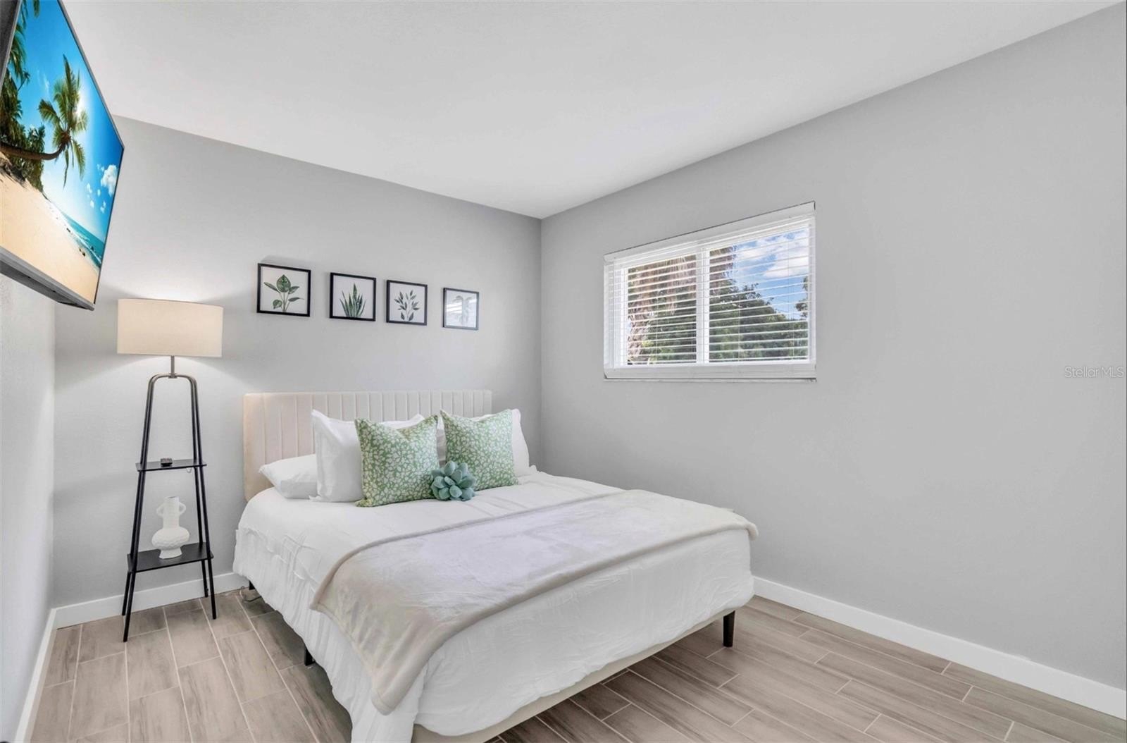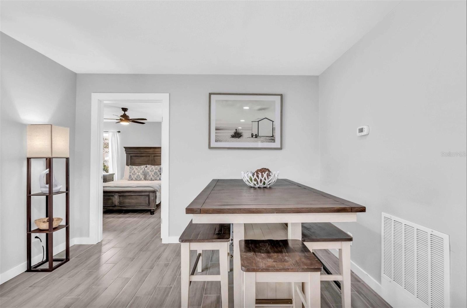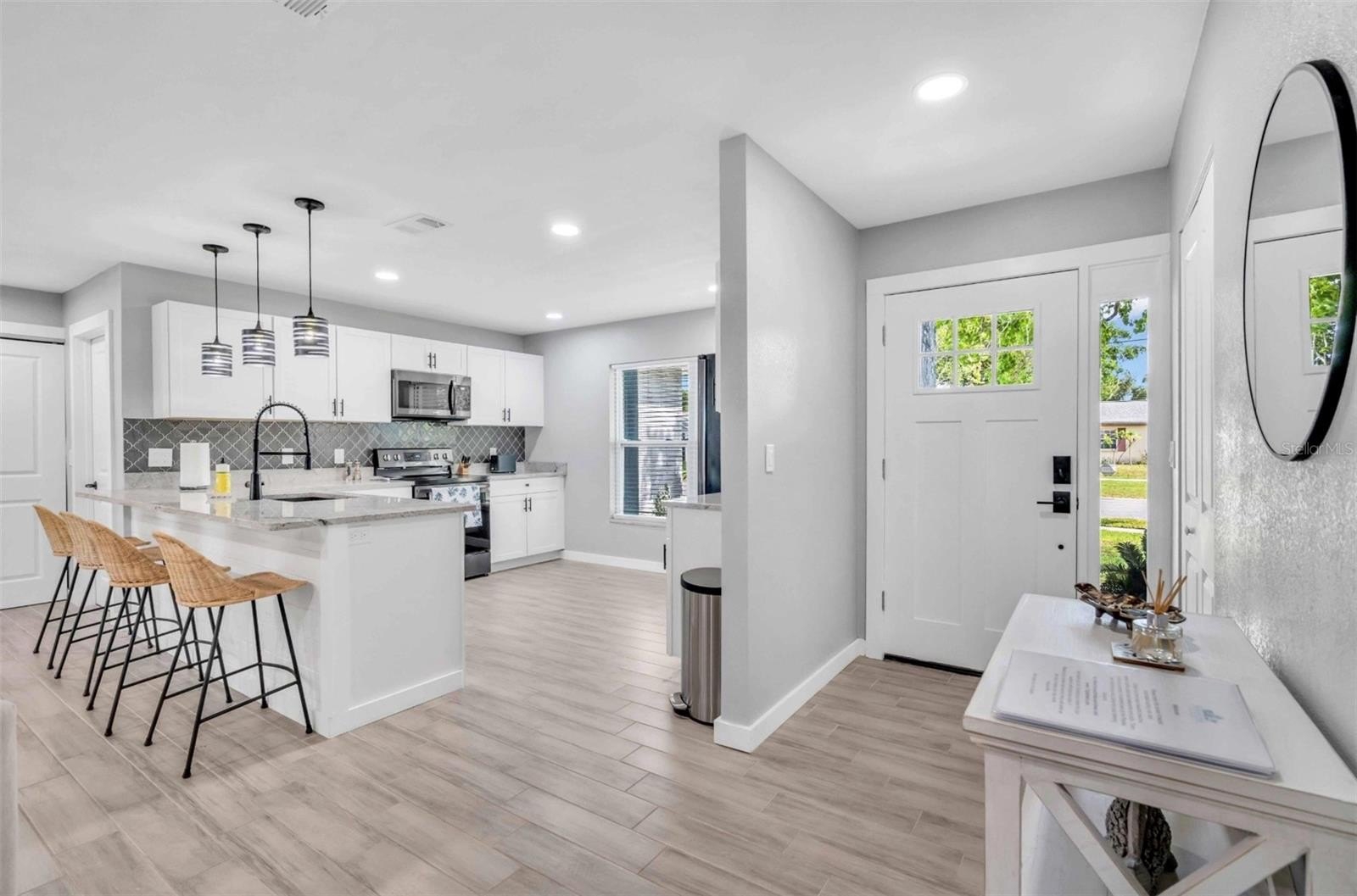 Step inside to discover an open, light-filled floorplan with stylish wood-look tile floors that flow throughout and seamless indoor-outdoor living. The heart of the home is the spacious, upgraded kitchen, featuring updated cabinets, granite counters, and modern stainless-steel appliances — perfect for everyday meals and entertaining alike. Sliding glass doors flood the living spaces with sunshine while framing views of your screened-in pool and covered lanai — creating a serene, private retreat for morning coffee or evening gatherings.