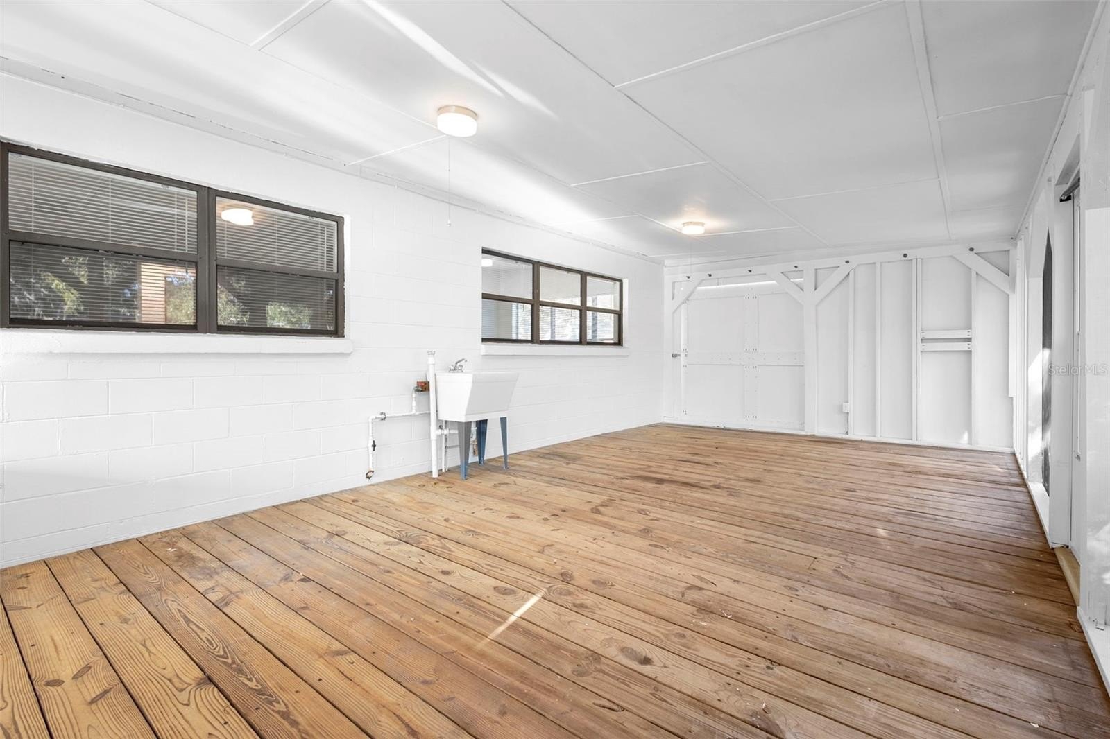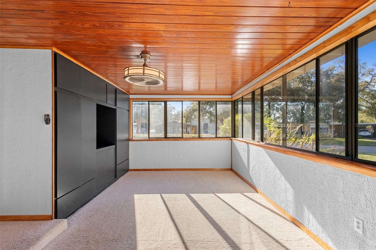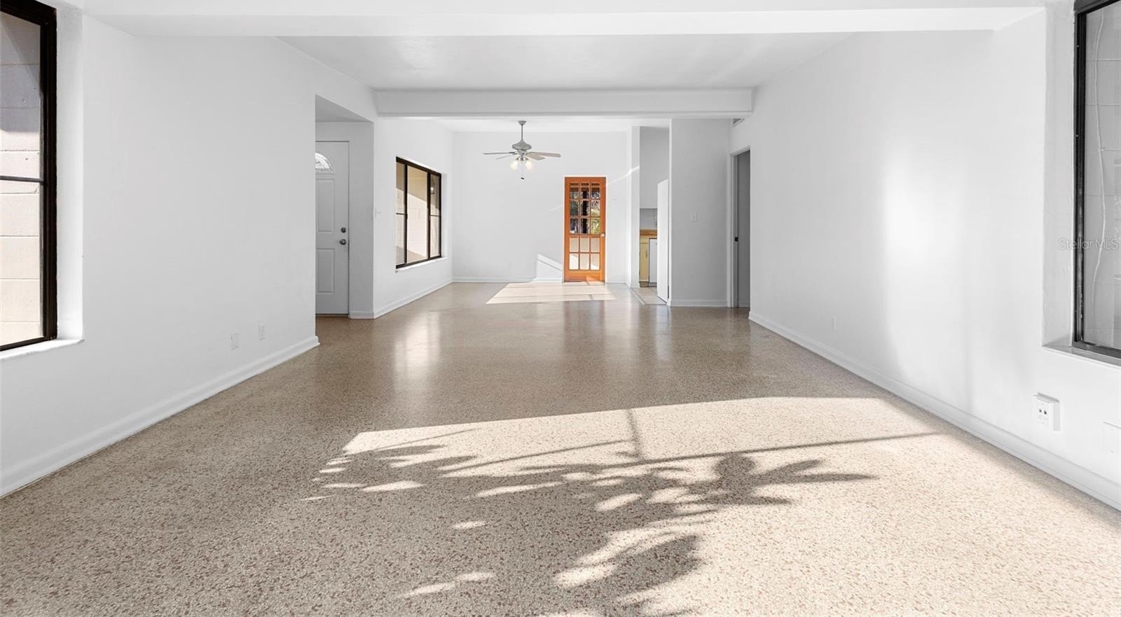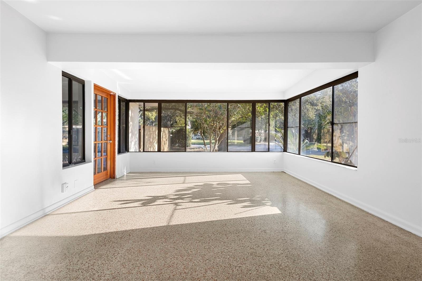 Inside, original terrazzo flooring anchors the living spaces with vintage appeal, while natural light flows throughout. The kitchen retains its original charm and compact footprint, offering functionality today with potential for future customization. The bathrooms have been lightly refreshed but remain true to the home’s character. A spacious screened-in porch opens to a wooden deck, creating a wonderful indoor-outdoor living area ideal for relaxing, entertaining, or enjoying Florida evenings.