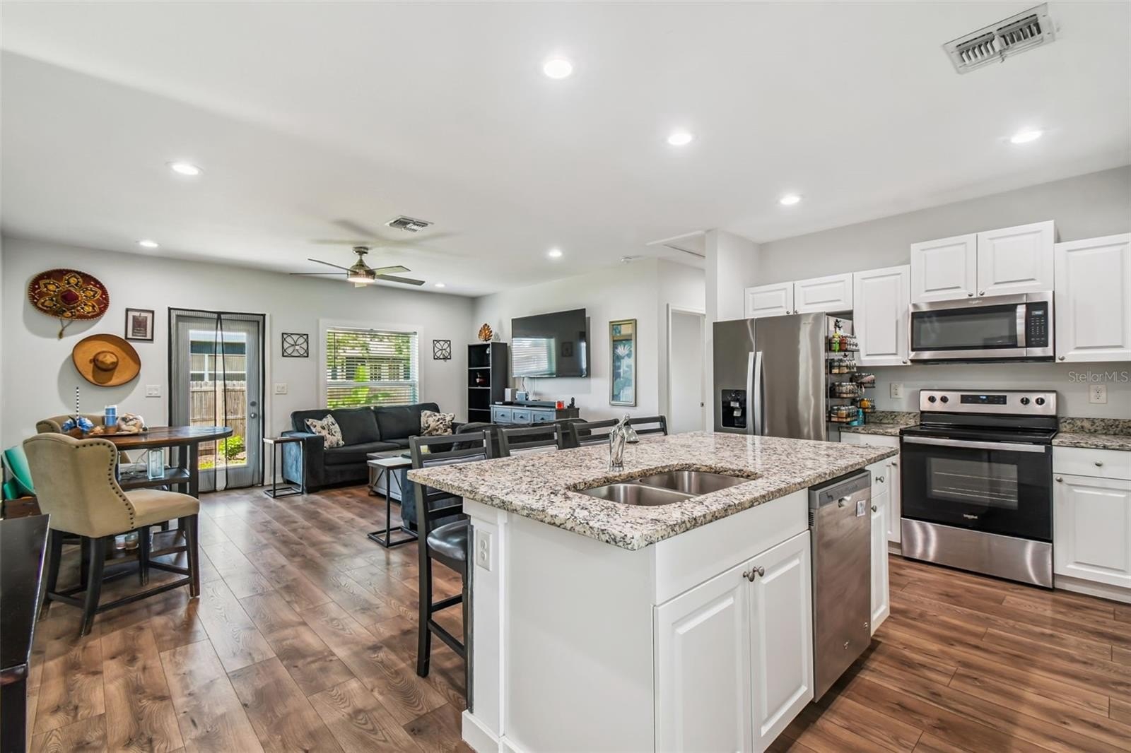 PRICE IMPROVEMENT - LIKE NEW, MOVE IN READY - MUST SEE HOME. Built in 2021, do not miss this beautifully designed home located on a sweeping private corner lot located in a central location in Holiday, Florida! This 3 bedroom, 2 bath, 2 car attached garage home presents a fresh new feel with all that a NEW CONSTRUCTION home offers without the wait. This great room, split floor plan offers a nice open design perfect for entertaining your family or friends. The kitchen is the heart of the home featuring a large center island with room for 4 bar stools, granite countertops, custom cabinets with soft close features, under mount stainless steel sink, stainless steel appliances and plenty of cabinets for your kitchenware all overlooking the GREAT ROOM. The primary suite is spacious with a corner desk or dresser niche, upgraded light fan package, oversized walk in closet, primary bath with quartz vanity countertops, double sinks, walk in shower and designated linen closet. Additional highlights of this home include a FENCED IN BACKYARD, front paver patio, HURRICANE RATED WINDOWS, recessed lighting, upgraded ceilings fans, laminate floors consistent throughout, ceramic tile floors in the baths, inside laundry room including the washer and dryer, gutters, tropical backyard with fruit trees, NO HOA and more. This home is centrally located to schools, shopping, beaches, restaurants, golf courses, Anclote Key State Park, Fred Howard Park, the famous Tarpon Springs Sponge Docks and approximately 45 minutes to Tampa International Airport and/or St. Peter/Clearwater International Airport. If you are looking for FLORIDA COASTAL LIFESTYLE without any HOA fees, this is the HOME FOR YOU.