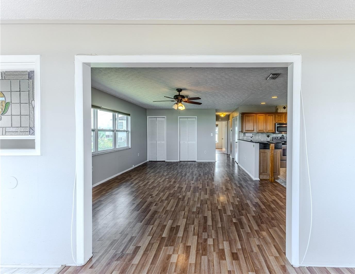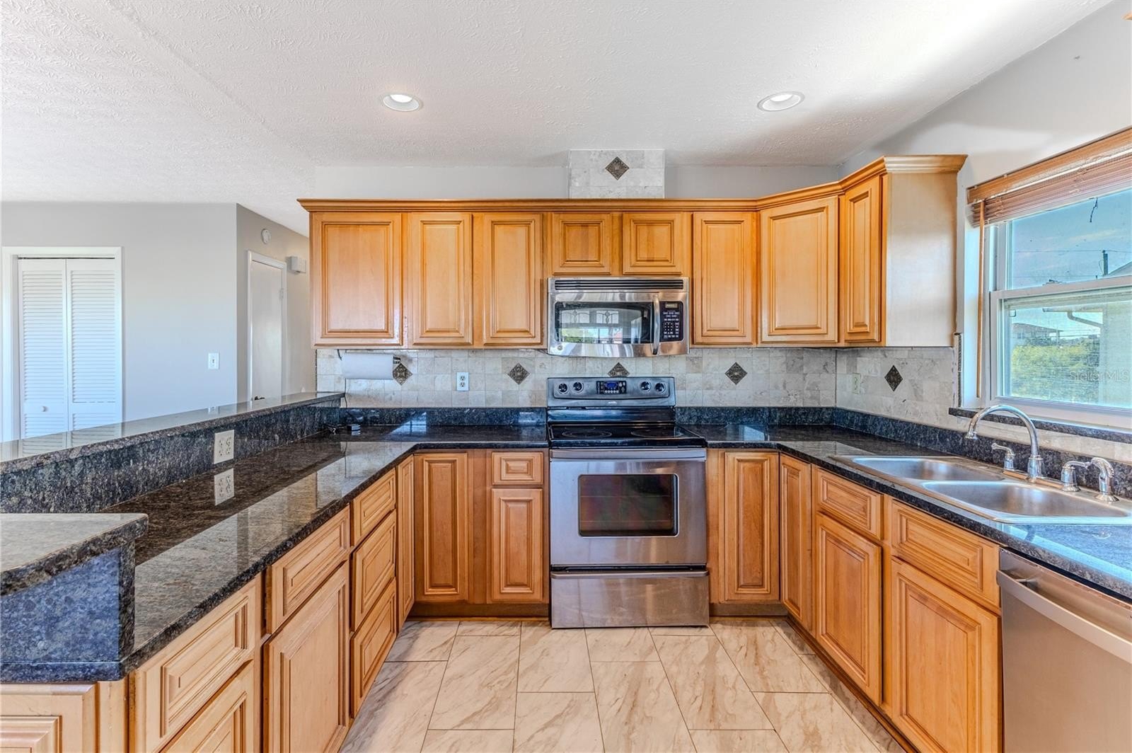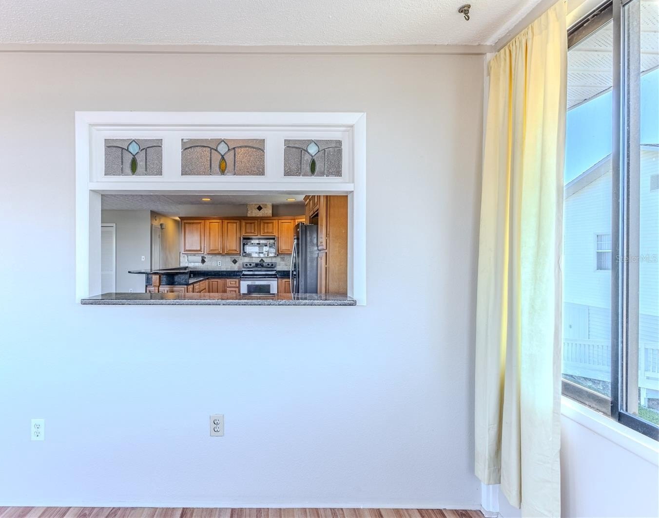 Inside, you'll find laminate wood-look flooring throughout the living areas. The kitchen is designed with wood cabinets featuring convenient pullouts, granite countertops, stainless steel appliances, a breakfast bar, and a dining area. The kitchen opens to the great room, where abundant windows bring in natural light. Additional features of this space include two closets, stained-glass accents, and a converted sunroom that extends your living area and takes advantage of the water views.