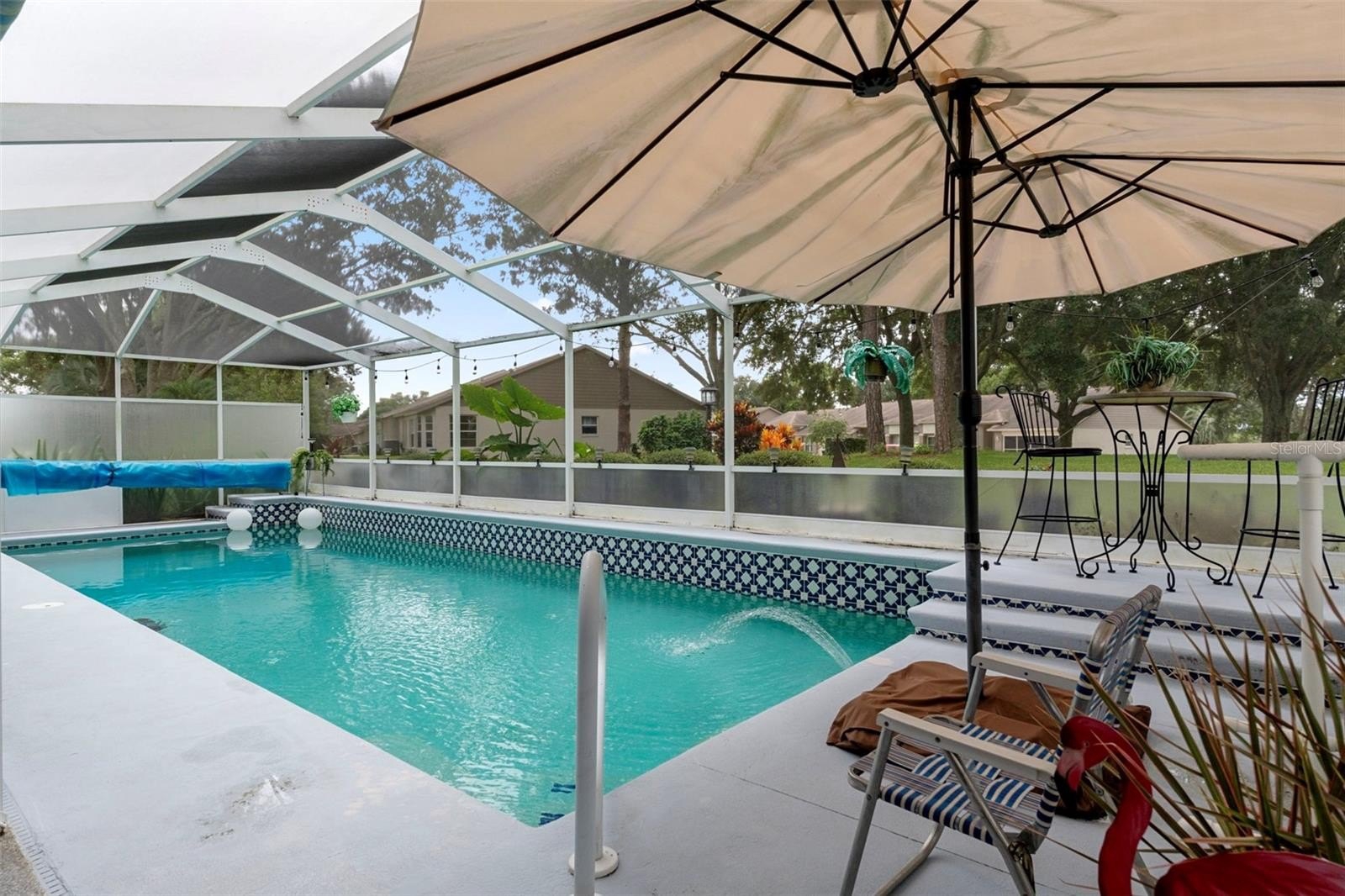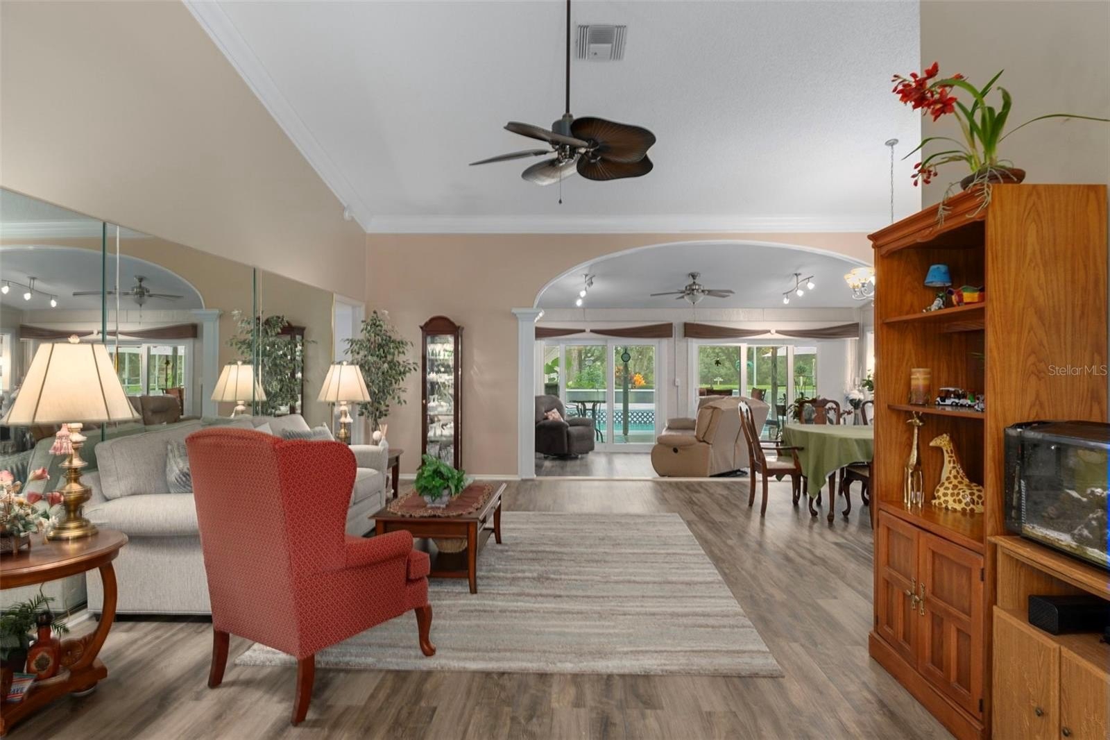 Welcome to this totally updated FURNISHED POOL HOME. SOLAR HEATED POOL WITH NEWER POOL PUMP. The open floor plan is so inviting to entertain guests and family. Upon entering the home through the etched lead lass font door you will notice the unique architectural flare of the arched entrance to the family room and the crown moldings. This home has character and shows pride of ownership. Once inside the family room thee custom built wet bar will be sure to catch your eye. The updated kitchen offers tons of cabinets and granite counter tops with a new microwave. New matching luxury vinyl flooring throughout except for the bathrooms and kitchen, Beautiful newer hurricane impact windows and sliders modernize this home. Welcome out back to your large pool deck which is large enough for many pool parties in your oversize 12X34 pool that is 6.5ft deep. In addition the newer hot tub will convey with the home. The pool cage has been recently rescreened and the home includes storm curtains to protect the lanai area. The home offers an inside laundry room with a 2 car garage that contains a club car golf cart included in the sale of the home. Attic fans and gutter guards were recently installed. In addition the primary bathroom has a walk in shower with no step down. This home will be perfect for your Florida living. In addition the home is located in the resort community of TIMBER PINES. Live in and enjoy this active and amazing community with 4 golf courses, 2 putting greens, a driving range, 2 pro--shops, tennis, pickleball, a multimillion dollar fitness center, 2 community pools and hot tubs, a full time restaurant, and a performing arts center. Numerous clubs and activities along with great entertainment throughout the year. Call today for a showing.