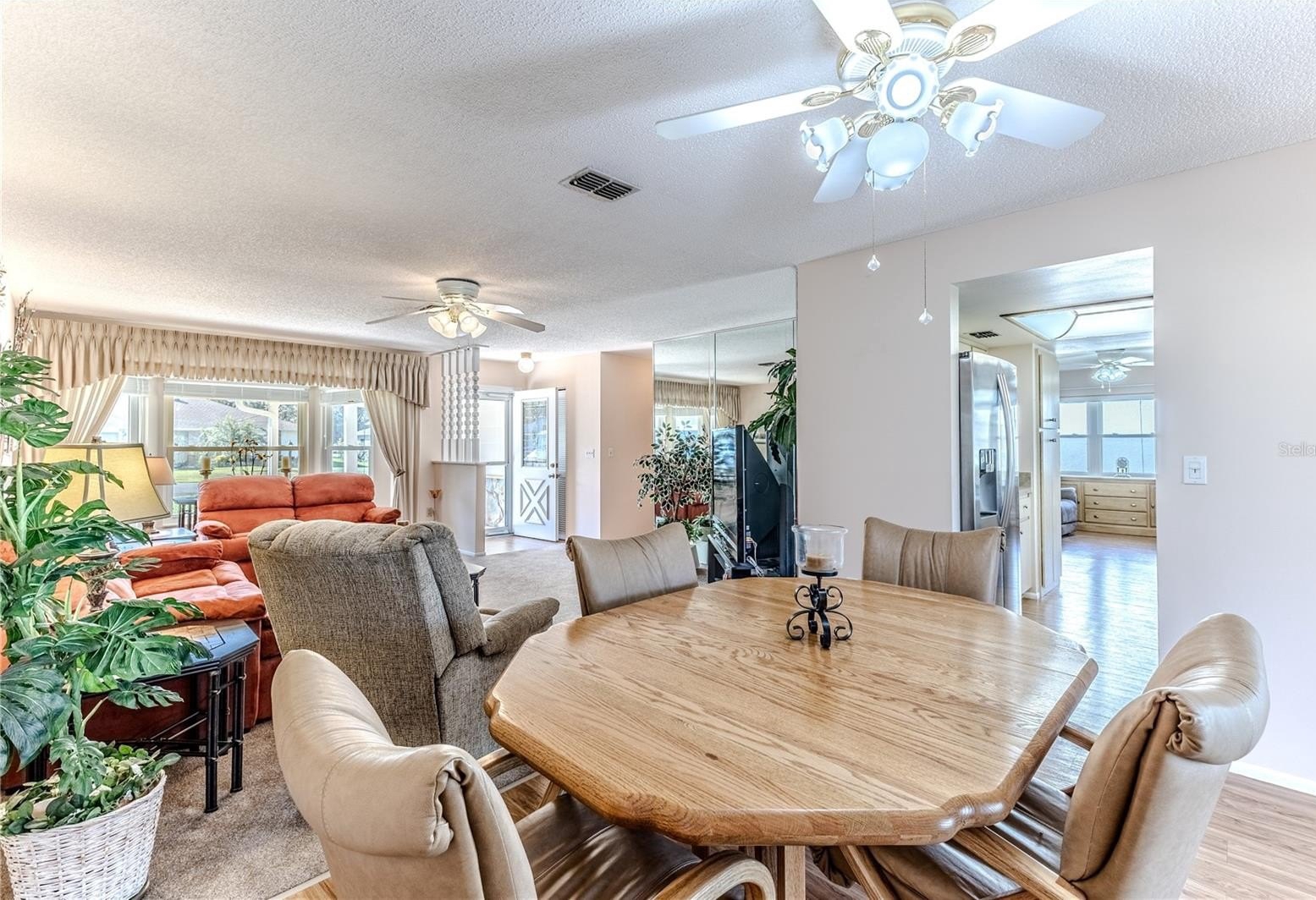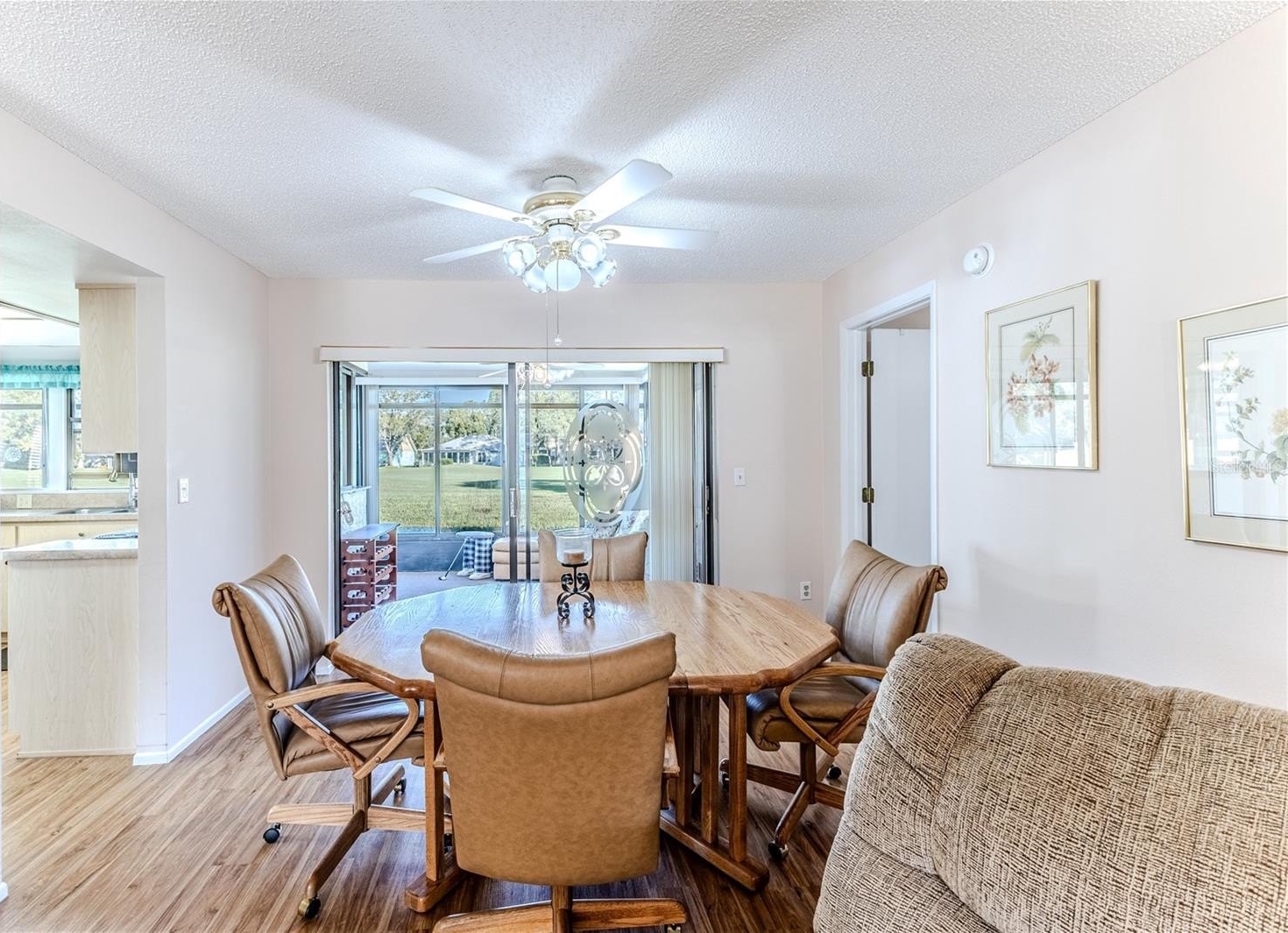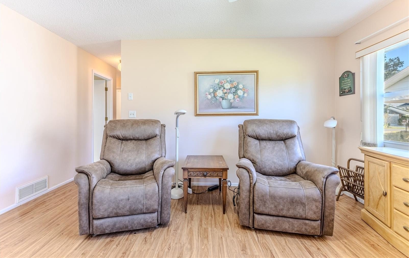 This beautifully maintained 2-bedroom, 2-bathroom, 2-car garage home is located on The Lakes Golf Course, offering gorgeous panoramic views and the true Florida lifestyle. From the moment you arrive, you'll be impressed by the delightfully painted driveway and walkway that add to the home's amazing curb appeal. The charming front porch is the ideal spot to relax under the ceiling fan and visit with neighbors. Step inside to a bright and open living room and dining room combination, complete with a front coat-closet and a comfortable split-bedroom floor plan for added privacy. The spacious kitchen features beautiful golf course views, a window that opens to the lanai, a large pantry with pull-out shelves, and plenty of cabinet space. The family room flows seamlessly to the enclosed lanai, where you can unwind and take in the peaceful golf course scenery. The primary suite includes a large walk-in closet and a private bath with a step-in shower. On the opposite side of the home, you'll find the guest bedroom with a large closet and a full bath with a tub and shower. Enjoy the benefits of a 2022 HVAC system, windows replaced in 2014, irrigation well, and a roof from 2002. The inside laundry room offers cabinets, a utility sink, washer, dryer, and extra storage space. The garage features sliding screen doors, allowing fresh air to flow through while you work or relax. Ground remediation has been completed, with an engineer's report available — this home is fully insurable. Furnishings and golf cart are available for purchase separately. Timber Pines is an award winning, guard-gated, 55+, deed-restricted community offering a resort-style lifestyle: three 18-hole golf courses, a 9-hole pitch & putt, tennis, 12 pickleball courts, two community swimming pools, country club restaurant and bar, fitness center, billiards, performing arts, and over 100 social clubs and activities.
