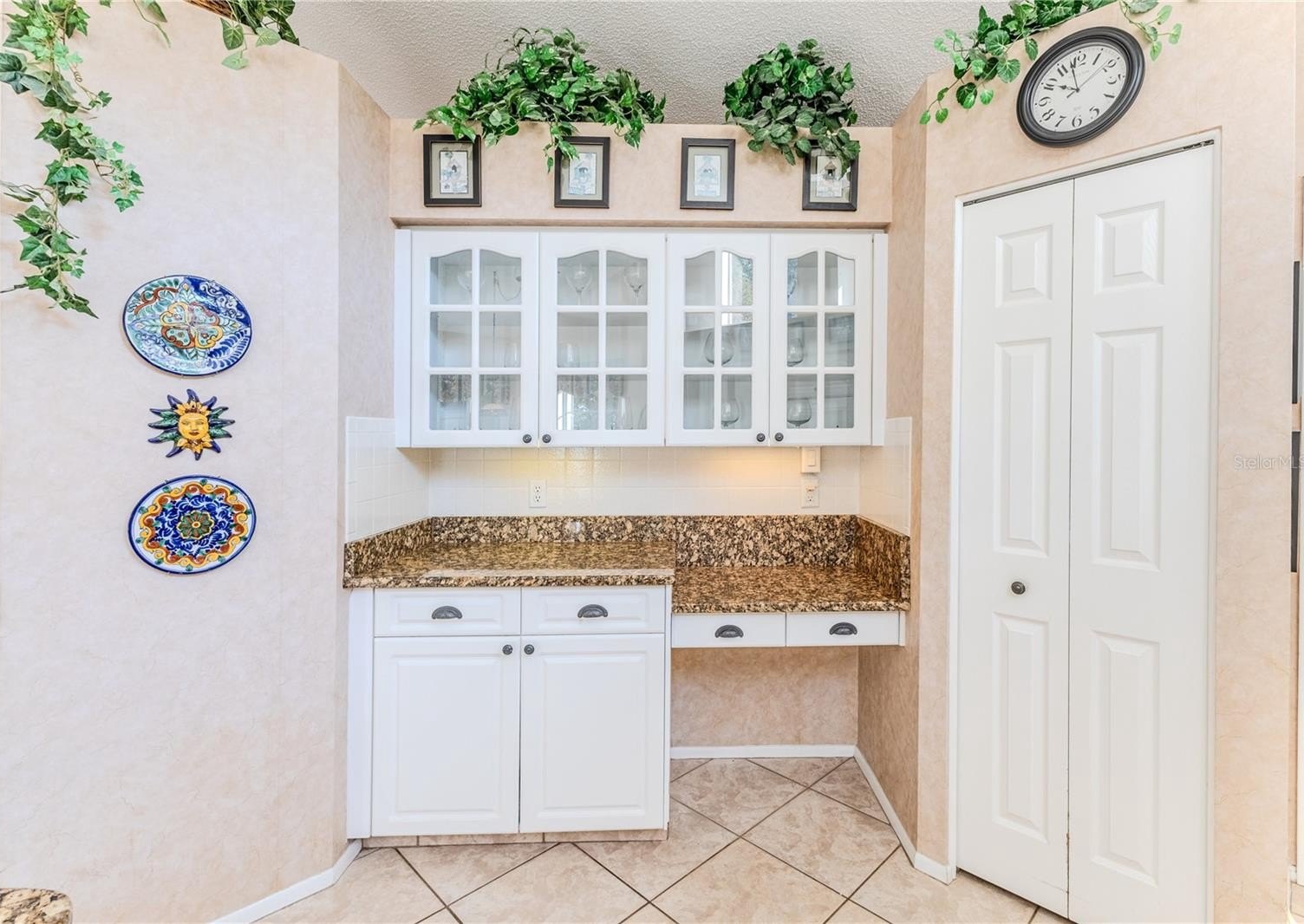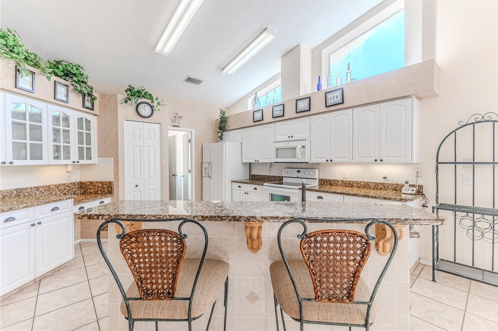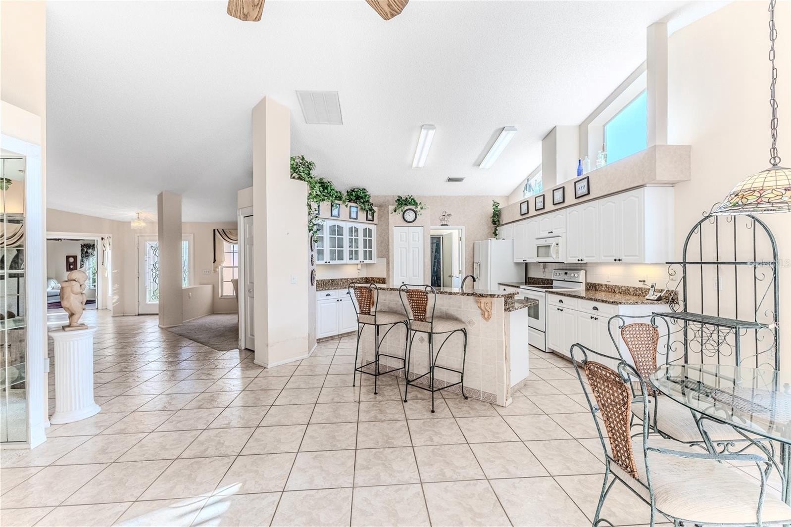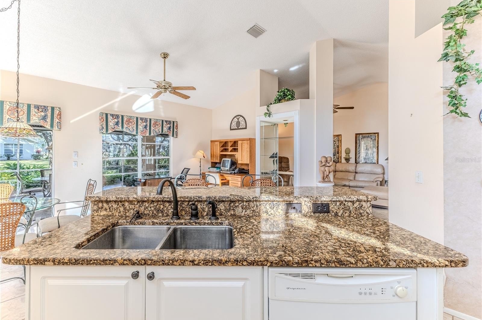 The open kitchen features granite countertops, breakfast bar, tile floors, under-cabinet lighting, a pantry, and a layout that flows seamlessly into a versatile flex space. This area can serve as a casual dining nook, office, hobby room, game area—whatever suits your lifestyle. Sliding glass doors lead to the expansive tiled lanai with a covered sitting area and an inground hot tub (condition unknown).