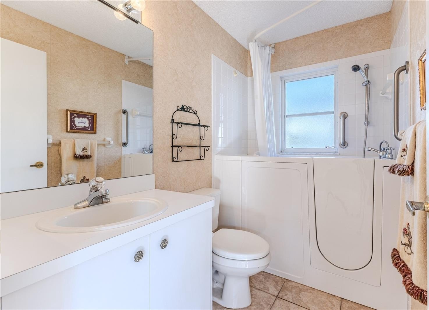 The spacious main bedroom offers garden views, an oversized walk-in closet, and an en suite bath complete with dual sinks, a makeup vanity, linen closet, walk-in shower, soaking garden tub, and a private water closet. The guest bedroom, currently used as a den, features double French doors and easy access to the guest bath, which includes a walk-in therapy tub—perfect for unwinding after an active day.
