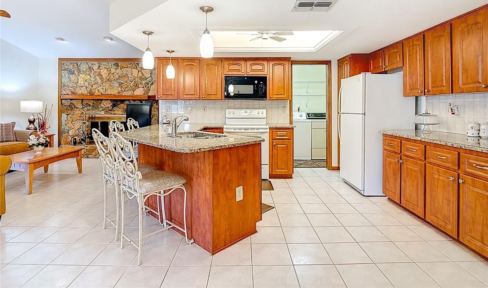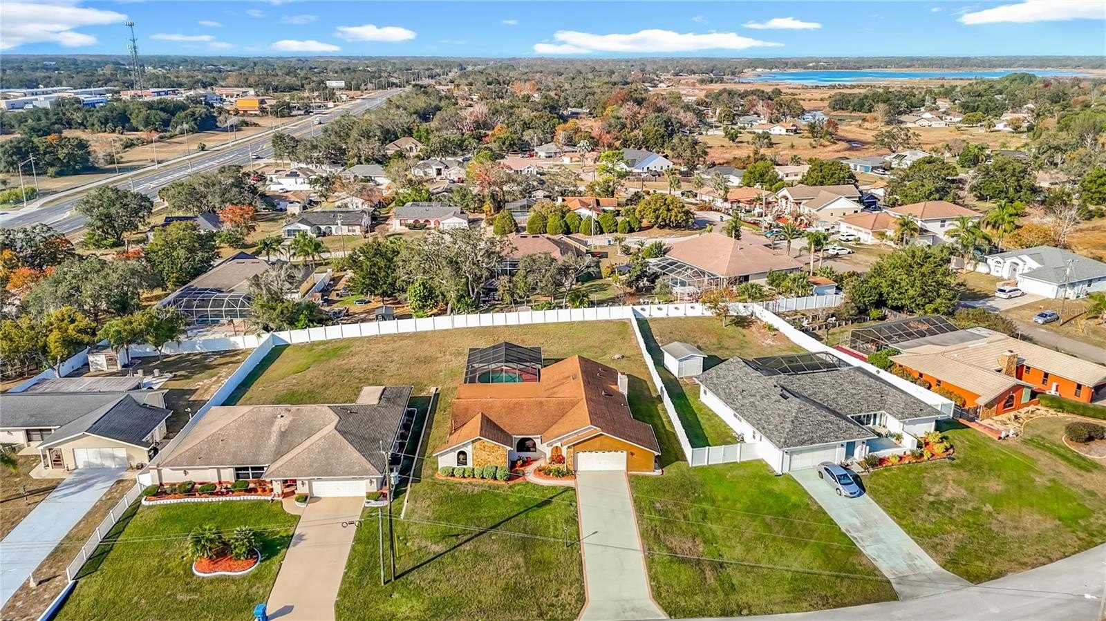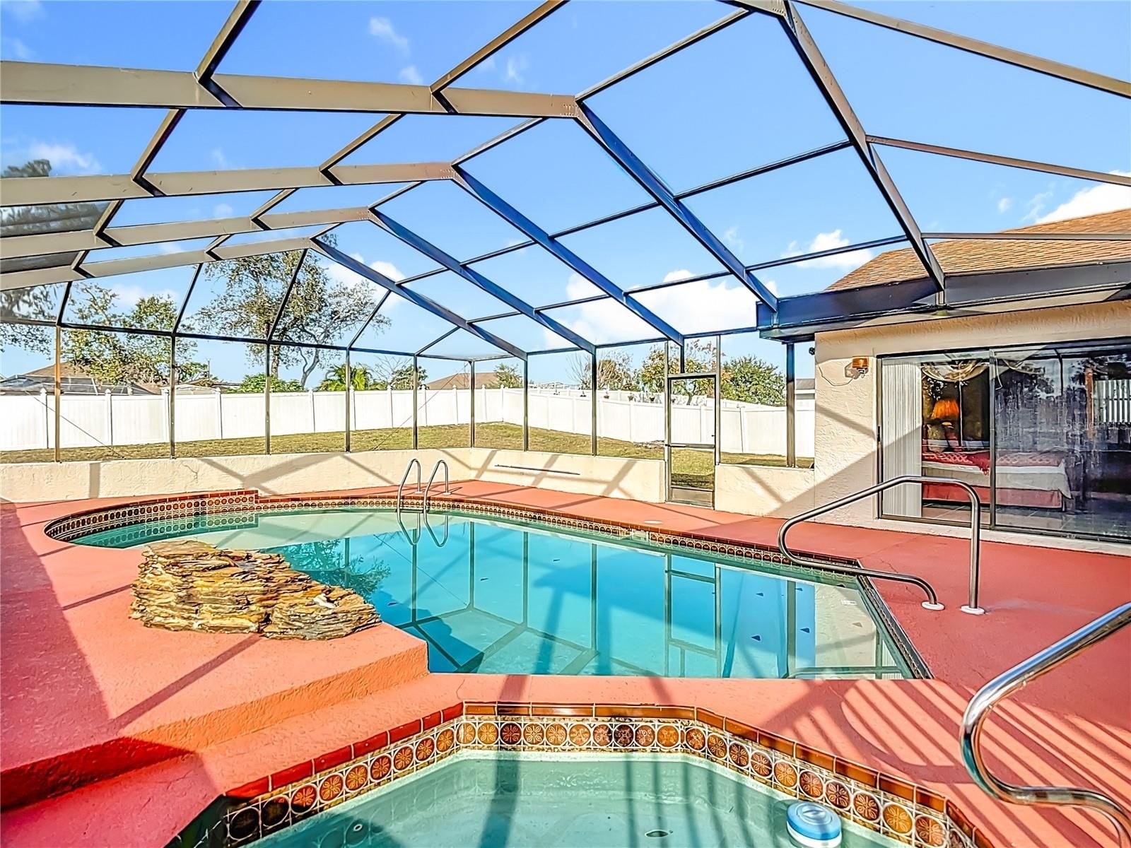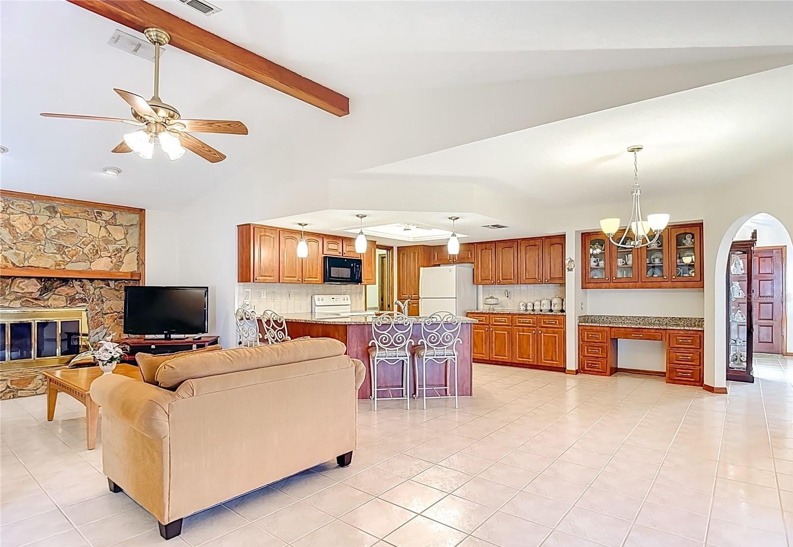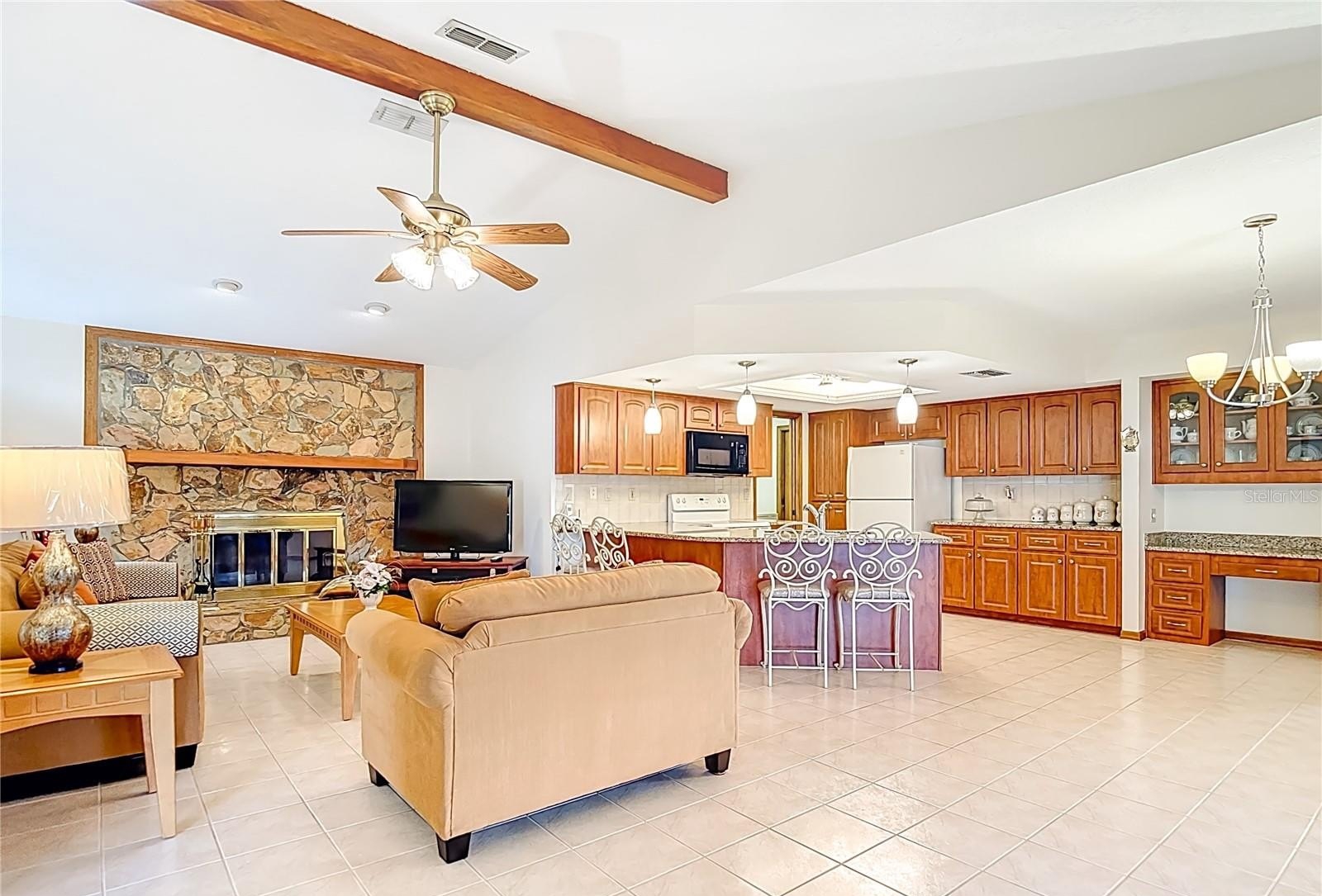 Welcome to this meticulously maintained 3-bedroom, 2-bathroom pool home nestled on a generous 0.32-acre lot. The property offers both privacy and curb appeal with partial fencing and a lovely landscaped front yard. An extended driveway leads you to a cozy front porch—the perfect spot to enjoy your morning coffee. Step inside and be greeted by an open floor plan that seamlessly connects the living and dining areas. Gorgeous tile flooring and a vaulted ceiling adorned with wood beams create a warm, inviting atmosphere. The spacious living room/dining room combo is ideal for entertaining family and friends. The expansive eat-in kitchen is a chef’s delight, featuring updated cabinets, granite countertops, a stylish tile backsplash, a built-in desk, closet pantry, and sliding doors that open directly to the pool area. The kitchen flows into the family room, where wood beam ceilings and a wood-burning fireplace offer comfort and charm for cooler evenings. Retreat to the spacious master suite, complete with a walk-in closet and elegant wood beam ceiling. The master bath boasts a separate vanity area, a tub with tile shower surround, and a large linen closet for added convenience. The two additional bedrooms are generously sized, each featuring walk-in closets and sharing a well-appointed second bathroom. The dedicated laundry room offers a utility sink, additional closet pantry, and comes equipped with a washer and dryer. Enjoy Florida living at its finest on the spacious lanai, which showcases decorative stamped flooring. The lanai opens to a sparkling diamond brite pool and spa, complete with a beautiful waterfall feature and views of the expansive backyard with vinyl fencing—perfect for relaxation and entertaining. Additional features include oversized 2 car garage with pull-down attic access, Roof 2012, AC 2014, brand new water heater, newer aluminum ceiling in lanai and a 7-zone sprinkler system. This meticulously maintained, move-in-ready home offers a perfect blend of comfort, style, and modern upgrades—making it an exceptional find for those seeking a spacious retreat. Repaired Sinkhole Home. Docs available upon request.