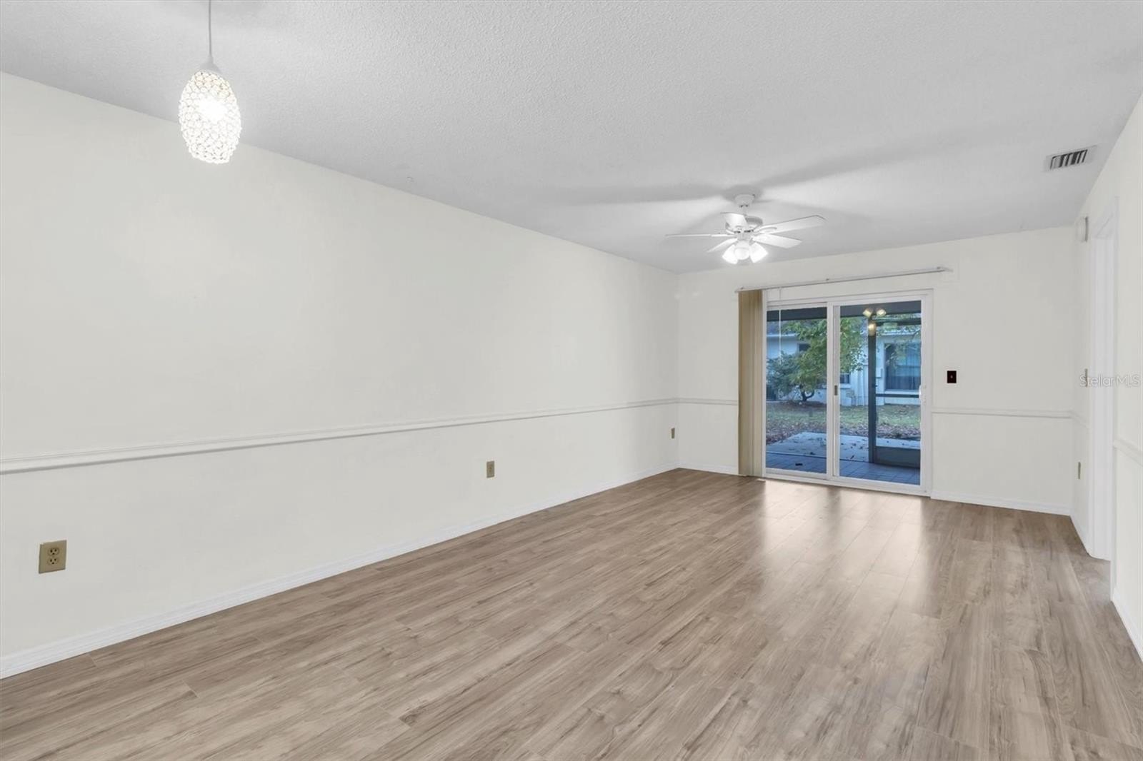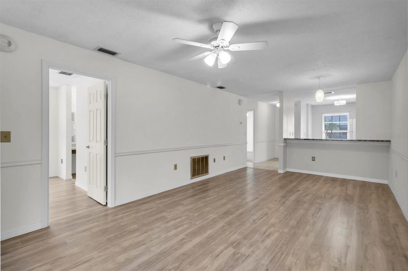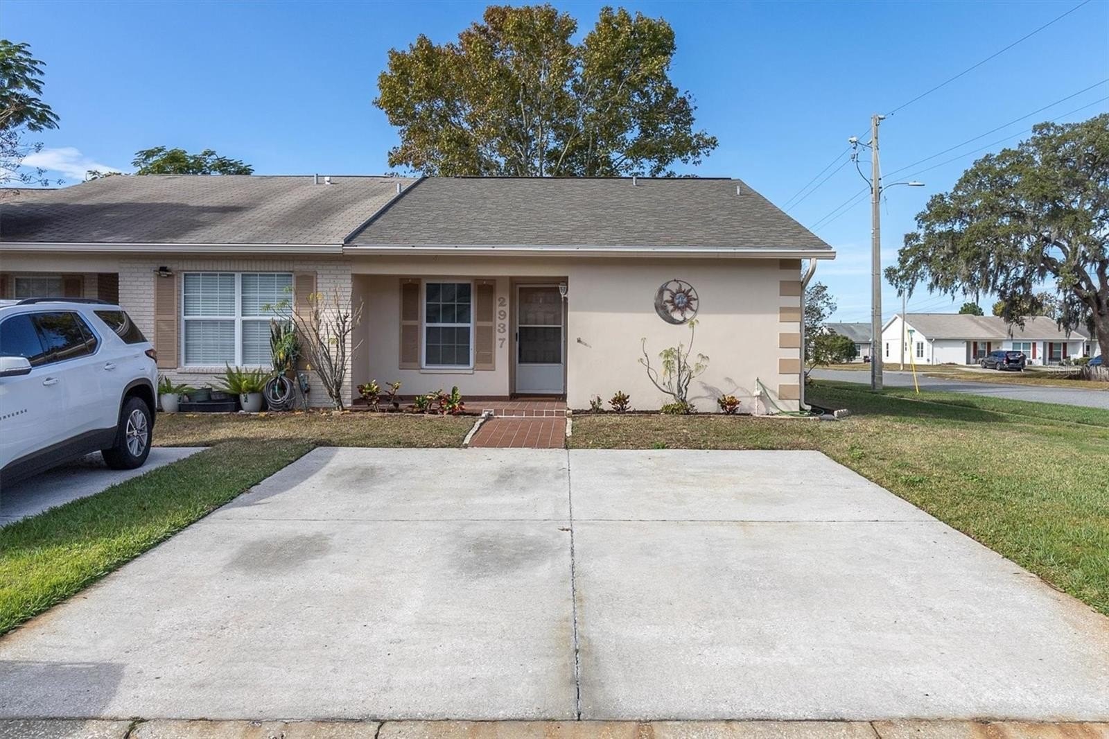 Light and bright end unit with an updated kitchen and flooring. No age restrictions. A welcoming brick-paved front porch leads to a new front door and storm door. This two-bedroom, two-full-bath villa is located in the highly desired community of Veterans Villas, featuring a very low HOA fee. Exclusive driveway parking directly in front of each unit. This villa has a beautifully updated kitchen with granite countertops, white cabinets, an eat-in breakfast nook, a breakfast bar, and soft-close drawers. All windows replaced in 2019. Roof 2022. New AC 2025. New water heater 2025. Open-concept floor plan with the kitchen overlooking the dining room and then the living room. Fans in all rooms. Screened-in lanai and large concrete slab perfect for a grill and outdoor patio furniture. NEW Laminate flooring. Tile in wet areas. Chair rail accents. Inside laundry. Zoned for top schools. HOA fee is only $42.50/month and includes all exterior maintenance and trash.