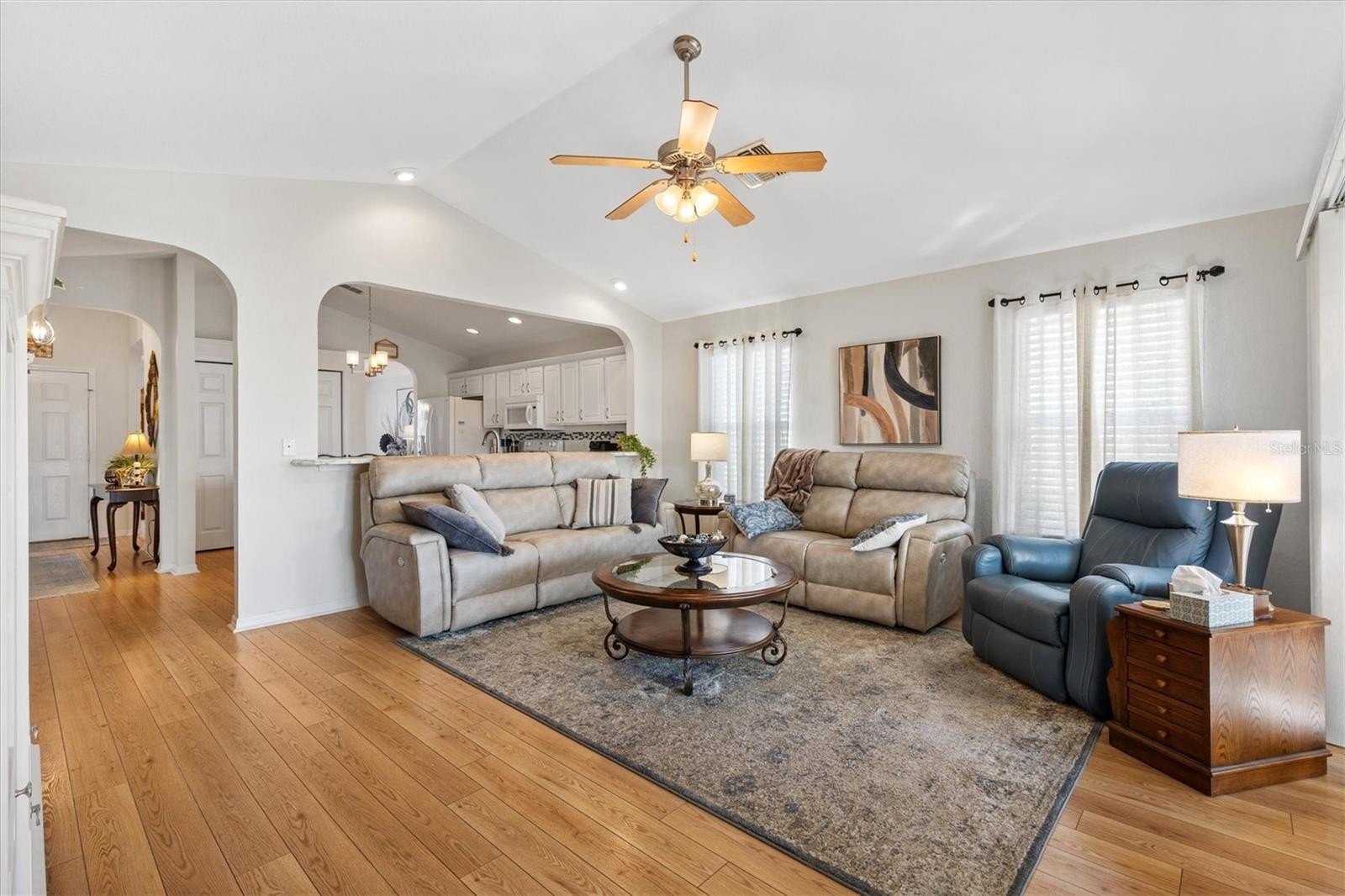 Pack your clothes and your toothbrush—this one is truly turnkey and ready for you to start enjoying the good life! Located just minutes from THE VILLAGES, FLORIDA and golf cart accessible, this beautiful 3 Bedroo, 2 Bath Hickory Floor plan is fully furnished and nestled inside the Exclusive, Gated 55+ GOLF COMMUNITY of STONECREST. Designed for comfort and easy entertaining, the home Features HIGH CEILINGS, CROWN MOLDING, OPEN Floor plan, and LAMINATE Fooring throughout the main living areas, with TILE and CARPET in bedrooms. The kitchen offers high-definition formica countertops, center island, large pantry, and flows effortlessly into the living and dining spaces, making it perfect for gatherings with friends and family. ENCLOSED LANAI with MOTORIZED SUNSHADES provides additional living space to relax and unwind, while the spacious INDOOR LAUNDRY room and TWO CAR Garage add everyday convenience. Recent updates include NEW ROOF 2021 and HVAC system 2011. Outside, you’ll appreciate the professionally landscaped yard with a BRICK PAVER driveway and walkway, adding to the home’s welcoming curb appeal.