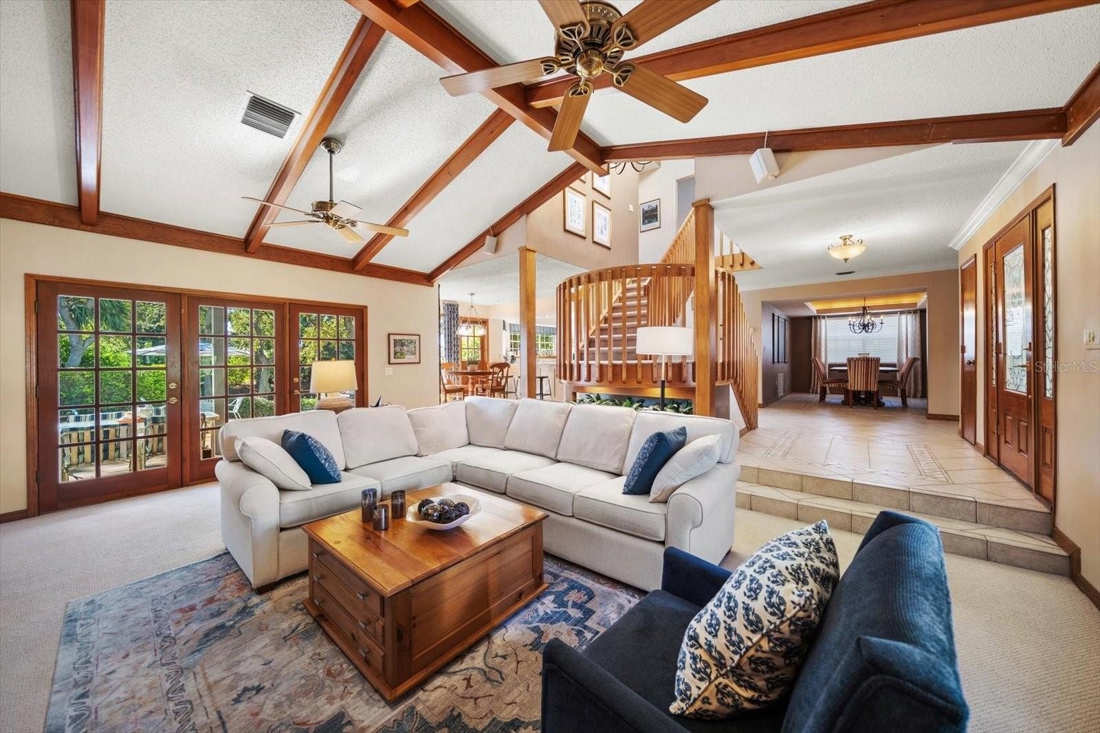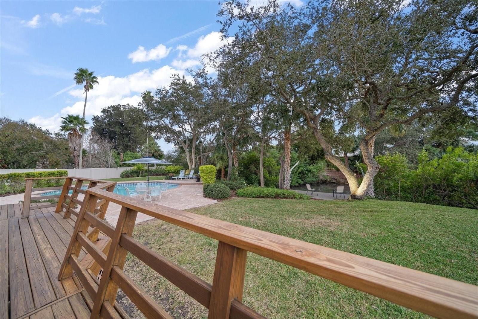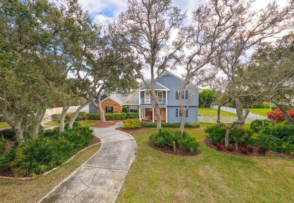 A rare opportunity becomes available to own this timeless property offering a one owner custom residence on a premier .70-acre lot with outdoor areas that mirror a private sanctuary. An inviting front porch beckons you through the leaded glass door entry where one can appreciate a home designed with the modern family in mind. The floorplan separates social life from rest with its desirable “all-up” bedroom configuration. Vaulted beamed ceilings, impressive natural wood moldings, built-ins with integrated storge, inviting floating staircase and French doors that capture the private backyard paradise reconfirm that this property is exceptional! The resort-style pool surrounded by attractive brick pavers adjoins expansive green space, fenced for worry free usage by children and pets. This residence features an observation deck overlooking a small saltwater canal with direct access to the intracoastal. Most notably, the home and grounds maintain no history of rising waters or storm damage. Designed for a serious chef or entertainer, the kitchen is clearly the heart of the home. A contemporary center island is the focal point for family gatherings or culinary experiences and abundant cabinetry, smooth stone counters, custom brick surround wall complement this area so rich in natural light. Formal dining and living areas, breakfast nook, and a spacious family room overlooking the lush private backyard and pool complete the ground level living area. Upstairs bedroom quarters of 4 include a large primary suite with lovely bath and walk in shower, a Juliette balcony off of a bedroom and skylights that capture natural light all year. Located in the quiet neighborhood of Indian Springs just minutes to exquisite beaches and major access roads to Tampa, St Pete and Clearwater, this is a gem of a property where space meets lifestyle and families grow and create memories to last a lifetime!