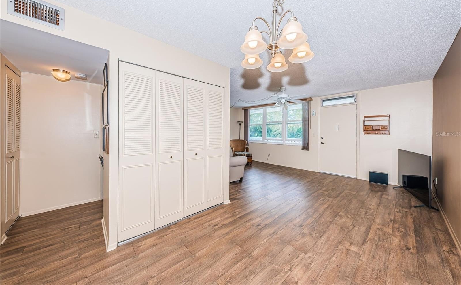 The interior is bright and versatile, featuring wood-look vinyl flooring throughout and a comfortably sized living area suited for both everyday living and entertaining. The kitchen includes stainless steel appliances, ample counter space, and a breakfast nook. The bedroom is generously sized, and the bathroom features a tiled shower.