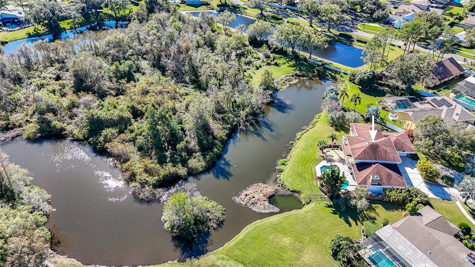 Set on an extraordinary 1.75-ACRE ESTATE LOT in one of CARROLLWOOD VILLAGE'S most Desired Neighborhoods, this remarkable residence commands a truly RARE SETTING sweeping POND and GOLF COURSE VIEWS, with the property extending beyond the far side of the pond—offering a level of Space, Privacy, and Ownership Seldom Found. Tucked away on a quiet CUL-DE-SAC, the home is approached by a Circular Driveway that immediately sets the tone for the grandeur within. Upon entry, a SPACIOUS FOYER welcomes guests with SOARING CEILINGSs, and a SKYLIGHT open to the Second Floor, filling the home with ABUNDANT NATURAL LIGHT a stunning first impression. Offering over 4,200 square feet of thoughtfully designed living space, the home features FIVE BEDROOMS plus a BONUS ROOM, ideal for Flexible Living, Entertaining, or Multi-Generational needs. The Kitchen is well appointed with an ISLAND featuring a BUILT-IN-OVEN and COOKTOP, a BREAKFAST BAR, WINE REFRIGERATOR, and a charming BREAKFAST NOK that Overlooks the Breathtaking Pond and Golf Course Views. The adjacent GREAT ROOM is both Inviting and Impressive, anchored by a WOOD-BURNING FIREPLACE that Creates a Warm and Welcoming Focal Point for Gatherings and Everyday Living. MULTIPLE LIVING AREAS and HARDWOOD FLOORING THROUGHOUT the Foyer, Dining Room, Living Room, Kitchen, Primary Suite, Bonus Room, and Hallways add WARMTH and TIMELESS ELEGANCE. The FIRST LEVEL includes TWO BEDROOMS, a FULL BATH, and a BONUS ROOM WITH A HALF BATH, providing Excellent Functionality and Privacy for guests or home office needs. UPSTAIRS, the PRIMARY SUITE is a True Retreat, offering a PRIVATE BALCONY DECK Overlooking the Spectacular Views, TWO WALK-IN CLOSETS, and a Spa-inspired bath with a JACUZZI TUB, Separate SHOWER, DUAL SINKS with an EXTENDED COUNTER and a BUILT-IN DRESSER. Two Additional Bedrooms are also located on the Second floor and SHARE ACCESS via SLIDING DOORS to their OWN PRIVATE BALCONY and DECK, Separate from the Primary Suite—an EXCEPTIONAL FEATURE RARELY FOUND.