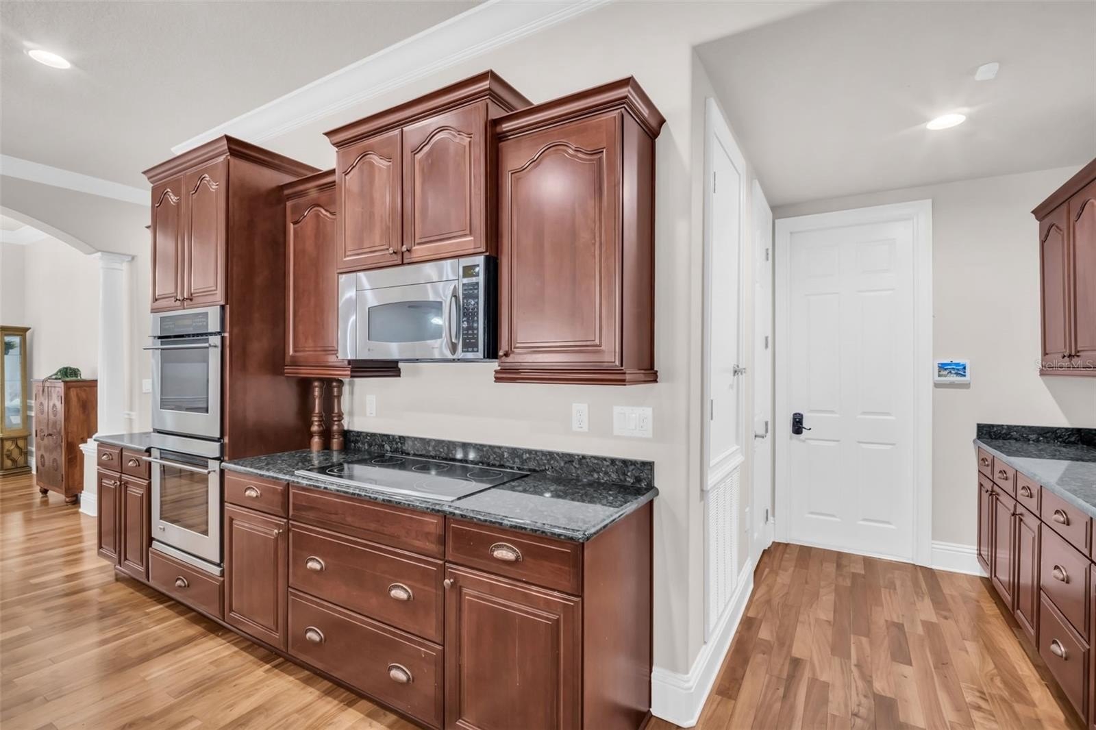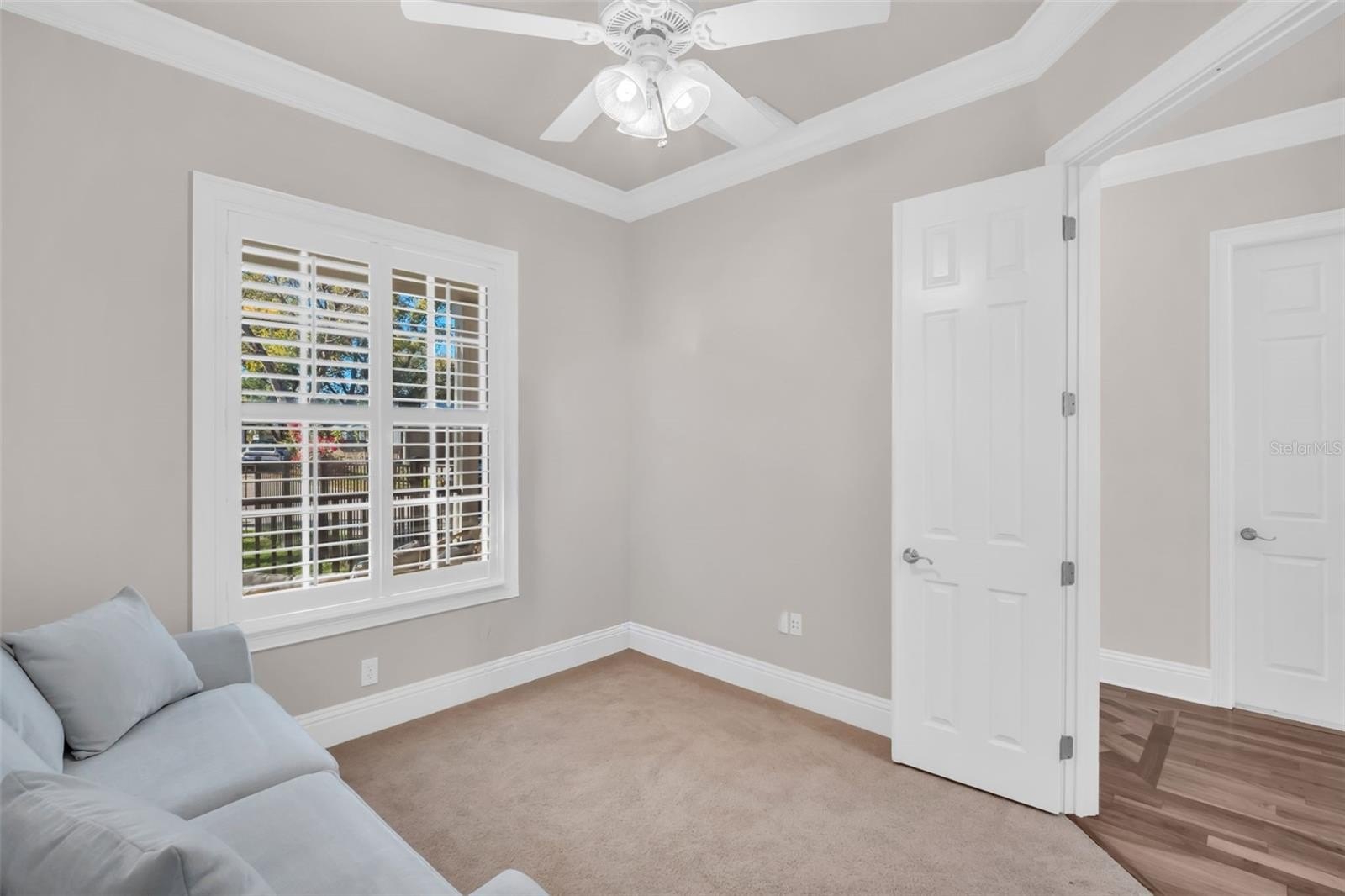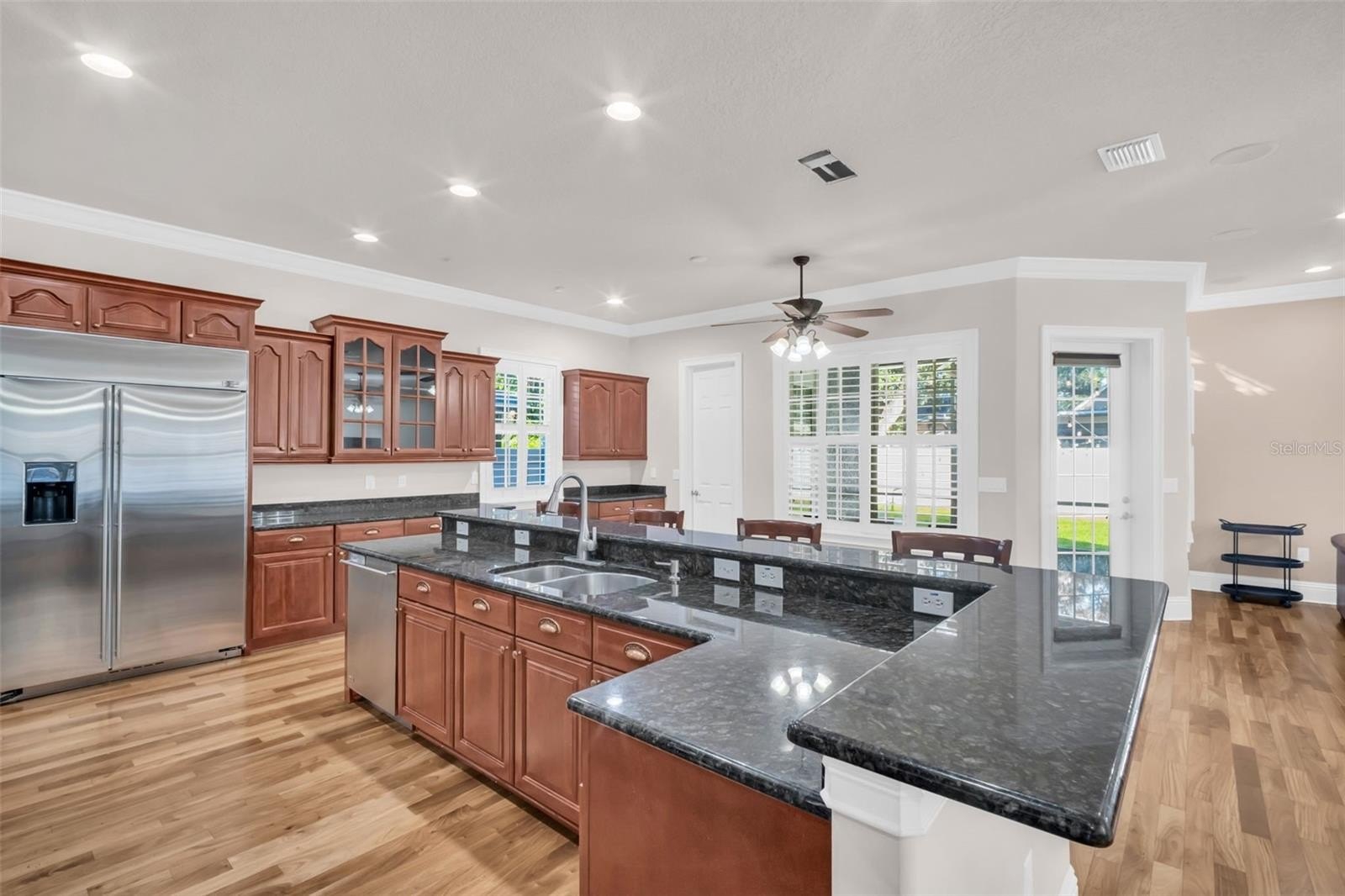 At the heart of the home, the kitchen impresses with abundant cabinetry, granite countertops, a breakfast bar, and high-end appliances—ideal for entertaining and daily living. Hardwood floors, high ceilings, crown molding, and plantation shutters add warmth and character throughout.