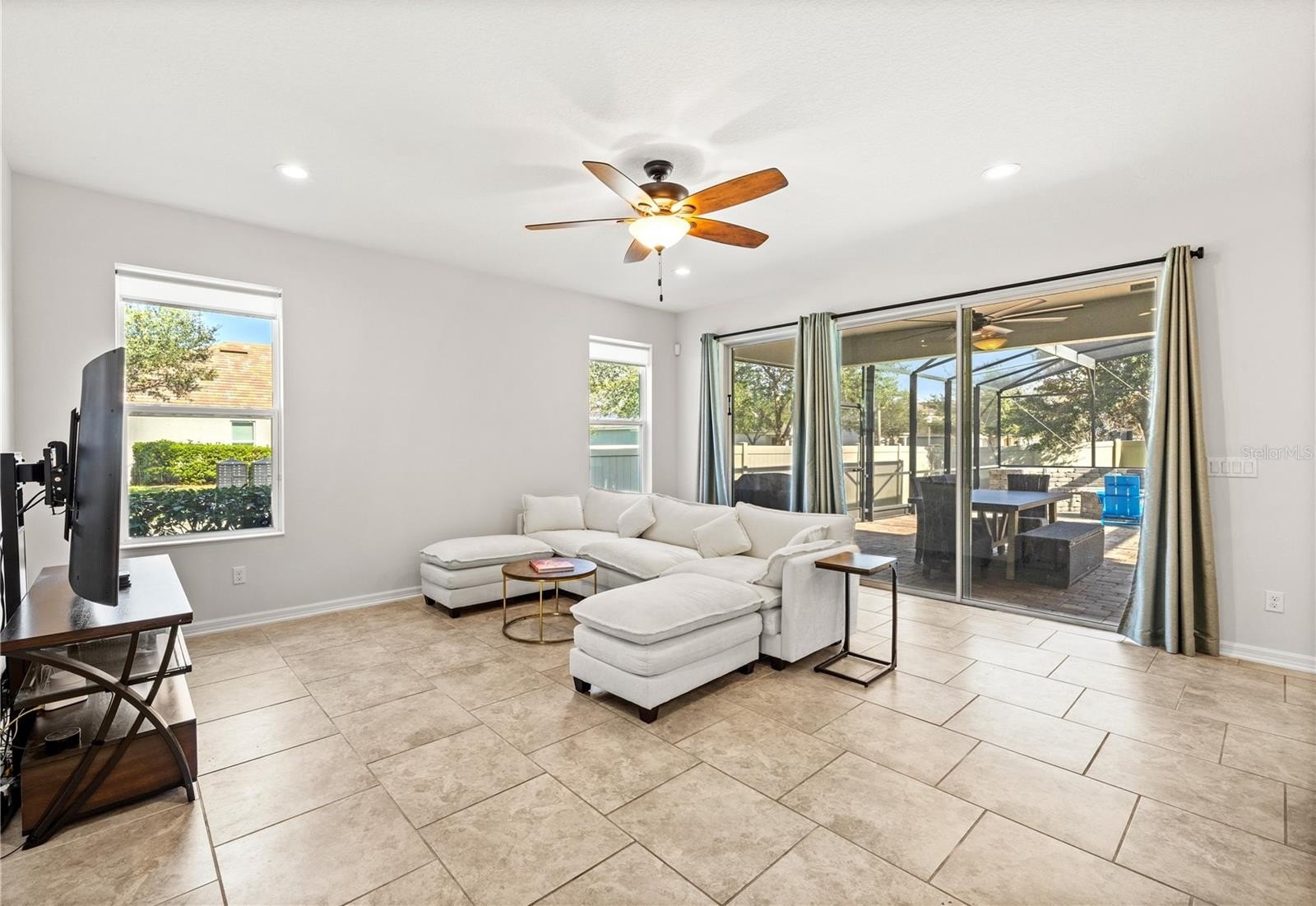 Step outside to a screened-in backyard designed for relaxation and entertaining, complete with a fire pit, private putting green, and custom screen lighting that sets the perfect evening ambiance.