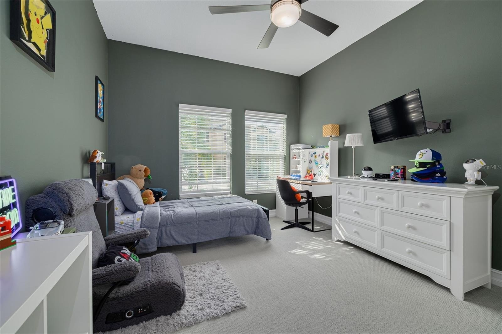 Inside, soaring 10-foot ceilings and an open-concept layout create a bright, airy atmosphere. The gourmet kitchen is both stylish and functional, featuring newer GE Café appliances, white quartz countertops, a spacious island, subway tile backsplash, and generous storage ideal for entertaining or everyday living. Tile flooring enhances the main living areas, with plush carpeted bedrooms providing comfort and warmth.