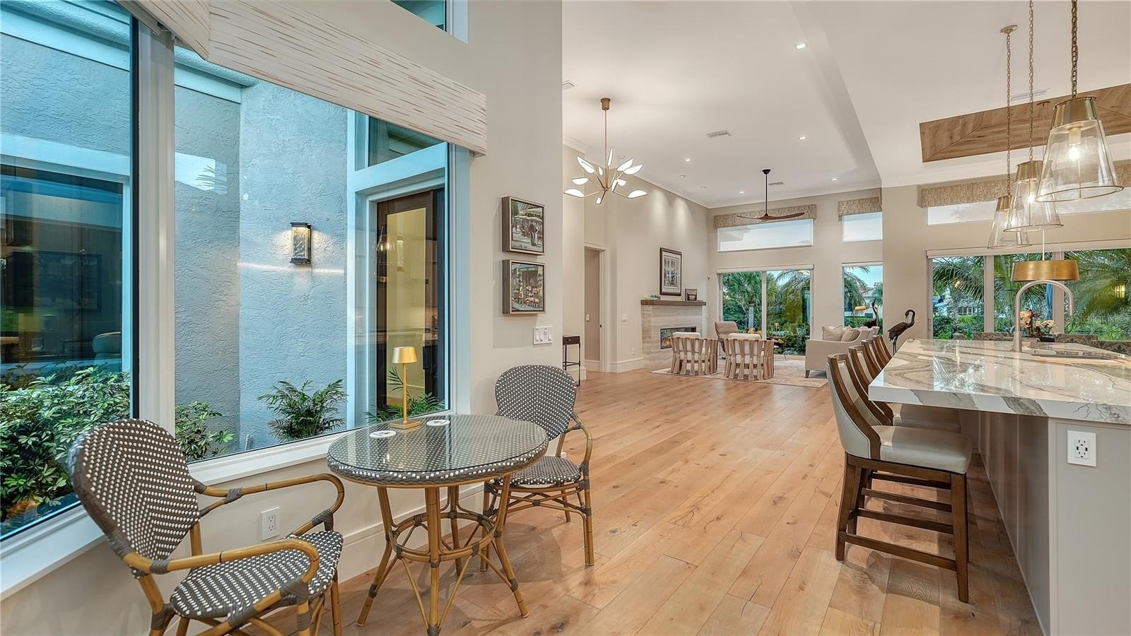 The kitchen features a dramatic 14-foot quartz-topped island, custom designer cabinetry by Sarasota Architectural Woodworking, and newer Thermador appliances, including a five-burner gas cooktop, dual built-in ovens, pull-out pantry cabinetry, and a 48-inch stainless sink. Adjacent informal dining and family spaces include aquarium-style glass windows and an oversized wet bar with a full-size wine cooler capable of storing over 100 bottles.