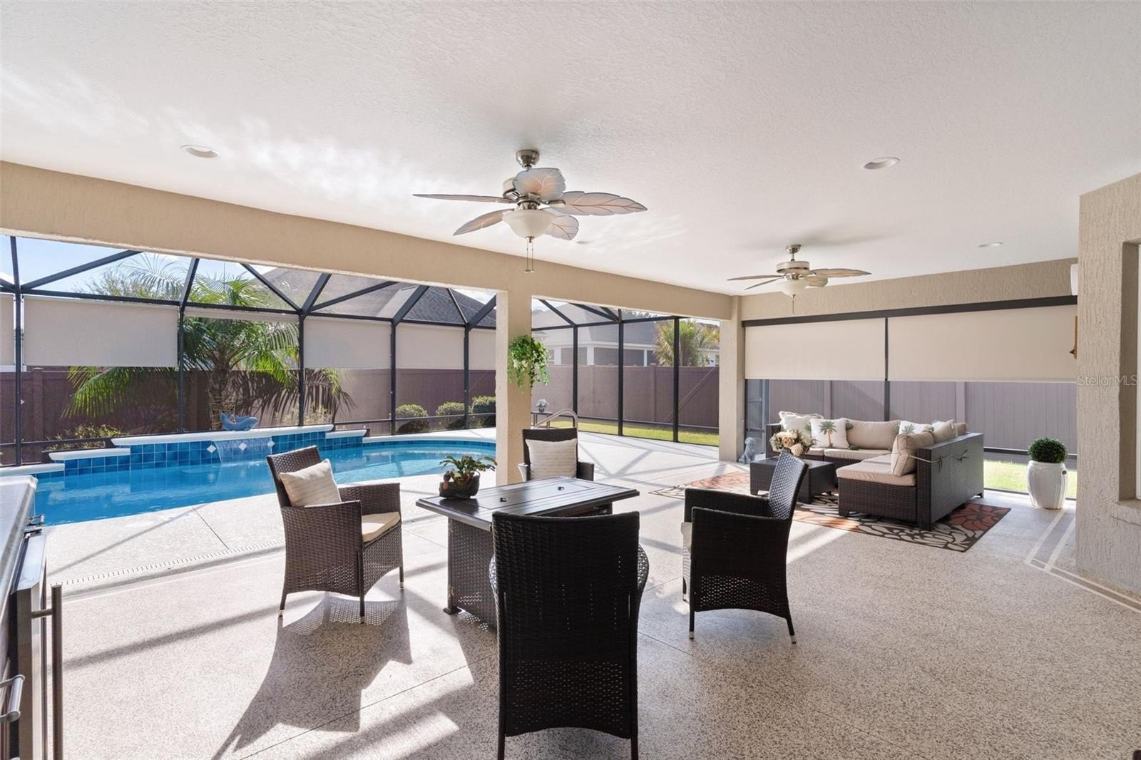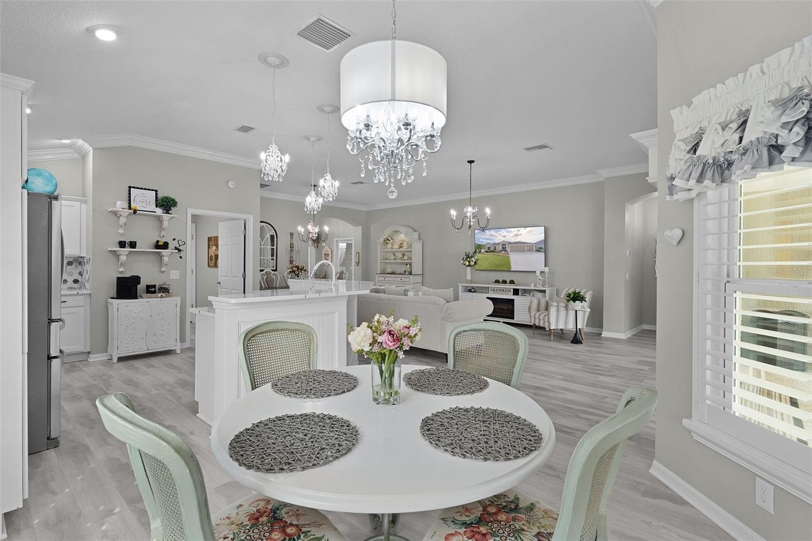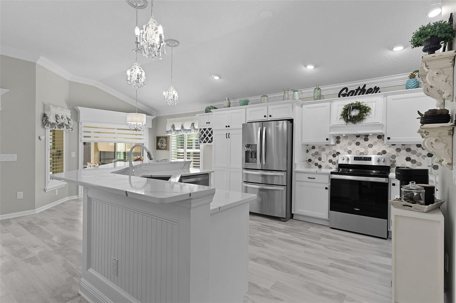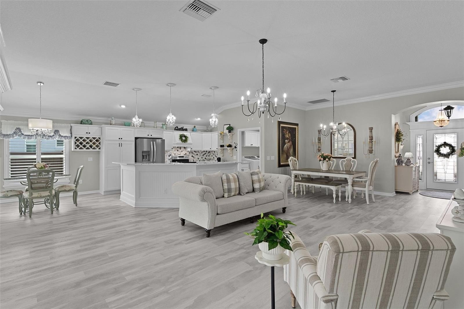 Welcome to this Stunning 4-bedroom, 2-bath Orchid floorplan, with a 2-car garage plus GOLF CART GARAGE, and SOLAR HEATED SALTWATER POOL, nestled within the VIBRANT, EXCLUSIVE, GATED ALL-AGE community of Oxford Oaks! NO BOND! Conveniently located JUST MINUTES from The Villages® Community and The Villages® Charter Schools, as well as 466 with an ABUNDANCE of shops (including the NEW COSTCO), restaurants, banks, medical and much more! Welcomed with Tropical Landscaping custom designed STACKED PAVERS, Elegant LEADED GLASS front door welcoming you into the generous Foyer of this STUNNING CONTEMPORARY OPEN CONCEPT and Views of the SALTWATER POOL and COVERED LANAI. FACTS about this house, COMPLETELY UPDATED in 2023 includes, MOHAWK LUXURY VINYL FLOORING, PAINTED Exterior Garage Door & Front Door, PAINTED ENTIRE INTERIOR, INSTALLED WHOLE HOUSE WATER FILTRATION, KITCHEN CABINETS REFACED, NEW QUARTZ COUNTERS & GRANITE SINK (kitchen), NEW QUARTZ BACKSPLASH, ALL NEW LIGHTING & CEILING FANS, BATHROOM CABINETS REFACED & COUNTERS, TUB & SHOWER REGLAZED & SEALED, TOILETS, FAUCETS & SHOWER HEADS, CUSTOM CLOSETS, IRRIGATION UPDATED & SERVICED, PLANTATION SHUTTERS & CUSTOM CORNICES, EXTERIOR PRIVACY SHADES, LAUNDRY ROOM SINK GLAZED PLUS FAUCET & CABINET REFACED, NEW SAMSUNG WASHER & DRYER. From the Living Room, CROWN MOLDING throughout, then step through SLIDING GLASS DOORS, adorned with CUSTOM CORNICES, and enjoy true Florida living in the EXPANSIVE SCREENED-IN SOLAR HEATED SALTWATER POOL, WATERFALL and COVERED LANAI. This spacious retreat offers plenty of room for lounging on the SECTIONAL SET (included), and year-round outdoor entertaining. Includes Storage CABINET WITH WINE REFRIGERATOR. (TV avail separate) PRIVACY SHADES on the Enclosure/Lanai and VINYL PRIVACY FENCE for added Privacy. Back inside, the Living Room is spacious with the beautiful MOHAWK LUXURY VINYL FLOORING throughout, CROWN MOLDING, CUSTOM CORNICES and CHANDELIER LIGHTING the perfect amount of elegancy. This is an Entertainers house with plenty of seating with a Formal Dining area and a Dinette space. The Kitchen has QUARTZ COUNTERS with room for Barstools, WINE RACK, PANTY (Pull-outs), STAINLESS STEEL APPLIANCES, GRANITE SINK, and CUSTOM RANGE HOOD. Countertop Microwave included. Entering the Primary Bedroom is a retreat in itself, featuring TRAY CEILING, CHANDELIER FAN/LIGHT. The Primary STYLISH en-suite bathroom features a CUSTOM CLOSET, SHAKER cabinetry, DOUBLE vanities, a TILED ROMAN-STYLE WALK-IN ZERO THRESHOLD shower, LINEN closet, and a separate water closet. The other Three Bedrooms, each featuring VAULTED CEILINGS, PLANTATION SHUTTERS, and a GUEST Bathroom. POCKET DOOR in hallway creating a PRIVATE GUEST WING. An INTERIOR Laundry Room, has a UTILITY SINK and Cabinets plus 2023 SAMSUNG WASHER & DRYER included. Large TWO-CAR GARAGE PLUS GOLF CART GARAGE. This Concrete Block Home also has SEAMLESS GUTTERS, and IRRIGATION. Oxford Oaks is a non-age-restricted, Golf Cart friendly community built by The Villages®. EXCLUSIVE AMENITIES INCLUDE: a large Resort-Style Pool, Pickle Ball Courts, Tennis Courts, Basketball Court, Outdoor Exercise Equipment, and a fabulous Playground! Lake Sumter Landing (5.4 miles) and Brownwood (7 miles) Squares in The Villages® various dining options, and nightly entertainment 365 days a year. DON'T MISS YOUR OPPORTUNITY! Private Showing or Virtual Tour!