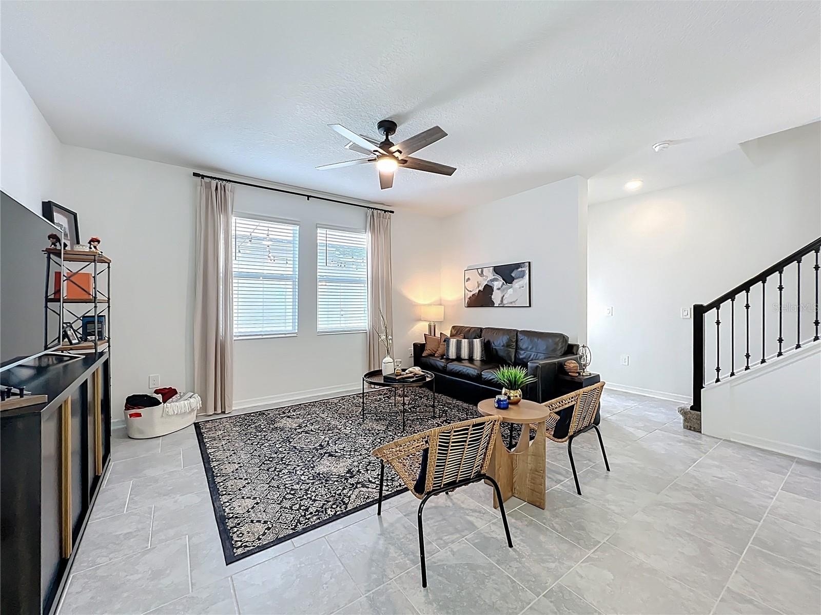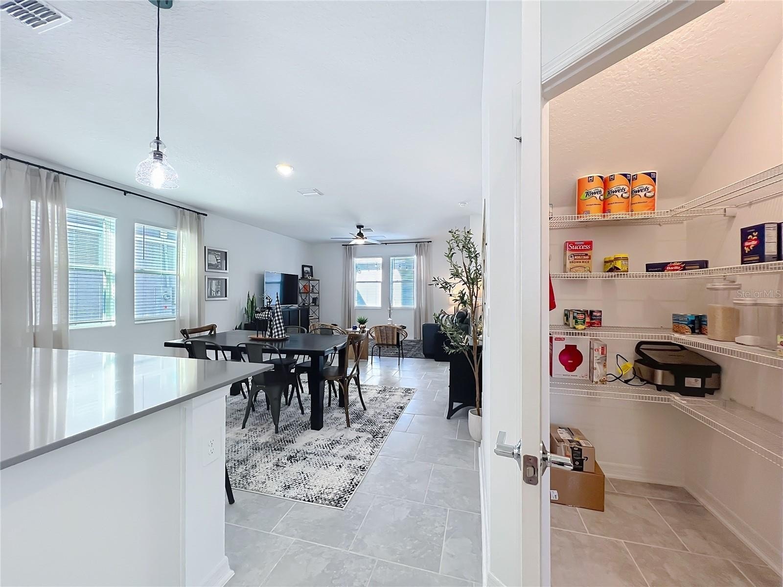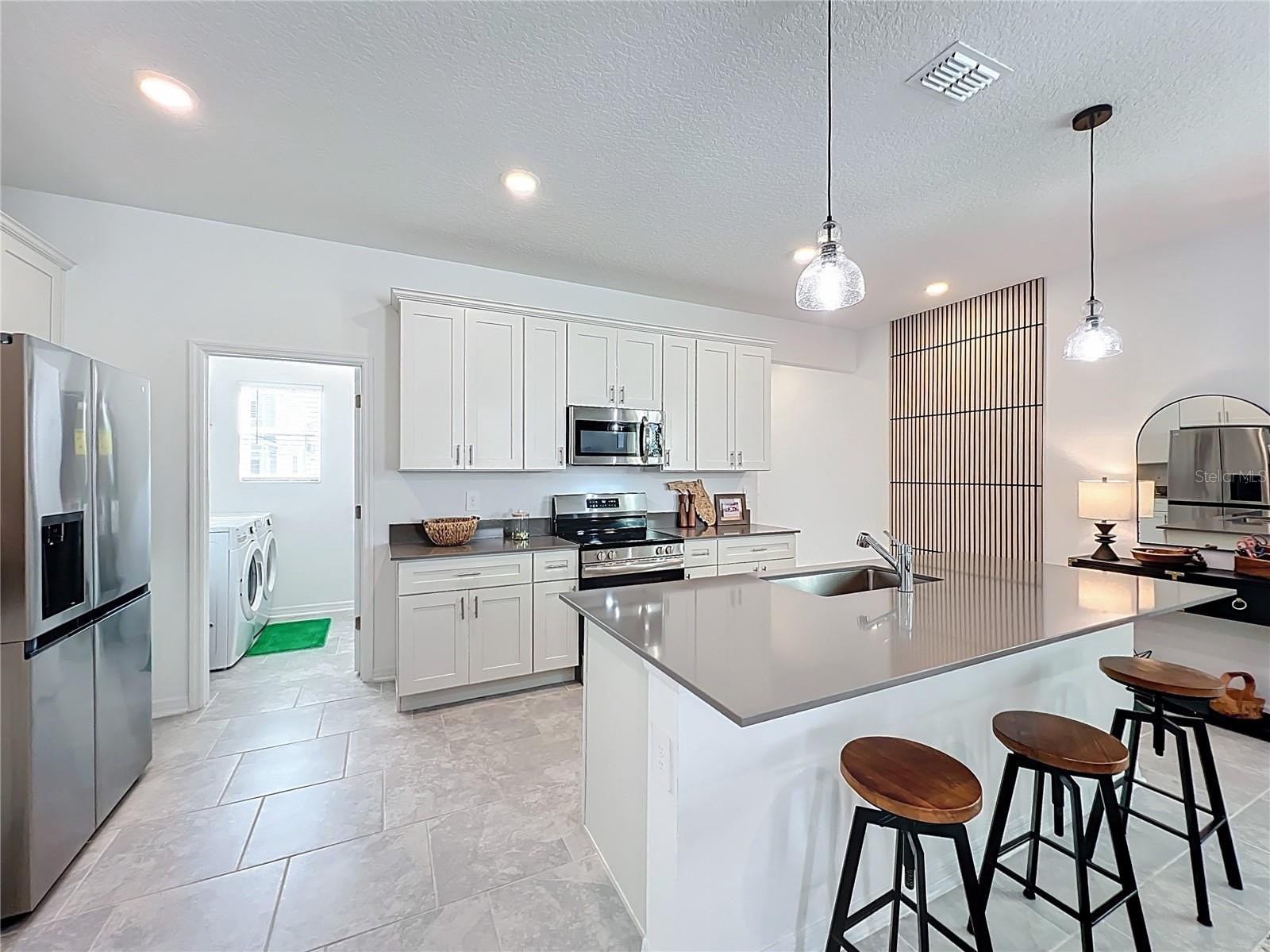 This stunning nearly-new home (built in 2024) presents like a model home and offers the ultimate in modern, energy-efficient living within a forward-thinking solar-powered master-planned community in the booming Kelly Park area of Apopka, Florida. Spanning 1,784 square feet, this beautifully designed 3-bedroom, 2.5-bathroom residence includes a convenient 2-car garage and exudes pride of ownership from the moment you arrive. Step inside to an incredibly open and airy downstairs layout with soaring 10-foot ceilings and elegant staggered neutral 18-inch tile flooring throughout the main living areas. The fantastic kitchen is a true highlight, seamlessly opening to the spacious Dining Room and Living Room for effortless entertaining. It features a massive island with breakfast bar seating, stylish pendant lighting, luxurious quartz countertops, soft-close white shaker-style cabinets topped with crown molding, a large single-basin sink, premium stainless steel appliances, a generous walk-in pantry, and a decorative accent wall for added flair. A practical laundry room comes complete with washer, dryer, and ample shelving, while a powder room with a sleek pedestal sink adds convenience on the main level. Ascend the elegant staircase with iron balusters to the upper level, where you'll find the luxurious primary suite boasting an enormous walk-in closet and a spa-like en-suite bathroom featuring a walk-in shower, dual-sink vanity with quartz counters, a private toilet closet, and a linen closet. Two additional generously sized bedrooms share a Jack-and-Jill bathroom with a tub/shower combo, quartz vanity, and linen storage. All bedrooms include ceiling fans for year-round comfort. Outside, relax and entertain on your private 21x21 paved patio/courtyard, beautifully accented with market lighting — the perfect spot for evening gatherings under the stars. Community perks include a refreshing swimming pool, expansive open green spaces, and a network of multi-use trails ideal for walking, biking, or enjoying Florida's natural surroundings. Nature lovers will appreciate being just minutes from the crystal-clear, 72-degree waters of Wekiwa Springs State Park and the iconic Rock Springs at Kelly Park — offering tubing, swimming, paddling, and serene outdoor adventures in one of Central Florida's premier natural gems. The location is primed for even more growth with the massive Wyld Oaks development (215 acres) underway right nearby - promising a vibrant mixed-use hub featuring entertainment venues, premier shopping, diverse dining, hotels, public parks, nature trails, a top-tier dog park, and more. This will create an exciting live-work-play destination in your backyard! With quick access to FL-429 and US-441, you're just a short drive from Orlando's world-famous theme parks, beaches, downtown attractions, and major employers. This like-new, move-in-ready gem combines contemporary luxury, eco-conscious design, and unbeatable future potential in one of Apopka's hottest up-and-coming areas — schedule your showing today and secure your spot in Florida's next premier community!