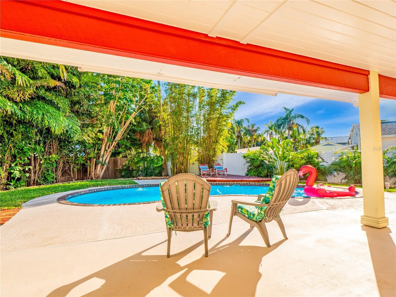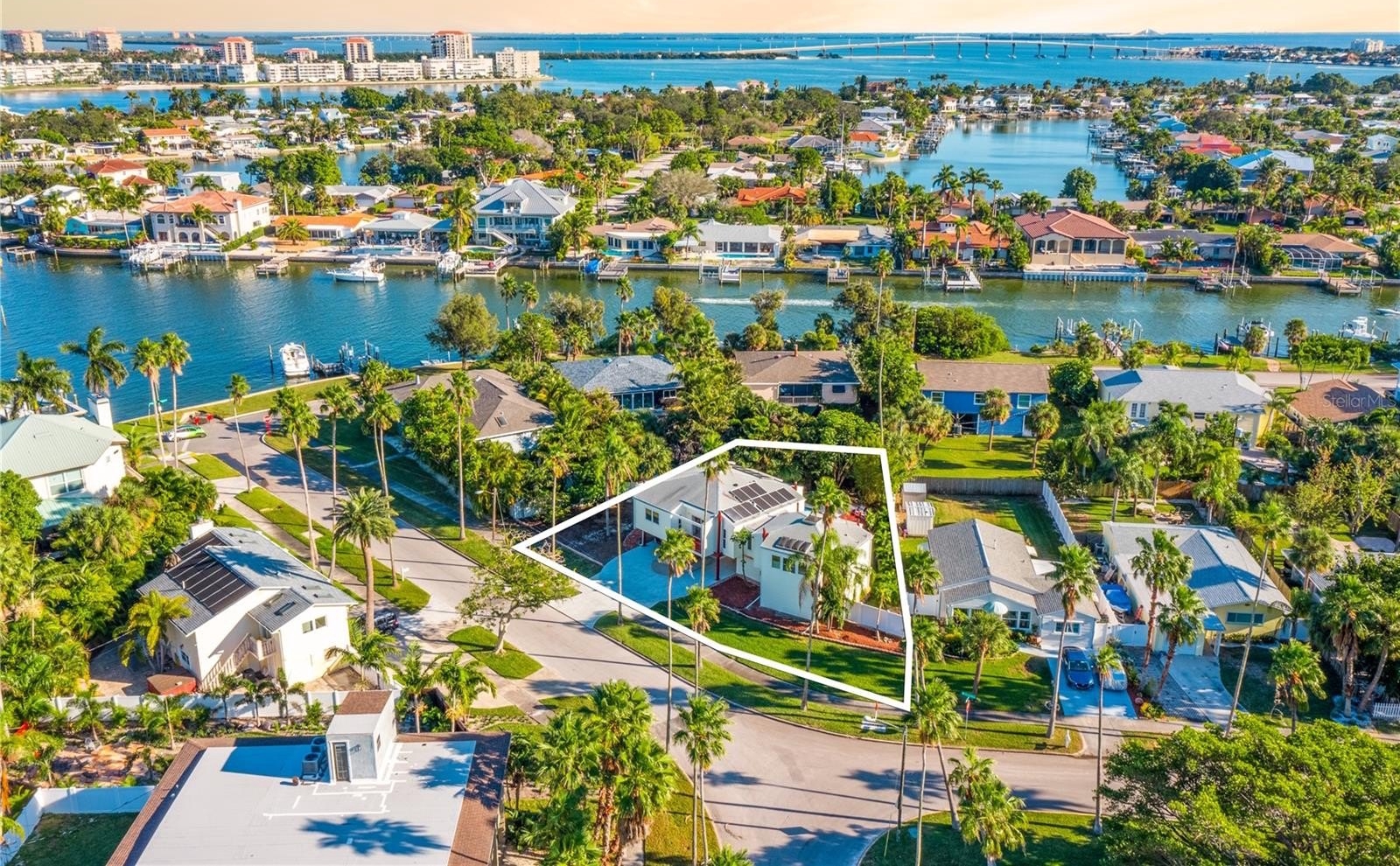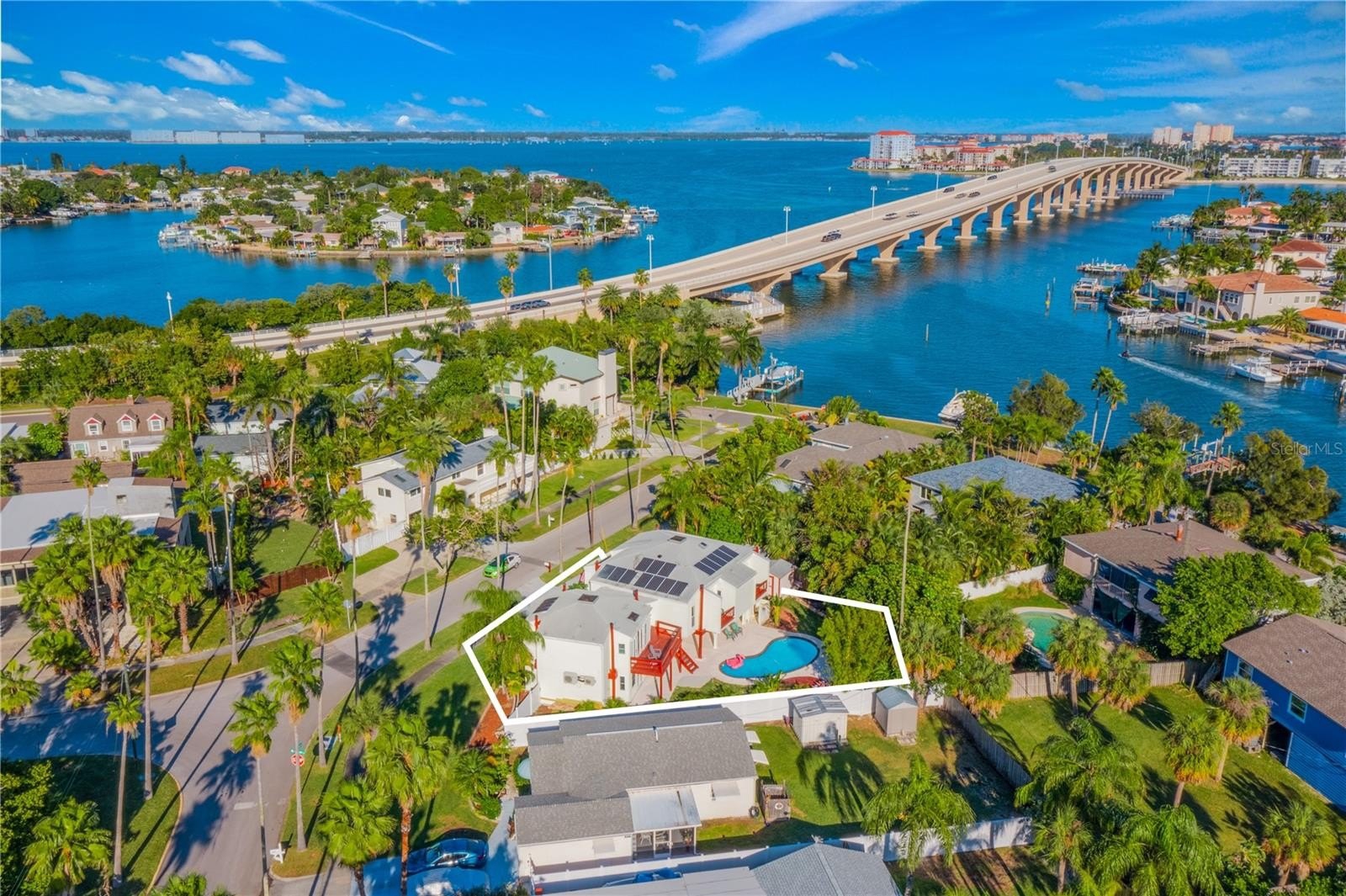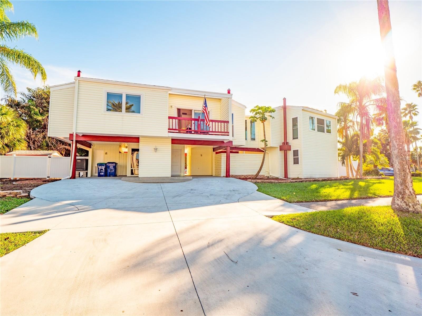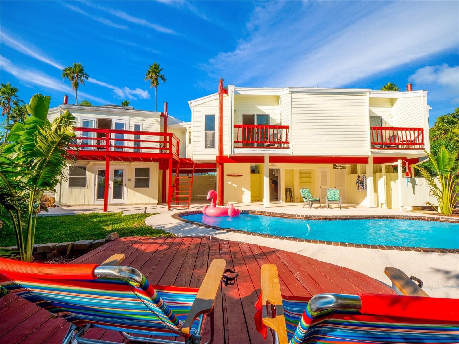 Welcome to the Pier House, a stunning executive home now for sale in the exclusive Don Cesar neighborhood of St. Pete Beach. This uniquely designed residence offers a perfect blend of luxury and tranquility, with its elevated position providing a treehouse-like ambiance. Inside, the open-concept living area is highlighted by vaulted ceilings and a central skylight, offering an abundance of natural light. The chef’s kitchen, complete with quartz countertops and high-end appliances, is a culinary enthusiast's dream. The home features three spacious en-suite bedrooms, each with a private bath and balcony, while the master suite boasts breathtaking views of the Pass-a-Grille Channel. Step outside to enjoy a private pool, expansive backyard with southern exposure, and a lush garden. The outdoor space is perfect for relaxation and entertainment, featuring a propane BBQ, half bathroom, and sunbathing deck. Located near exclusive beaches and the historic Pass-A-Grille neighborhood, this property also offers convenient access to downtown St. Petersburg, just 15 minutes away, where you'll find world-class dining and cultural attractions. Experience resort-like living in this remarkable St. Pete Beach home, where every day feels like a getaway.