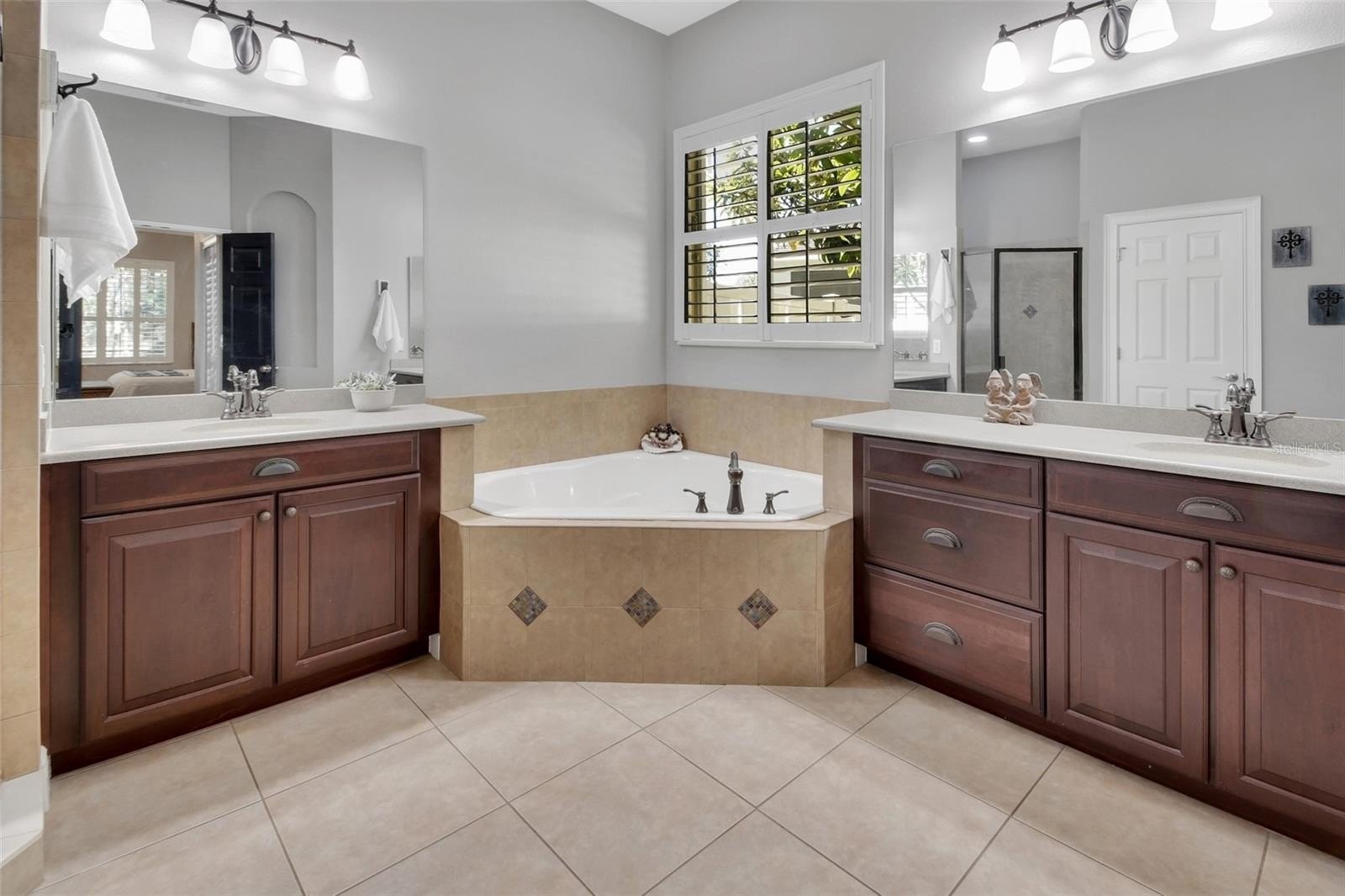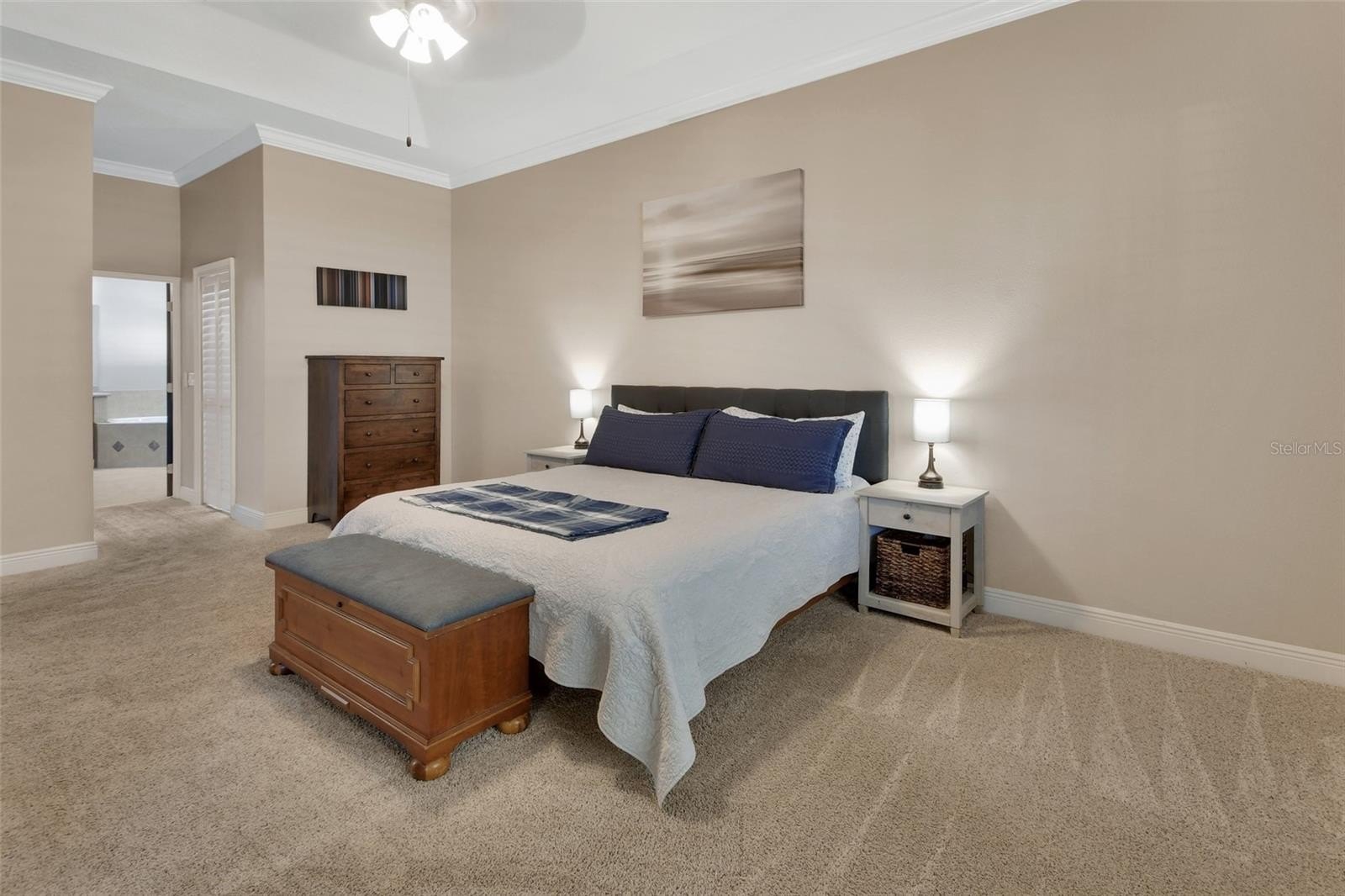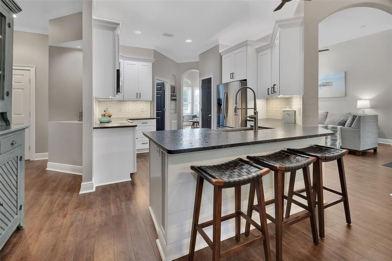 The chef’s kitchen was fully remodeled and is a true showstopper, featuring high-end stainless steel appliances, 42" solid wood soft-close cabinetry, subway tile backsplash, and leather-pressed granite countertops. A desirable three-way split floor plan offers privacy, with an additional bedroom and bonus room upstairs. Custom 3½" plantation shutters are found throughout the home.
