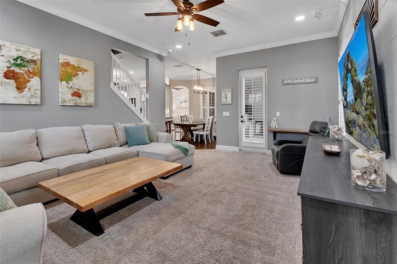 The home showcases three distinct living areas—a family room, formal living room, and bonus room—providing exceptional flexibility for entertaining, relaxing, or multi-generational living. Upon entry, you are welcomed by an open, light-filled floor plan enhanced by soaring ceilings, elegant archways, and oversized 8' interior doors throughout.