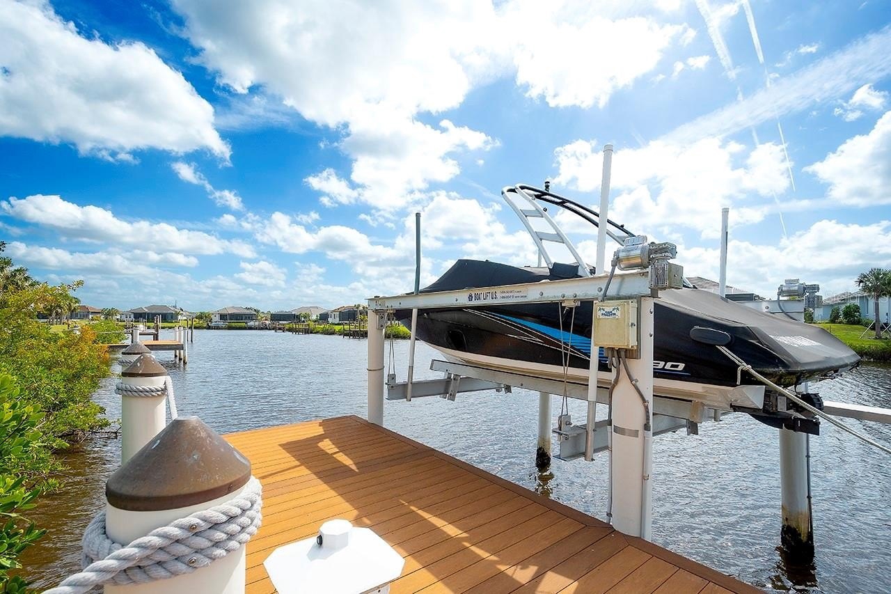 This home is truly "move in" ready. Arthur Rutenberg Aruba model--- meticulously maintained. Great room, dining room, 3 bedrooms, den, large laundry room, 3.5 car garage, salt water pool, firepit and outdoor kitchen with refrigerator, 2 burner stove, grill and sink, wine frig, fenced in dog run, double crown molding thru out home, paver driveway and front porch, hardwood floors in the den and bedrooms, tile floors in great room, dining room, and kitchen. Located on a canal that leads to the Manatee River and then to the Gulf of Mexico. It has a private 10,000 pound lift. The boat dock has water and electricity. The Islands on the Manatee River is a gated golf course community with easy access to top rated schools, dining, shopping and just minutes to Lakewood Ranch. BONUS-- this community has NO CDD fee. Besides having your own boat dock in your yard, the community has it's own community center--with many activities and opportunities to meet and socialize with your neighbors. Another nice feature-- this home has a well for irrigation-- this saves you a lot of money on your water bill-- also has a 80 gallon high efficient hot water heater and a whole house water softener,