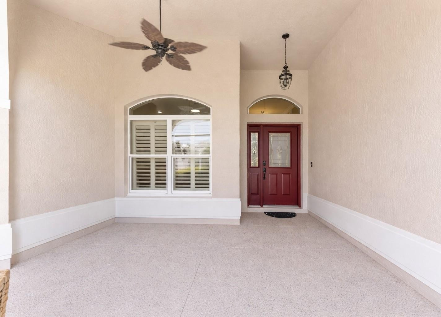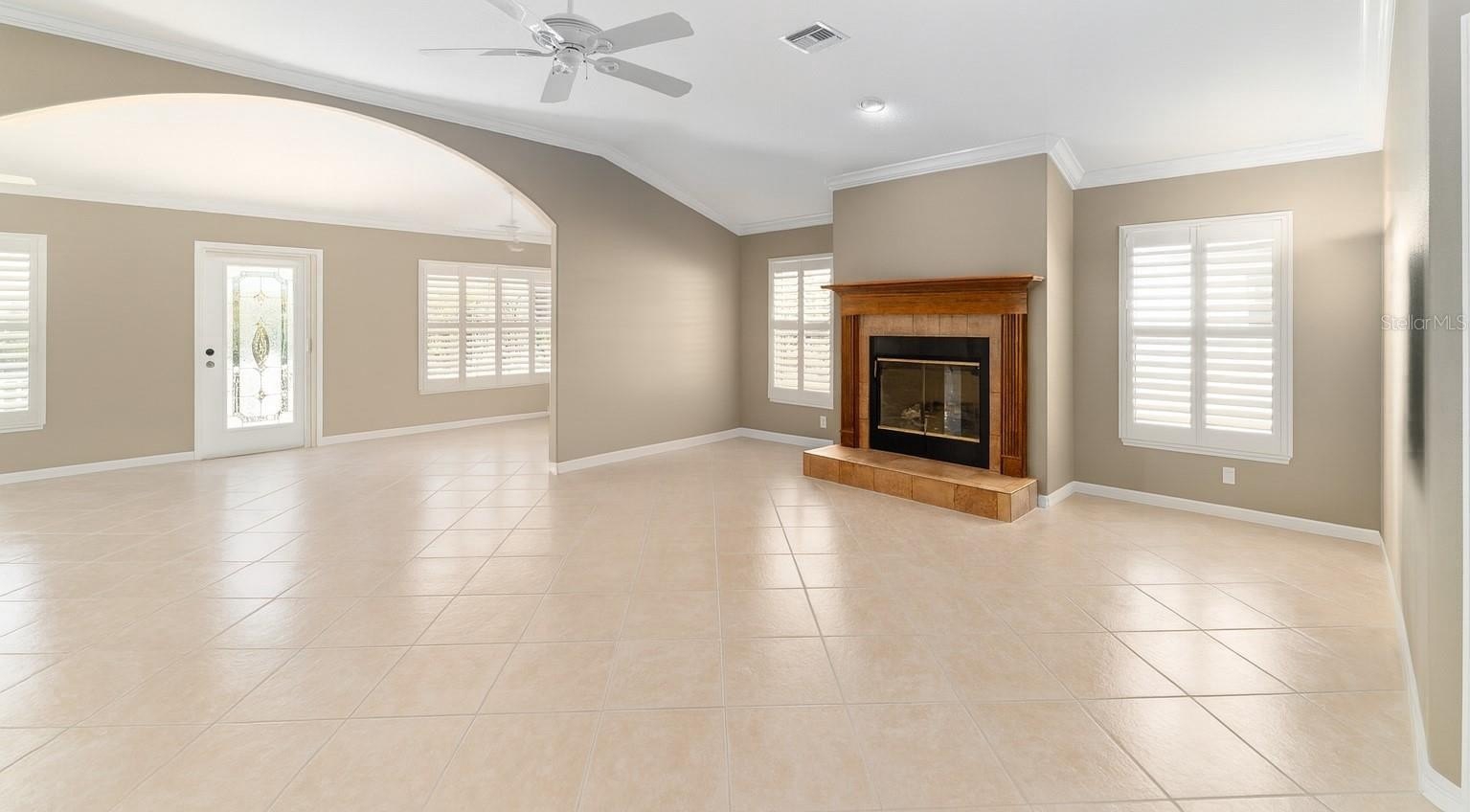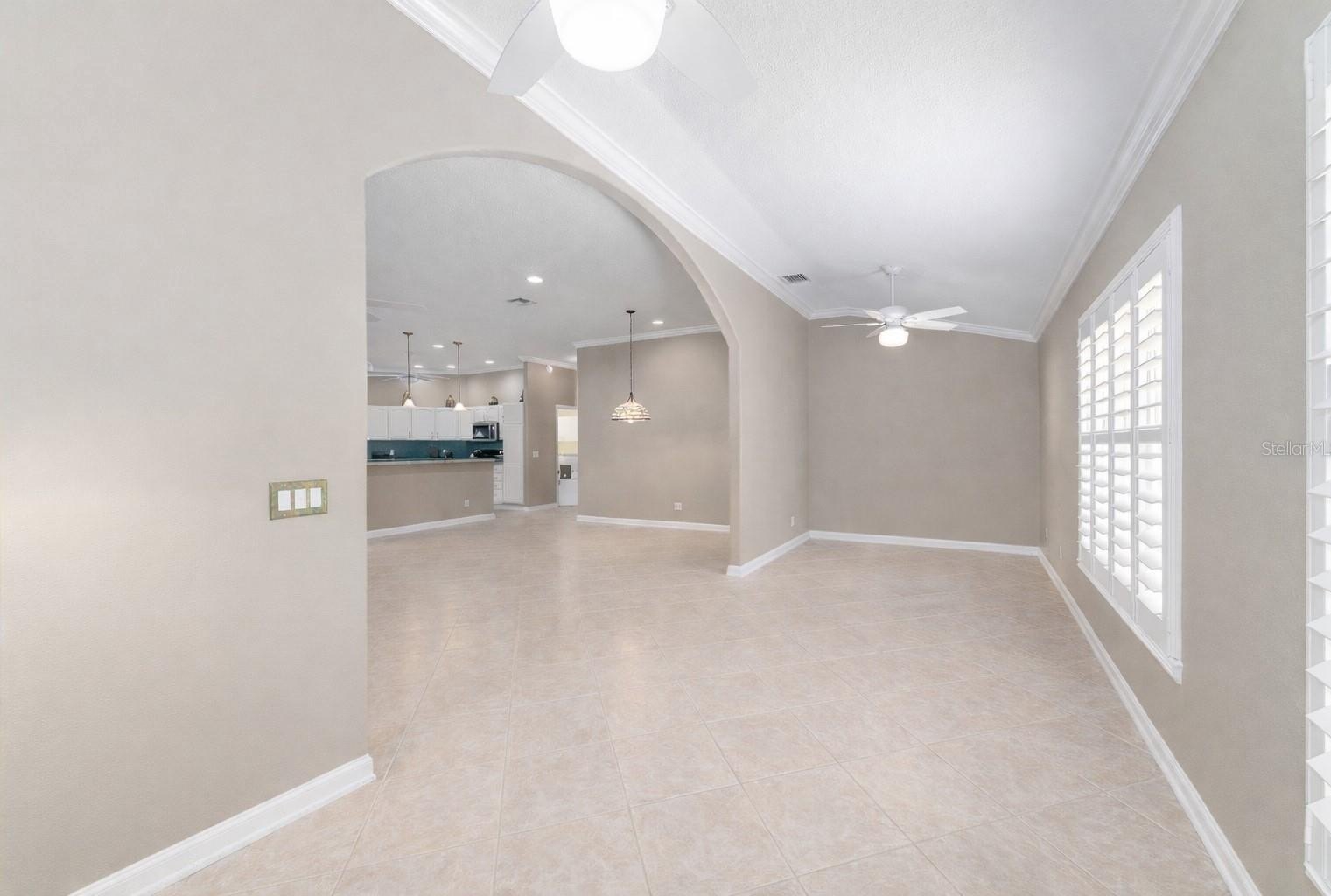 The curb appeal is so inviting with recently painted exterior/trim, painted driveway, and manicured trees/shrubs. You initially enter a large Screened Front Porch (165 SQ FT) which allows for relaxation amidst the beautiful landscaping or for entertaining guests. As you enter the home you'll notice the vaulted ceilings, round wall corners and other luxury upgrades. There is extensive CROWN MOULDING and PLANTATION SHUTTERS throughout this home. There are TWO SOLAR TUBES, updated Ceiling Fans and Fixtures and NO POPCORN CEILINGS! The kitchen boasts beautiful CORIAN countertops, updated Cabinets, and newer STAINLESS STEEL Appliances. There is updated kitchen lighting and ROLL OUTS in the kitchen cabinets for easy access. As a bonus, there are GAS HOOK-UPS, behind the stove and the clothes dryer! The Dining/ Living Room area is extra large for entertaining and comfortable seating with a GAS FIREPLACE for ambiance. The Primary Bedroom has beautiful laminate flooring, a vaulted ceiling, TWO WALK-IN CLOSETS and a large en-suite with an updated WALK-IN SHOWER and DOUBLE SINKS. The guest room has an Oversized Closet and is very inviting and bright. The 3rd bedroom or den (no closet) is set up as an OFFICE but has a MURPHY BED for additional guests. There is a convenient bathroom between these two bedrooms as well as a linen closet.