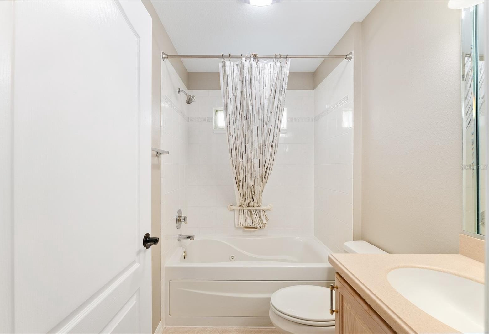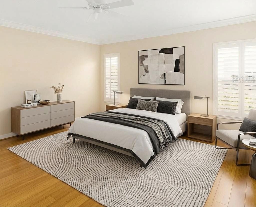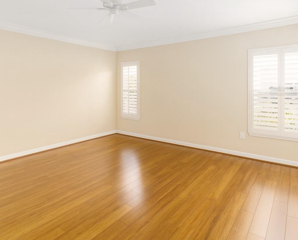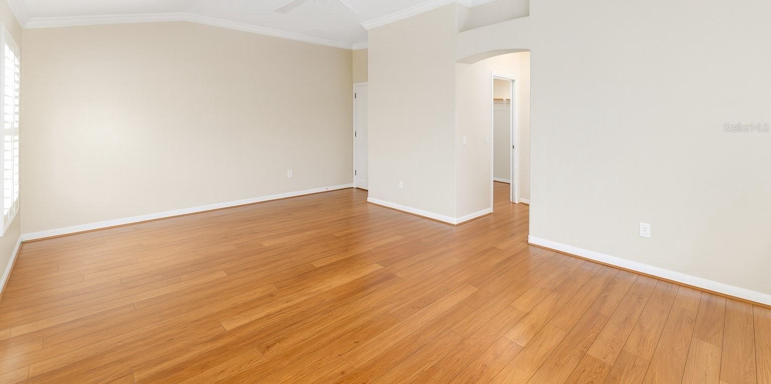 The curb appeal is so inviting with recently painted exterior/trim, painted driveway, and manicured trees/shrubs. You initially enter a large Screened Front Porch (165 SQ FT) which allows for relaxation amidst the beautiful landscaping or for entertaining guests. As you enter the home you'll notice the vaulted ceilings, round wall corners and other luxury upgrades. There is extensive CROWN MOULDING and PLANTATION SHUTTERS throughout this home. There are TWO SOLAR TUBES, updated Ceiling Fans and Fixtures and NO POPCORN CEILINGS! The kitchen boasts beautiful CORIAN countertops, updated Cabinets, and newer STAINLESS STEEL Appliances. There is updated kitchen lighting and ROLL OUTS in the kitchen cabinets for easy access. As a bonus, there are GAS HOOK-UPS, behind the stove and the clothes dryer! The Dining/ Living Room area is extra large for entertaining and comfortable seating with a GAS FIREPLACE for ambiance. The Primary Bedroom has beautiful laminate flooring, a vaulted ceiling, TWO WALK-IN CLOSETS and a large en-suite with an updated WALK-IN SHOWER and DOUBLE SINKS. The guest room has an Oversized Closet and is very inviting and bright. The 3rd bedroom or den (no closet) is set up as an OFFICE but has a MURPHY BED for additional guests. There is a convenient bathroom between these two bedrooms as well as a linen closet.