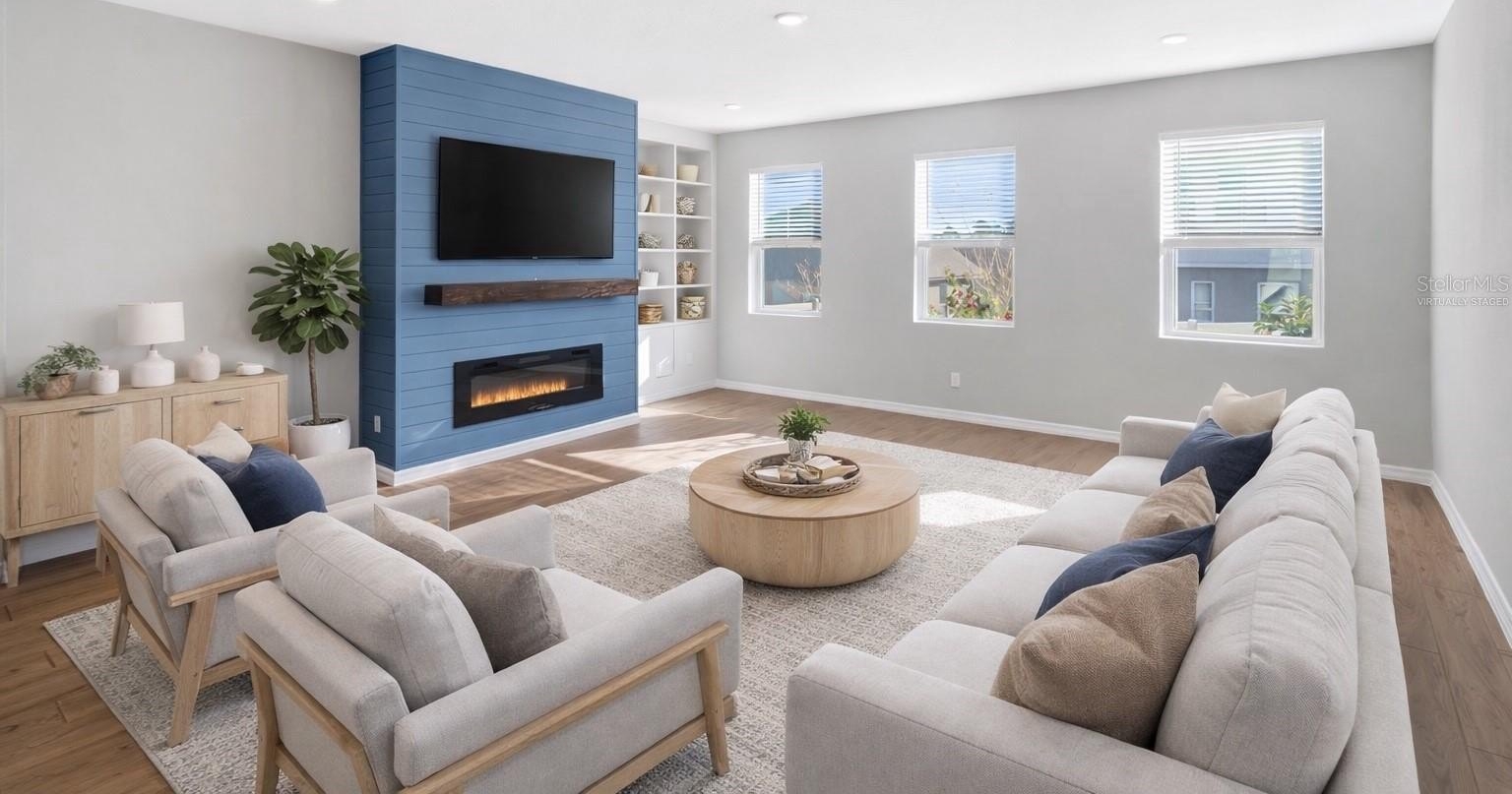 From the moment you arrive, the covered front porch welcomes you in, setting the tone for the elevated finishes found throughout the home. Inside, you’ll discover upgrades at every turn, including a striking built-in electric fireplace that anchors the main living area and creates a warm, modern focal point for everyday living and entertaining.