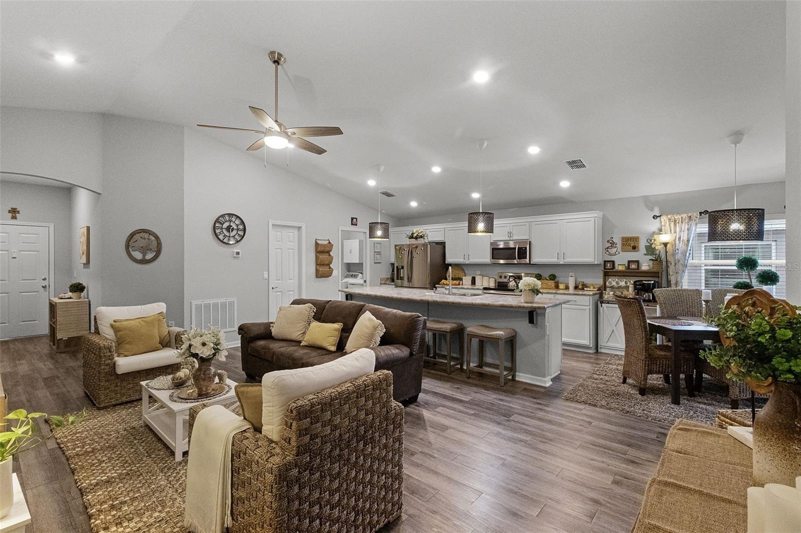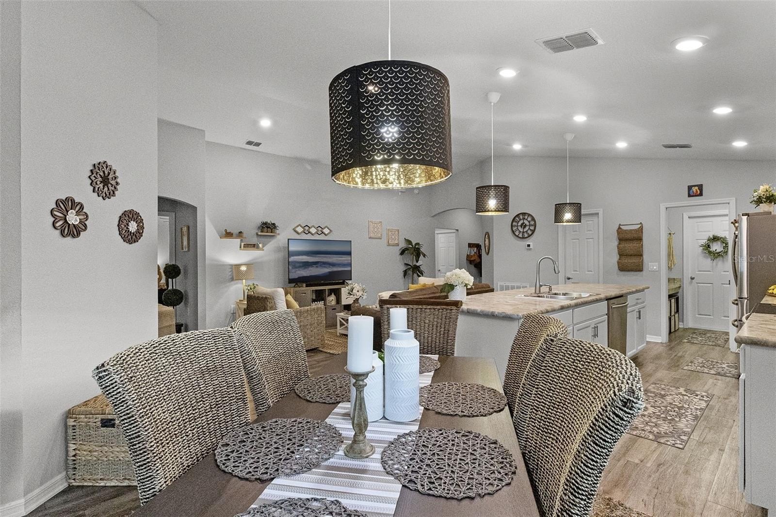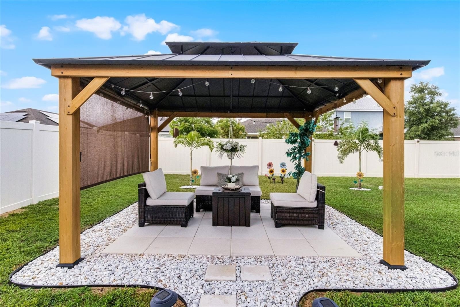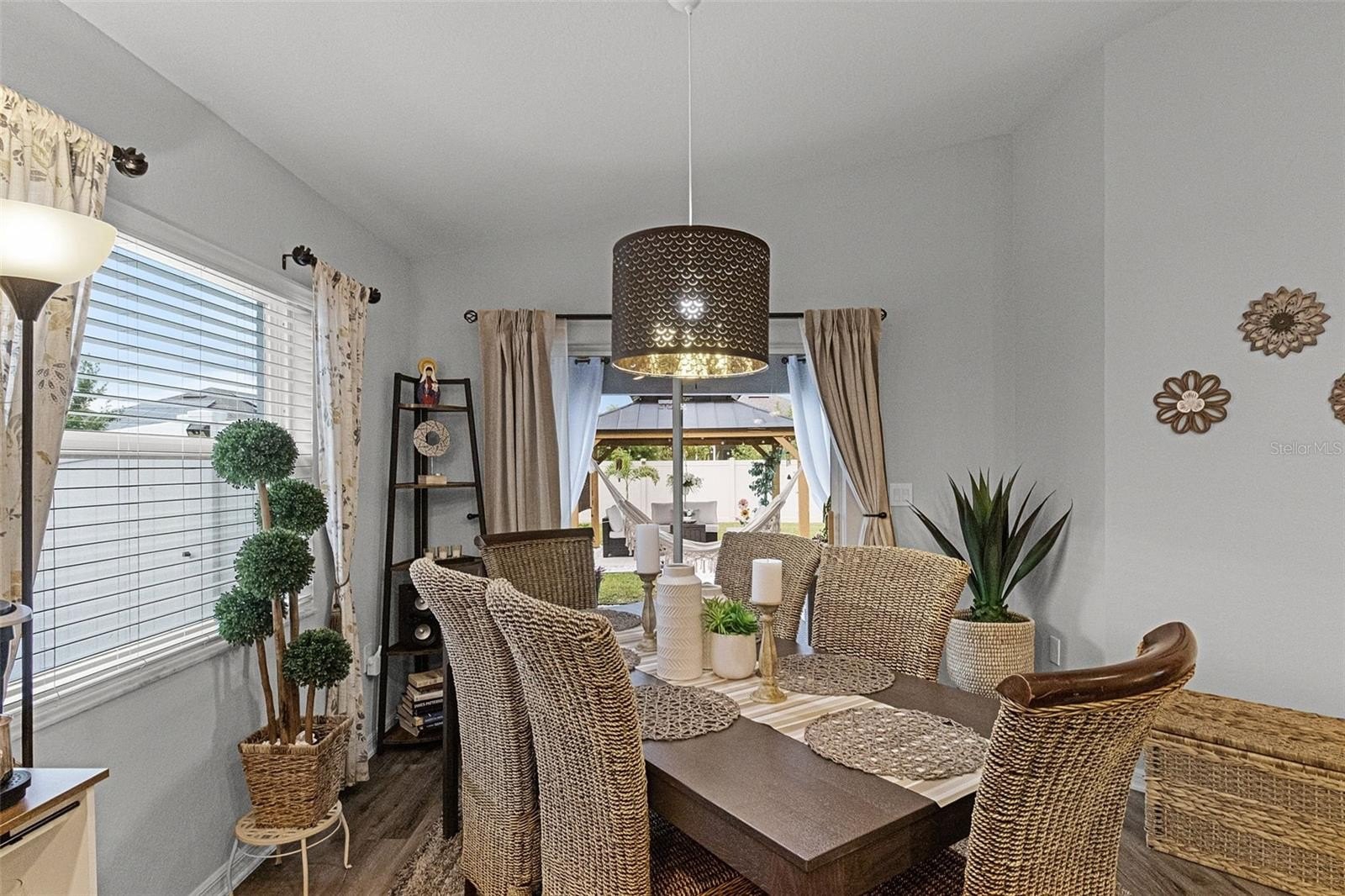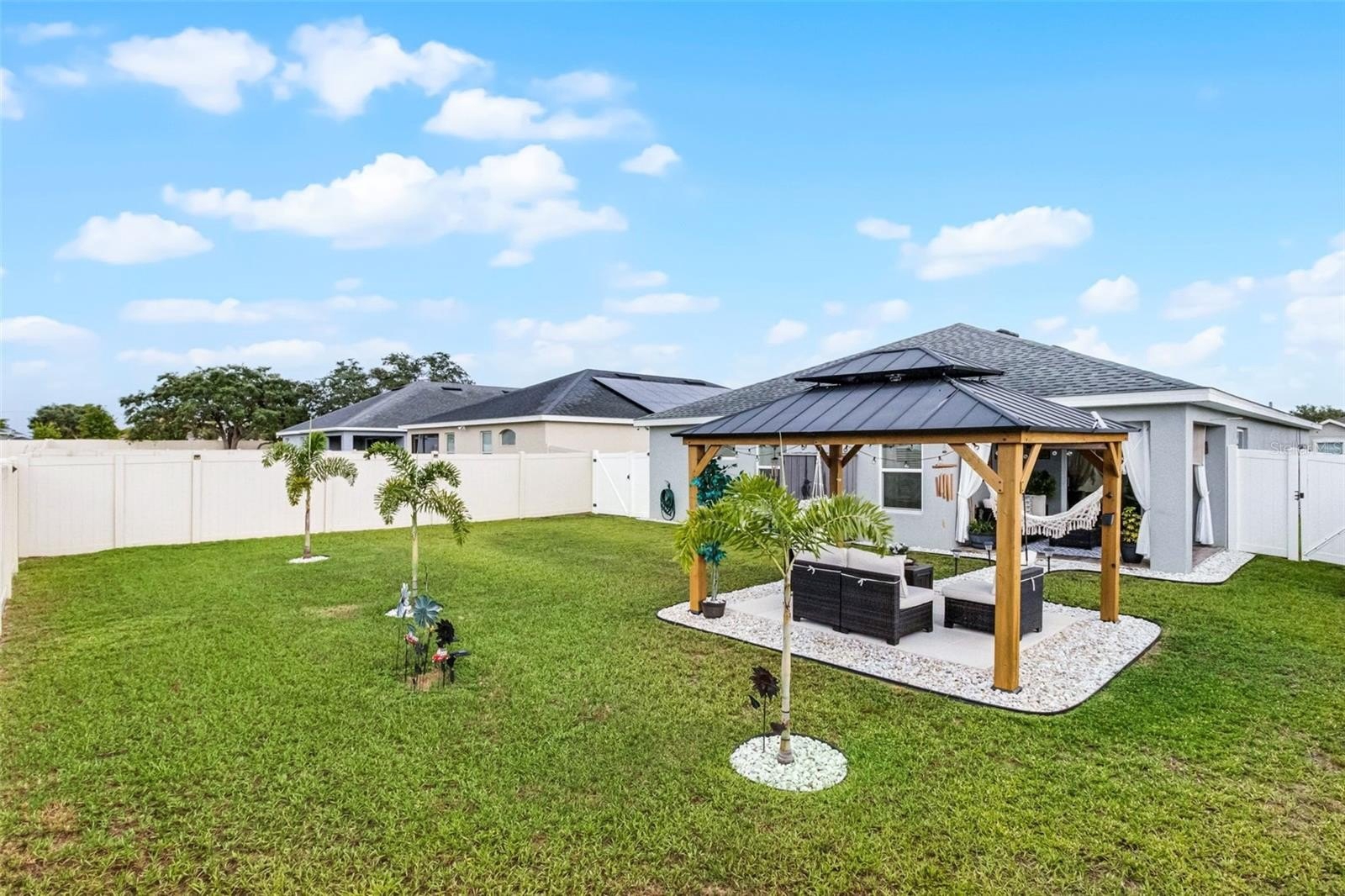 SOLAR PANELS WILL BE PAID OFF BY SELLERS AT CLOSING. Also, this house is eligible for an ASSUMABLE LOAN OF 2.25%. Why wait for a house to be build when this one is ready to move-in and to make it your home? Owners are highly motivated! Welcome to this absolutely stunning 4 bedroom, 2 bathroom home nestled in the highly sought-after community of Monticelli at Tower Lake. Immaculately maintained and full of charm, this residence offers a harmonious blend of modern upgrades, spacious living, and serene outdoor spaces, making it truly one of a kind. As you arrive, you'll be instantly captivated by the lush, manicured landscaping, a spacious 2-car garage, and a welcoming front porch, the prime spot to sip your morning coffee and enjoy the quiet surroundings. Step inside to discover easy-care laminate flooring throughout (NO carpet!), soaring high ceilings, and a bright, open-concept floor plan accented by stylish light fixtures that bring a touch of elegance to every space. At the heart of the home is the gourmet chef’s kitchen—a true showstopper featuring ample cabinetry, unique solid wood countertops, sleek stainless steel appliances, and a massive island with bar seating. Whether you're whipping up weeknight dinners or hosting elaborate gatherings, you'll find everything you need right at your fingertips. Adjacent to the kitchen, the elegant dining area overlooks the backyard through a large set of sliding glass doors, flooding the space with natural light and providing a gorgeous backdrop for memorable meals with family and friends. The private primary suite is tucked away for maximum relaxation, featuring an oversized walk-in closet and a luxurious en-suite bathroom with dual vanities, a soaking tub, and a walk-in shower—your own spa-like escape at the end of a long day. Three additional bedrooms offers endless flexibility for family, guests, or even a home office, gym, or creative studio. A second full bathroom ensures everyone has space and comfort. This house comes equipped with energy-saving brand new solar panels that Sellers will pay at Closing. It also features a paid-off pure touch water filtration system. Step outside to your expansive backyard retreat, where a covered lanai leads to a fully fenced-in yard, perfect for pets, playtime, or gardening. The highlight of the backyard is the custom gazebo lounge area, ideal for summer cookouts, evening bonfires, or simply relaxing under the stars. Centrally located near shopping, dining, and everyday essentials, and with low HOA dues, this home offers both peace of mind and unbeatable value. Homes in this community do not come on the market often—don’t miss this rare opportunity to own a slice of paradise. Call today to schedule your showing—this immaculate gem won’t last long! You will fall in love with it!