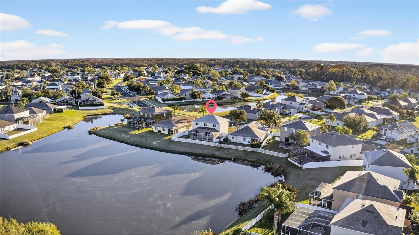 Bright, open, and impressively spacious, this 6-bedroom, 3.5-bath, 2-car garage waterfront home with bonus room offers 2,698 square feet of thoughtfully designed living space. Set on a picturesque waterfront lot, the move-in-ready home features a private PVC-fenced backyard and a free-form screened pool and lanai, creating the perfect setting for relaxation and entertaining. A covered portico welcomes you through an elegant oval glass front door with sidelight. Recent upgrades add peace of mind and value, including NEW hurricane-rated windows and a sliding glass door (October 2024), along with a NEW roof and gutters (March 2024), A/C (2024), LVP flooring and tile (2024) No carpet throughout, water heater, LED lighting, and all bathrooms remodeled (2024). The first-floor primary suite provides a private retreat with a large walk-in closet and a beautifully appointed en-suite bath featuring a soaking tub, tiled walk-in shower, and double vanity with undermount sinks. The completely remodeled kitchen (2024) is both stylish and functional, showcasing shaker-style 42-inch cabinetry, Quartz countertops, tile backsplash, stainless steel appliances, LED lighting, a peninsula counter-height breakfast bar, eating space in the kitchen, and a spacious double-door pantry. The adjacent family room opens to the outdoors through sliding glass doors, offering seamless indoor-outdoor living.